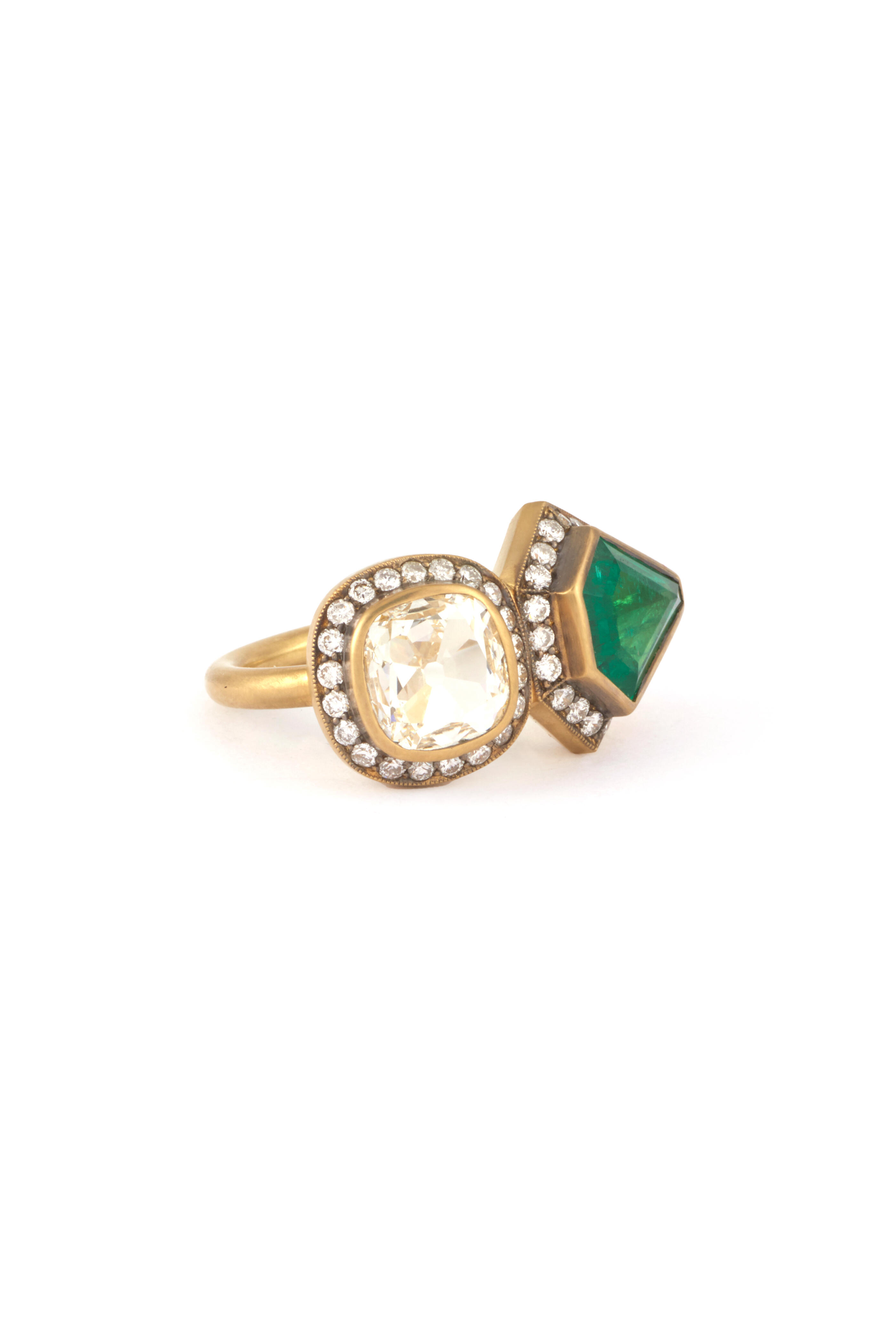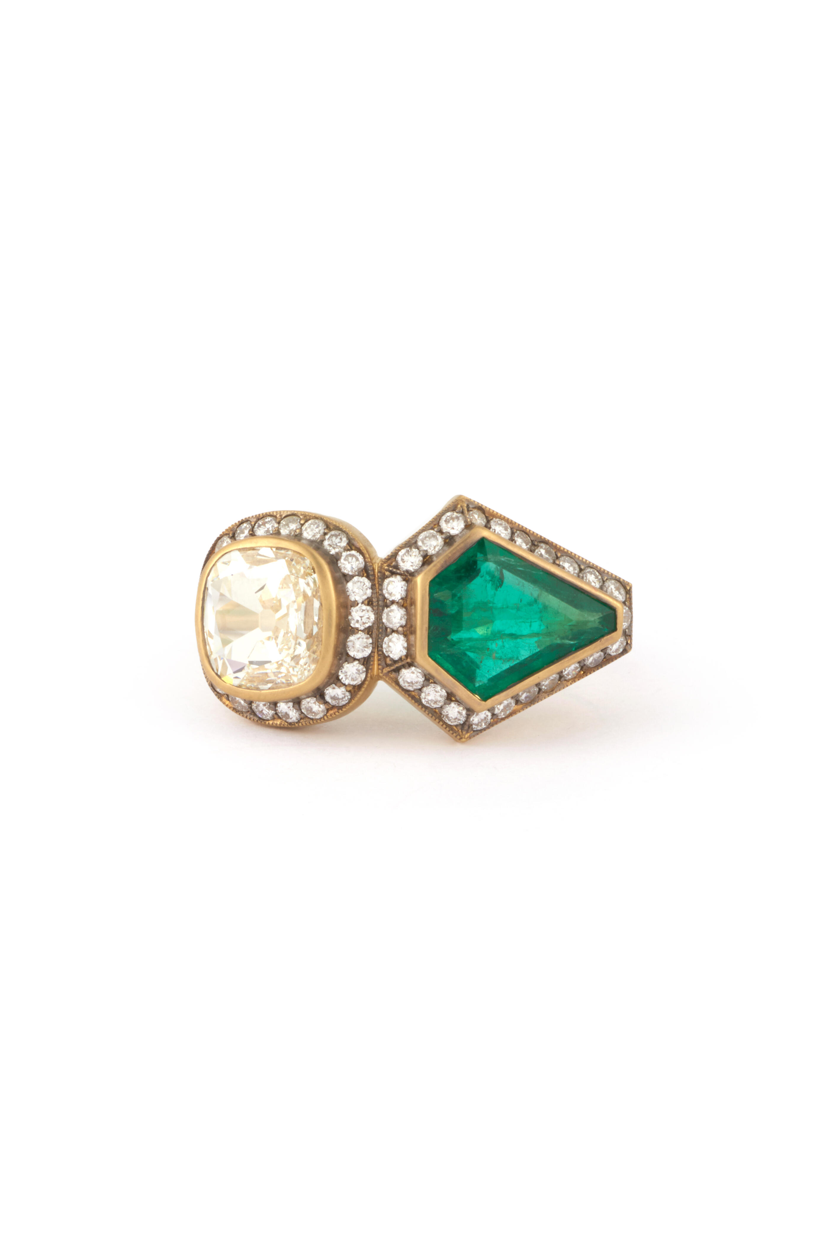 18k yellow gold. 2.42 carat Zambian emerlad. 2.00 carat old mine diamond.