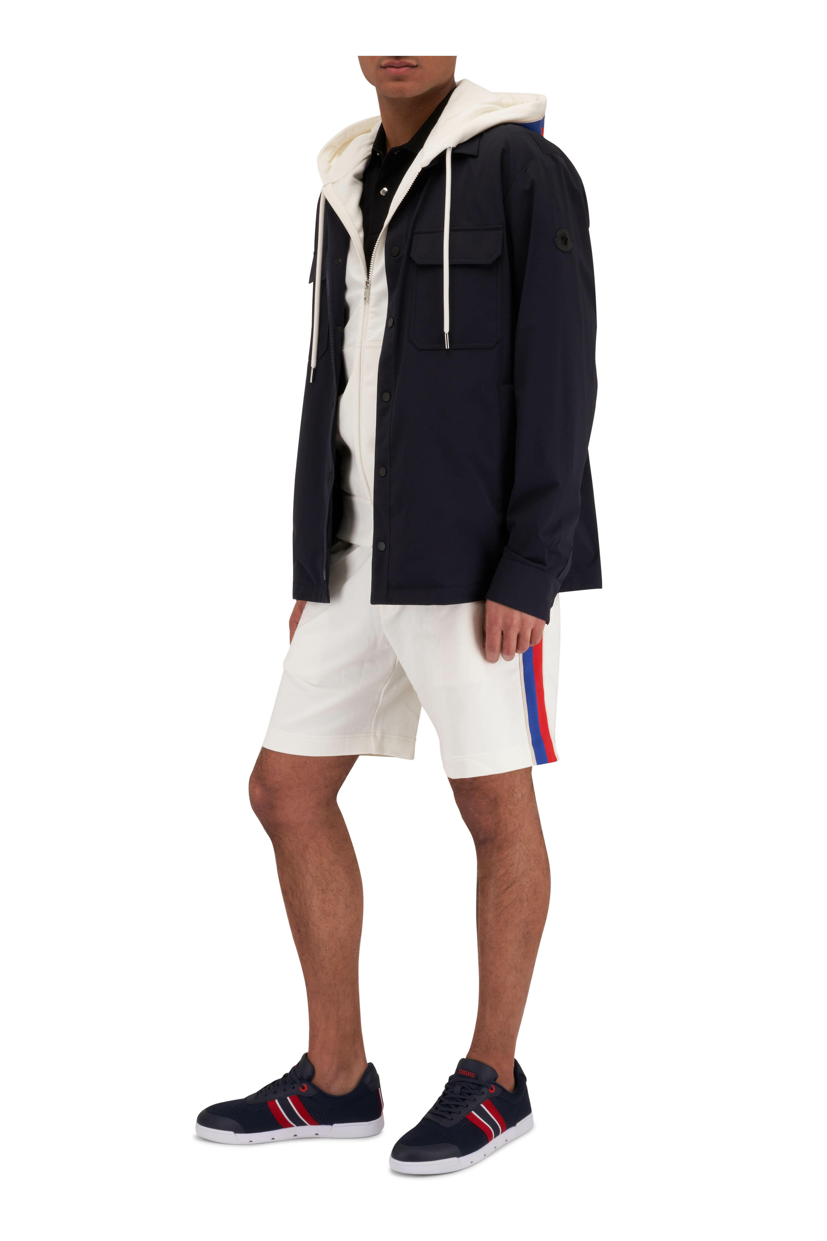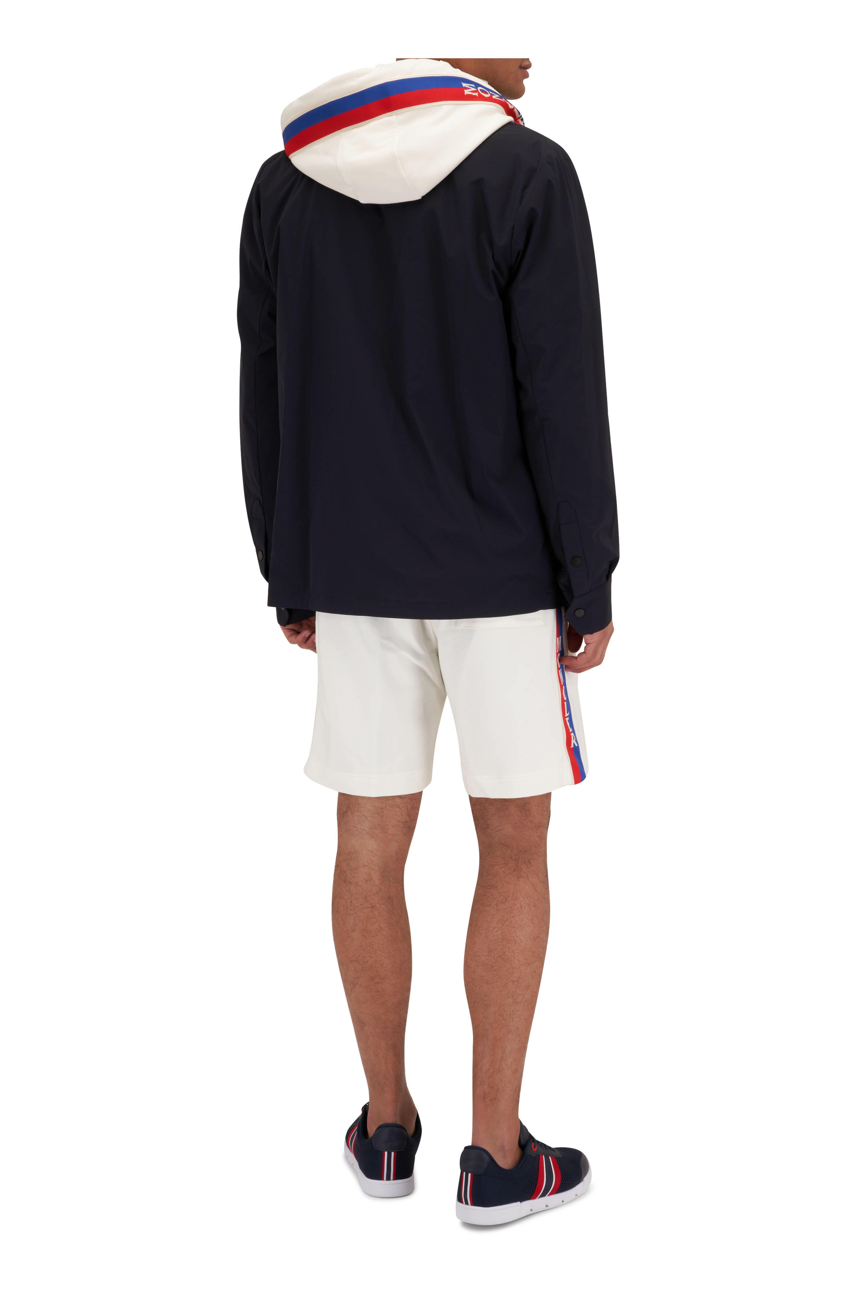 Spread collar. Two snap button placket. Banded cuffs. Chest logo detail. Contrast striped on sleeves. Vented hem. Imported. 100% cotton. Machine wash.