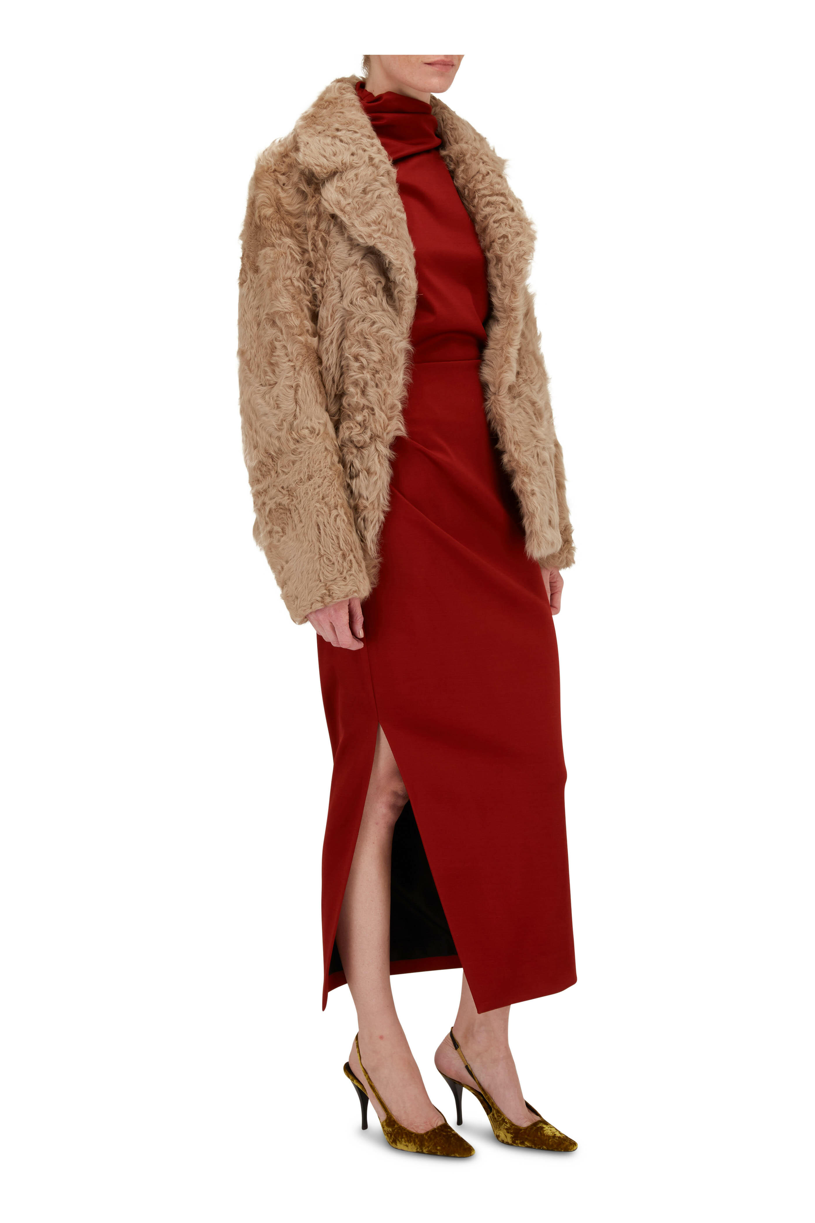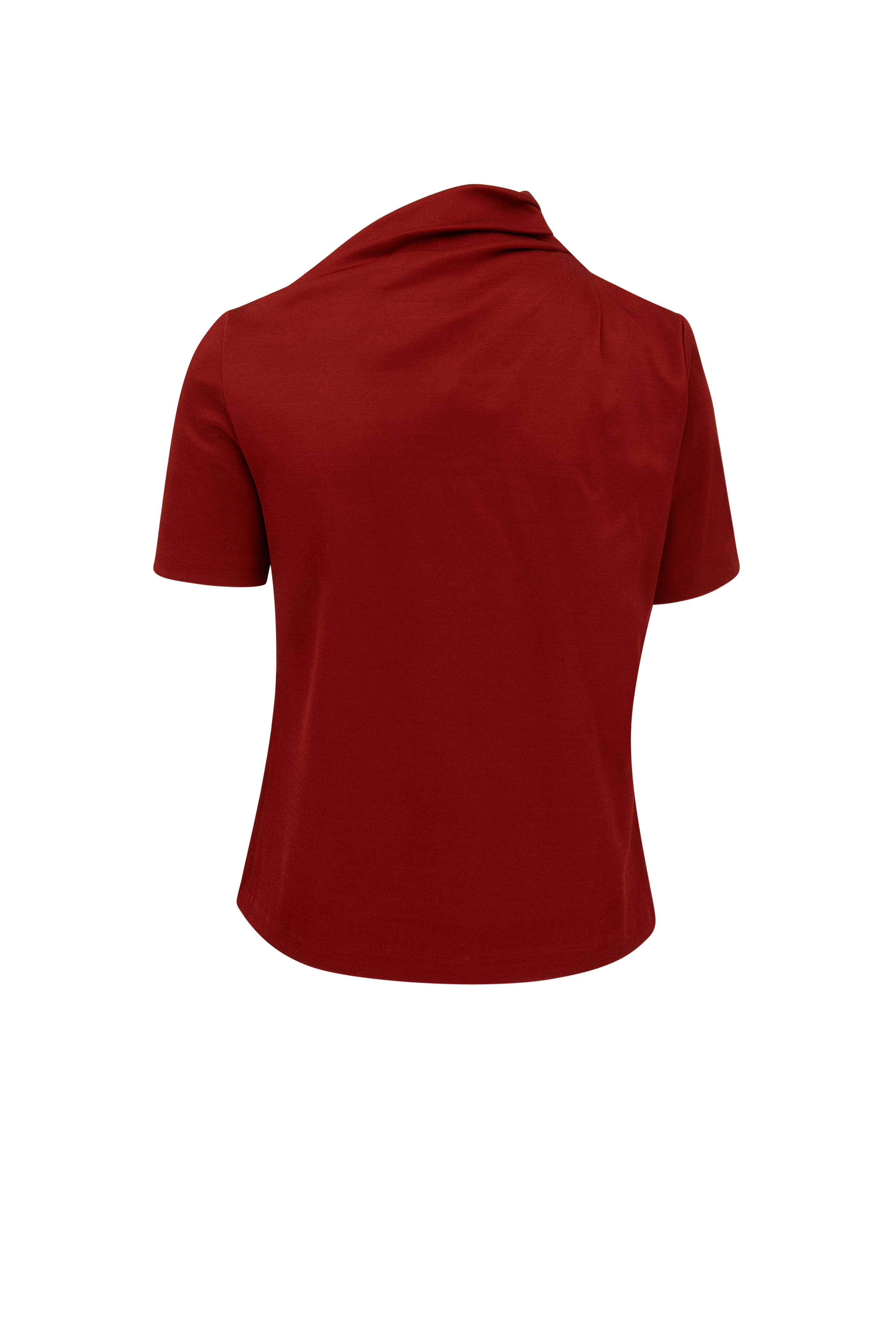 Pleated high neckline. Slip on style. Made in the USA. 67% viscose, 21% polyamide, 12% elastane. Dry clean.
