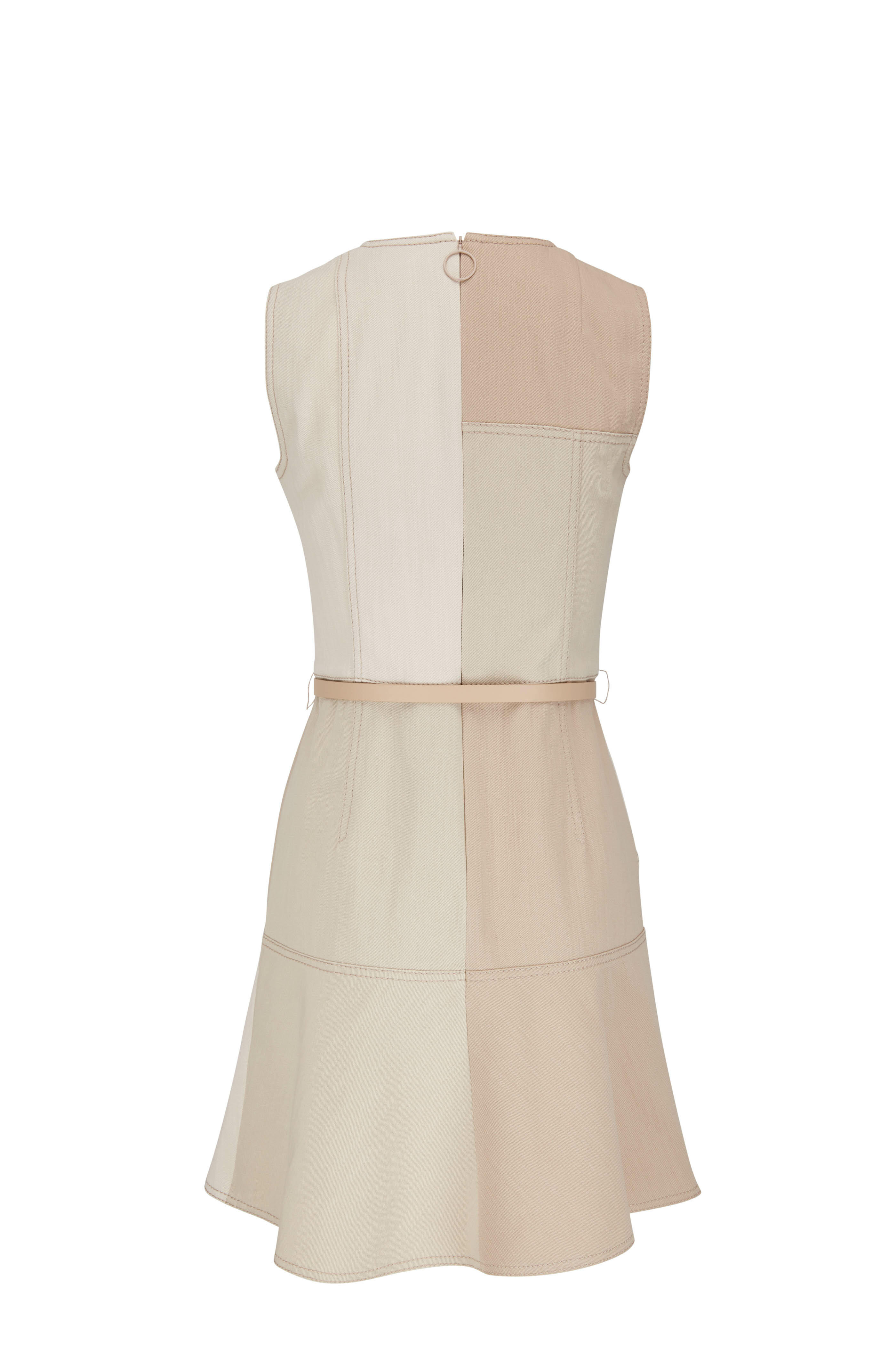 Round neckline. Concealed back zip. Removable leather belt. Imported. 36" shoulder to hem. 98% cotton, 2% elastane. Dry clean.