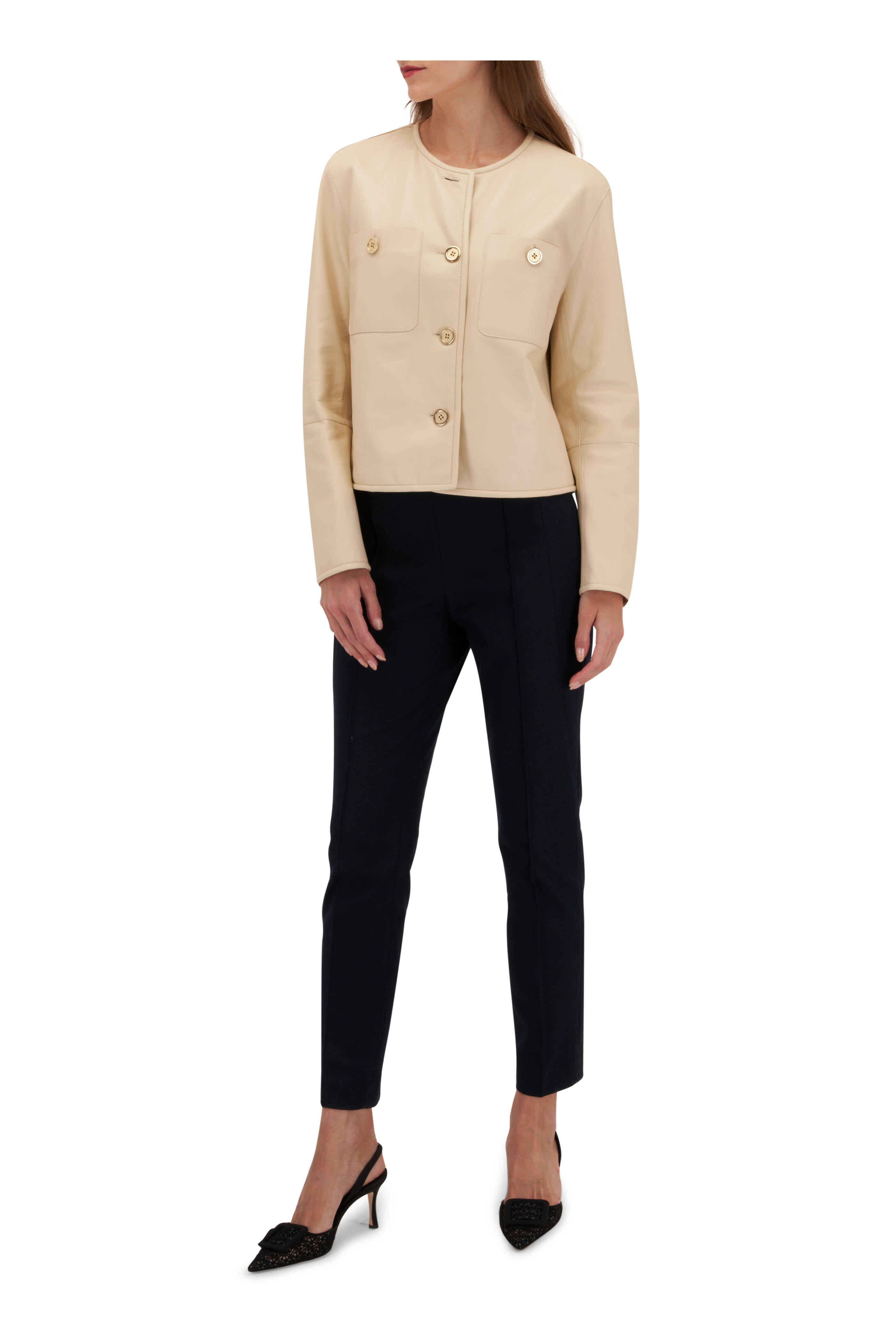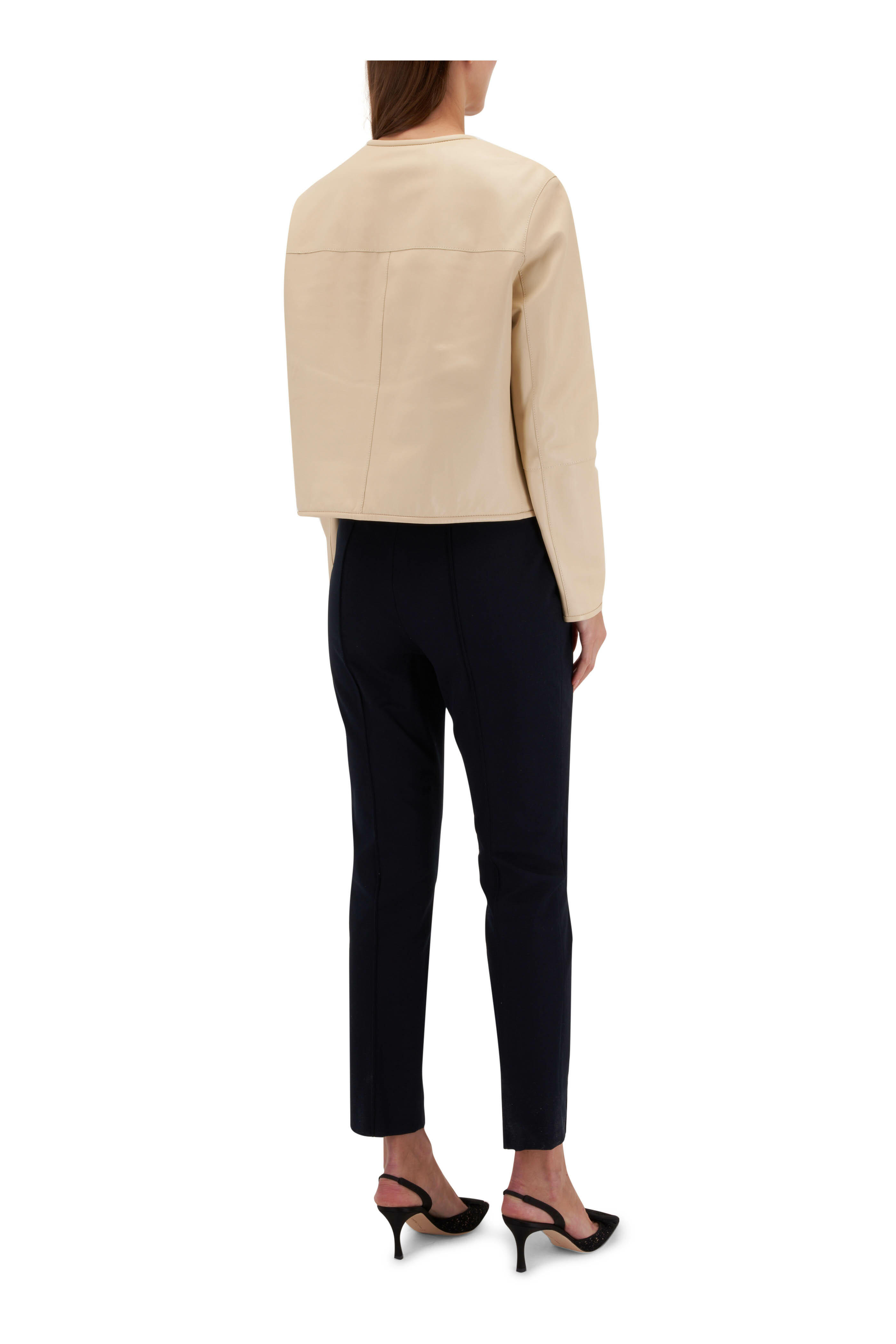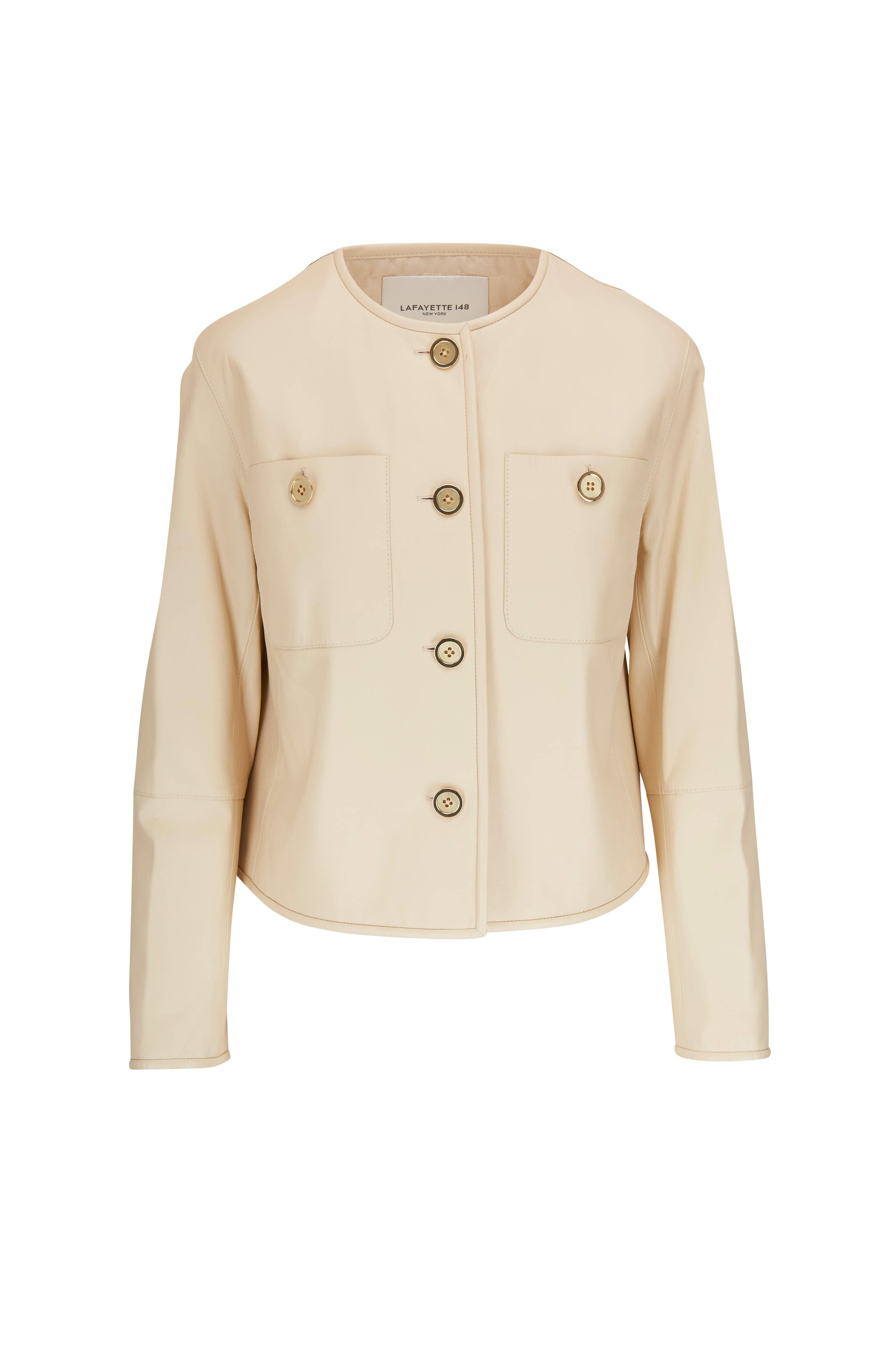 Lambskin leather. Specialist clean. Jewel neckline. Front button placket. Chest button patch pockets. French piping detail. Imported. 21" shoulder to hem.