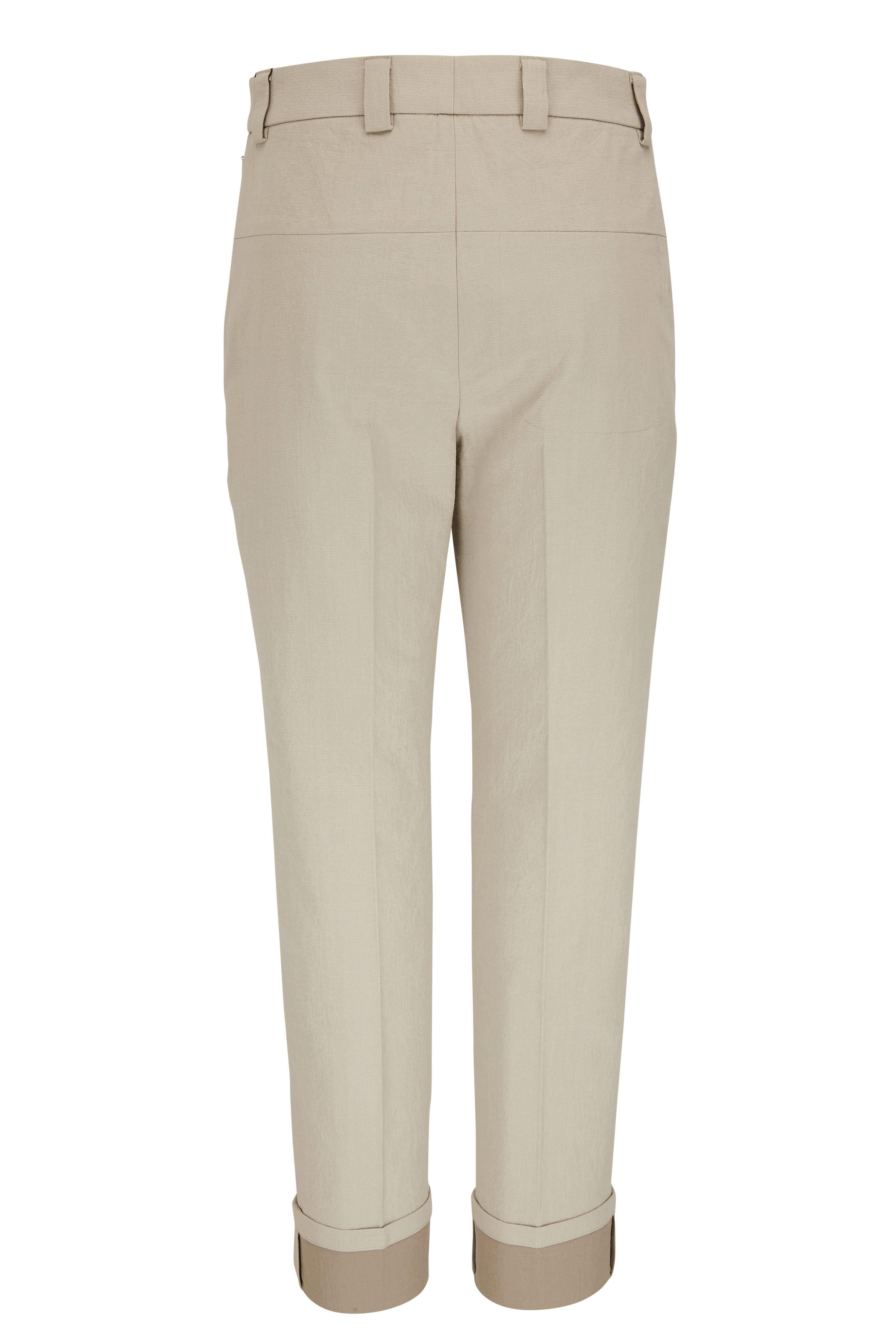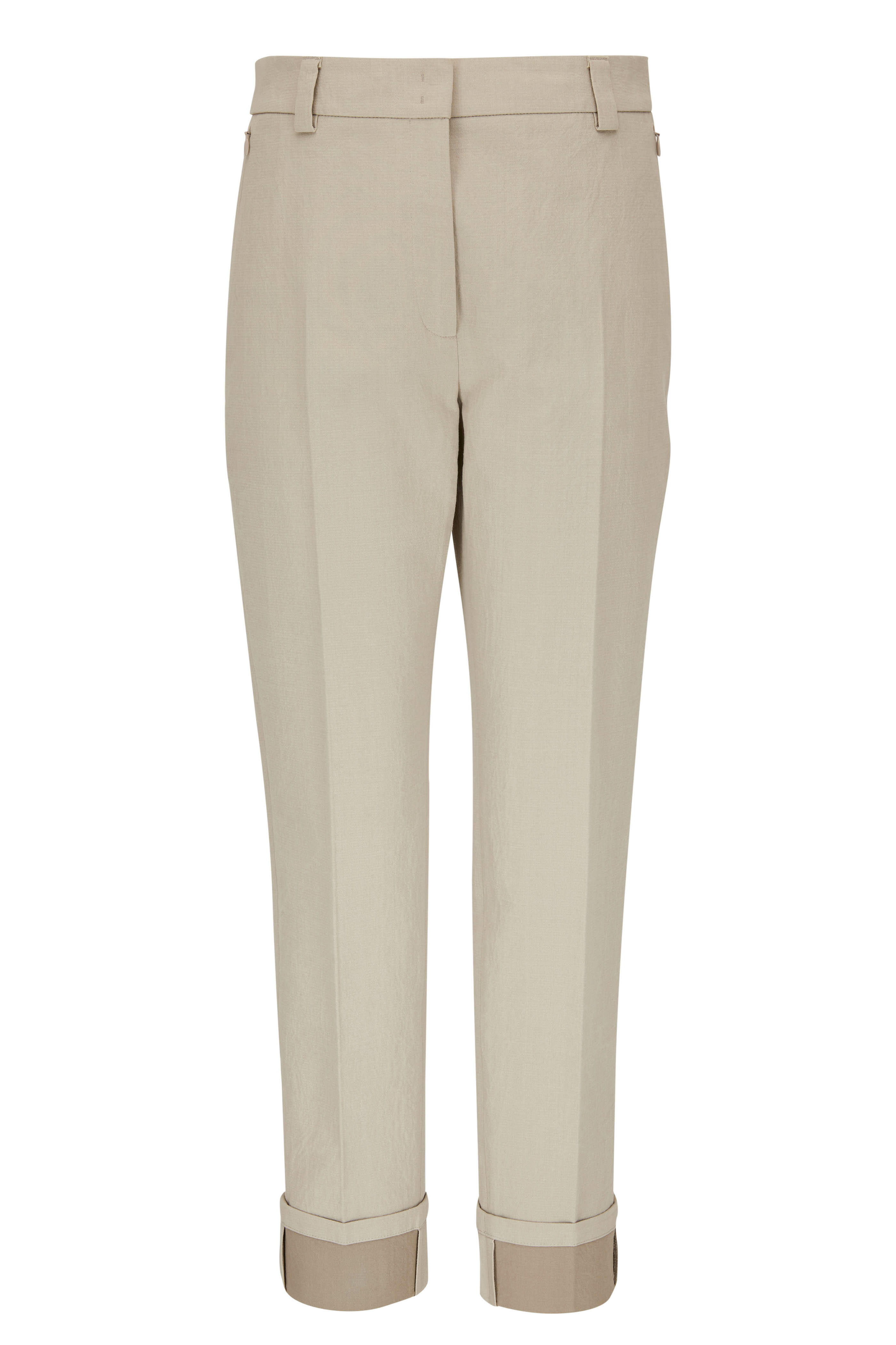 Banded waist; belt loops. Front zip; hook and bar closure. Front concealed zip pockets. Folded cuffs. Imported with Italian fabric. Color: Salvia. 27.5" inseam. 99% cotton, 1% silk; Lining: 100% cupro. Dry clean.