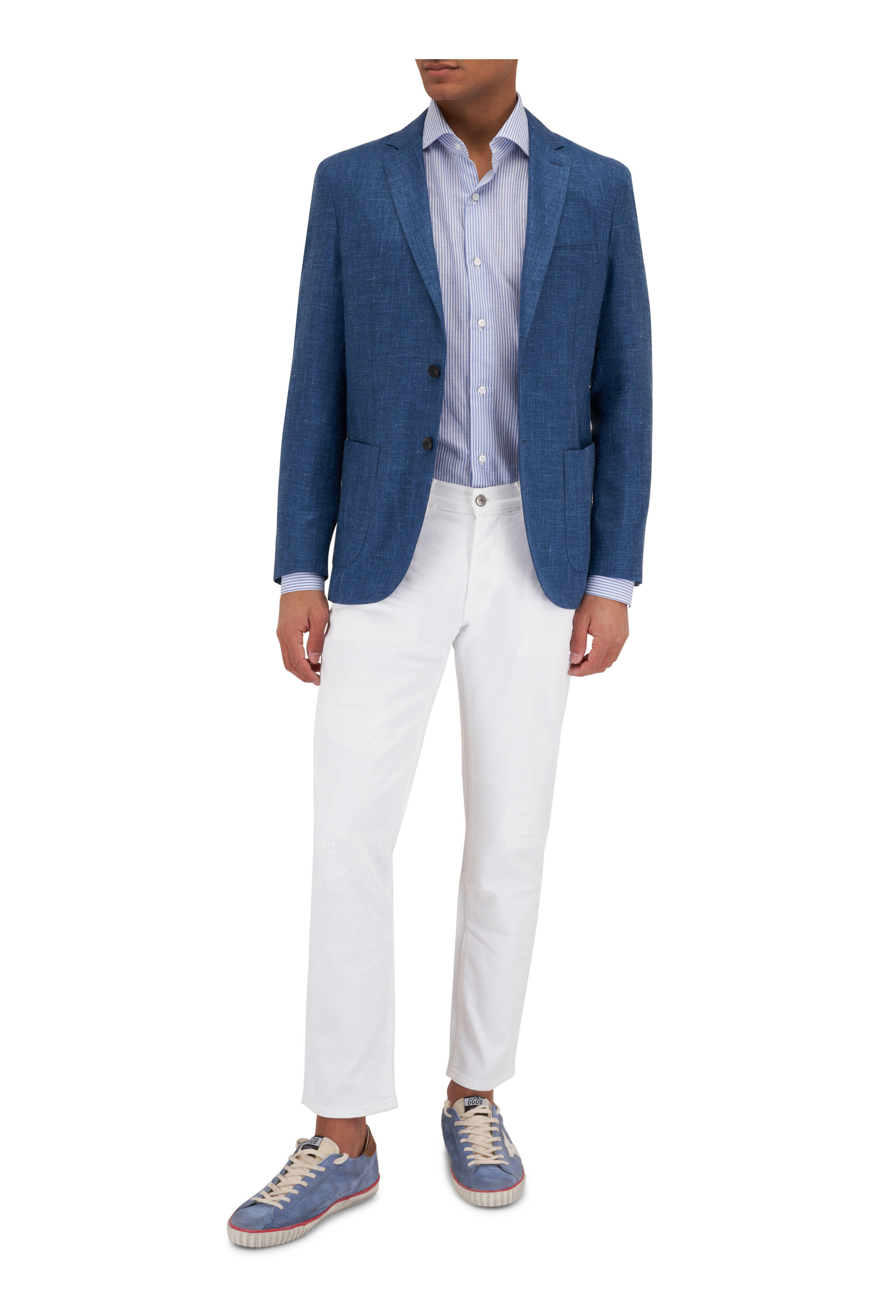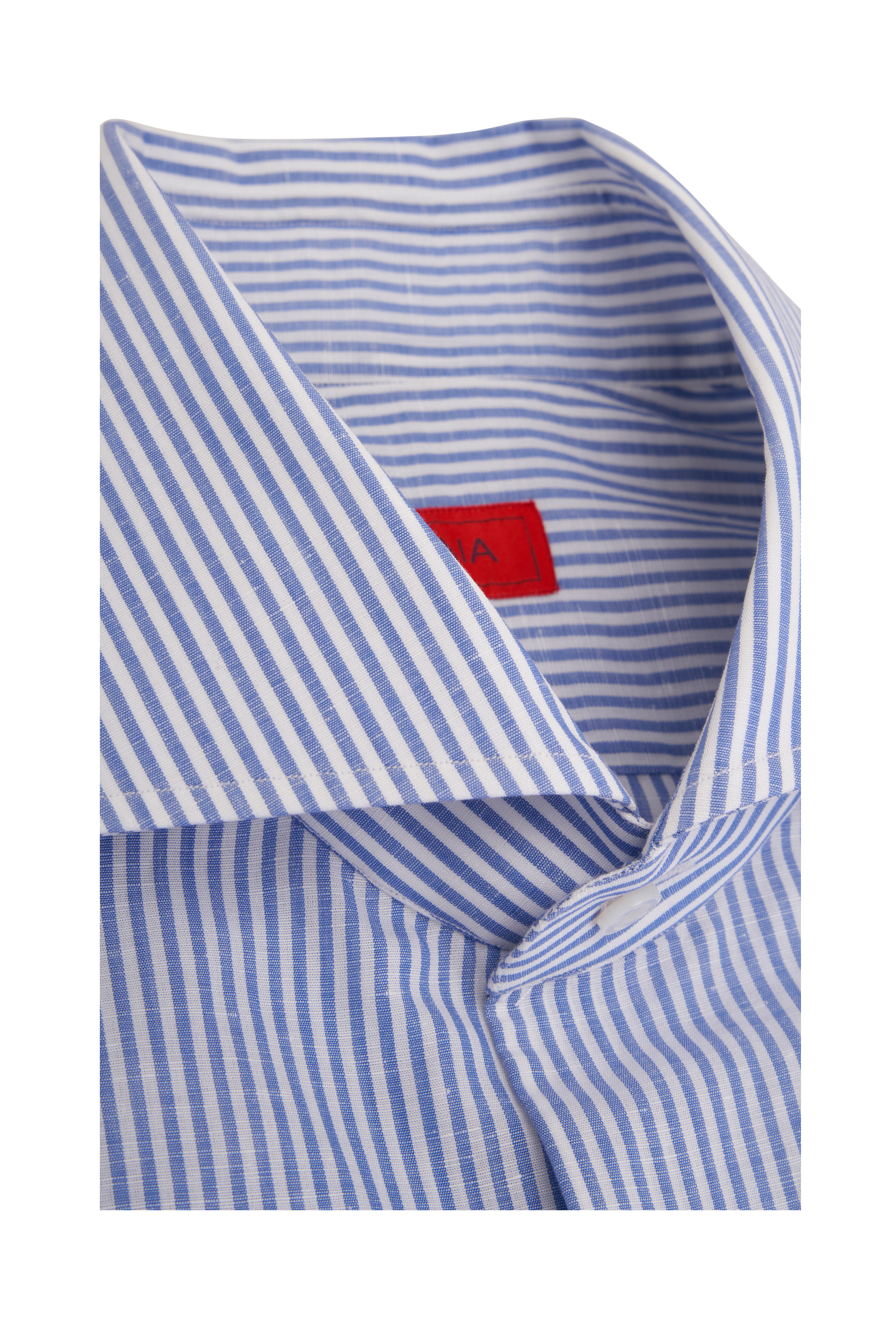 Spread collar. French placket. Single button mitered cuffs. Made in Italy. 52% cotton, 48% linen.