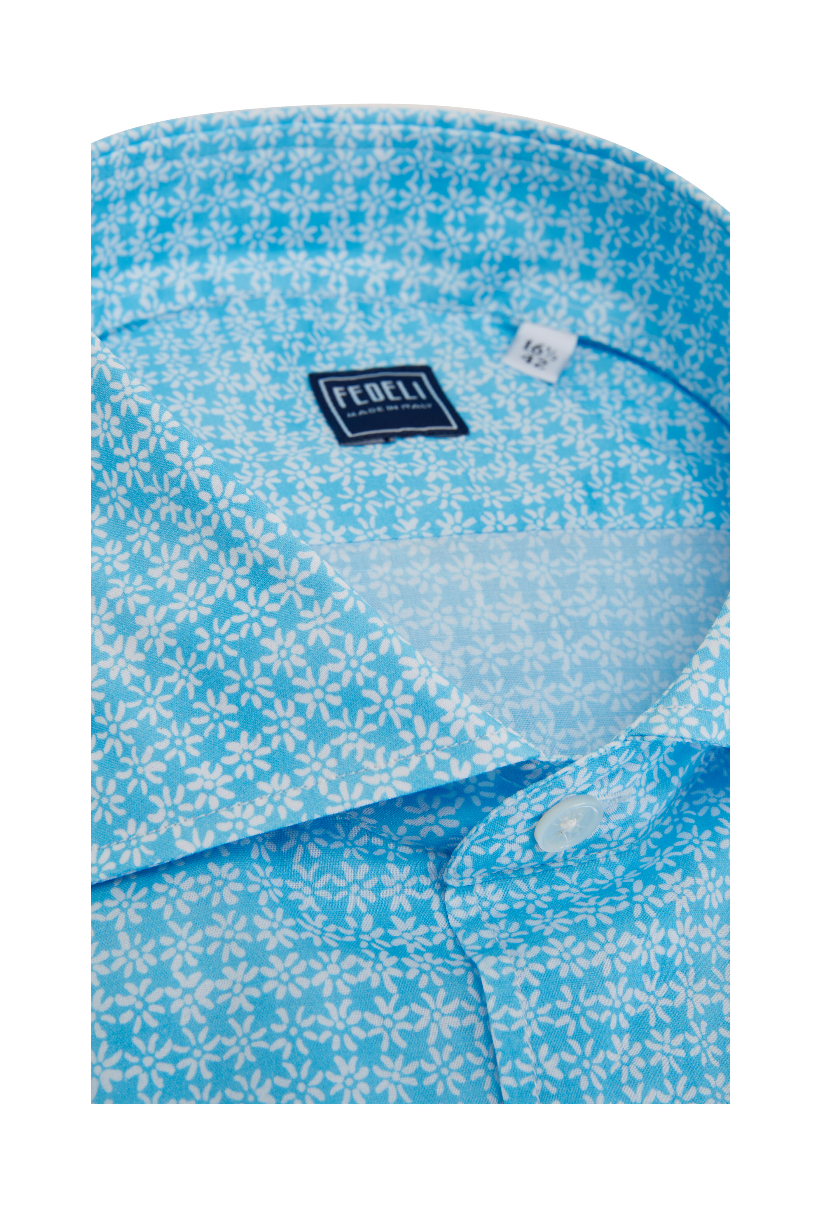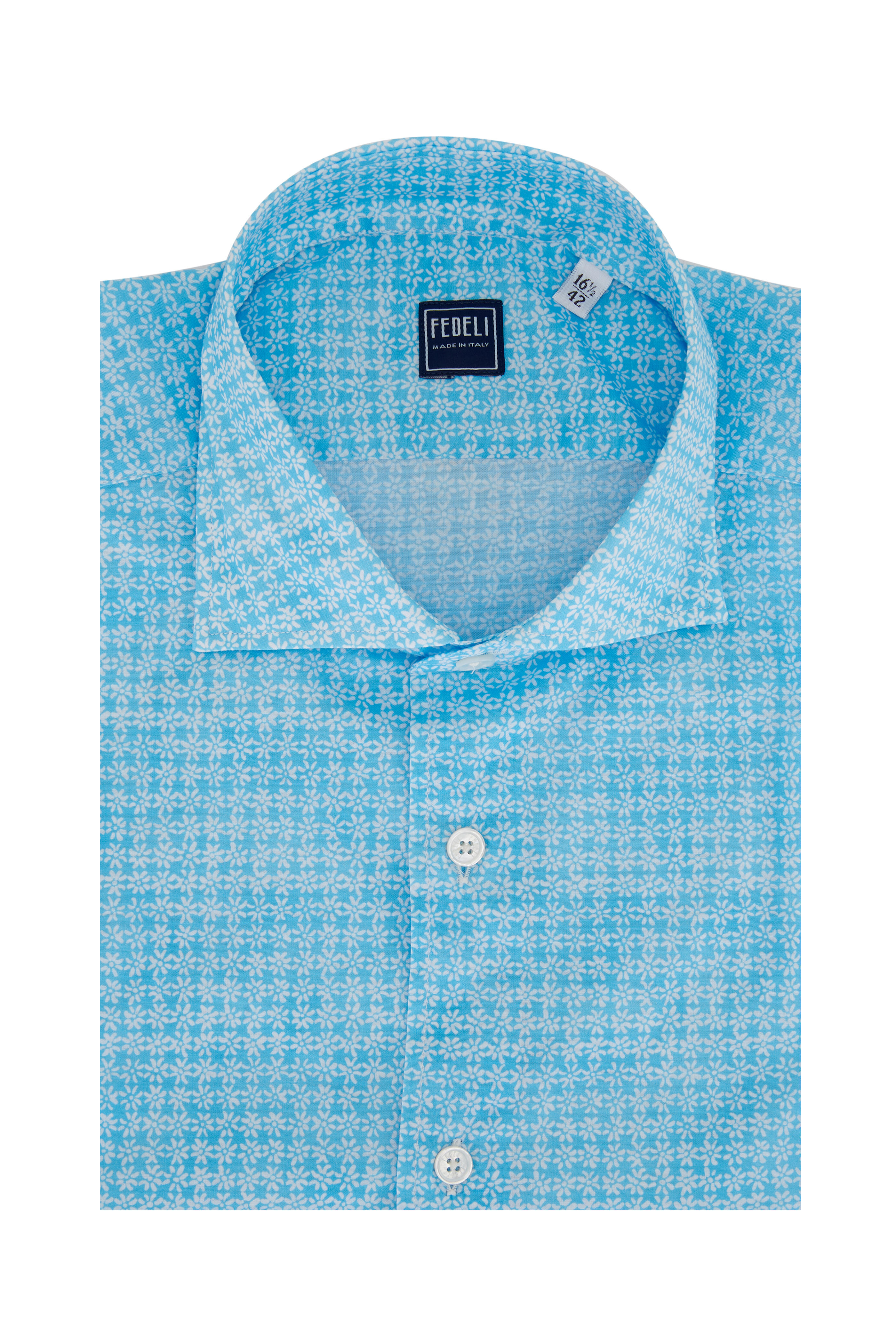 Spread collar. French placket. Short sleeves. Made in Italy. 95% cotton, 5% elastane. Machine wash.