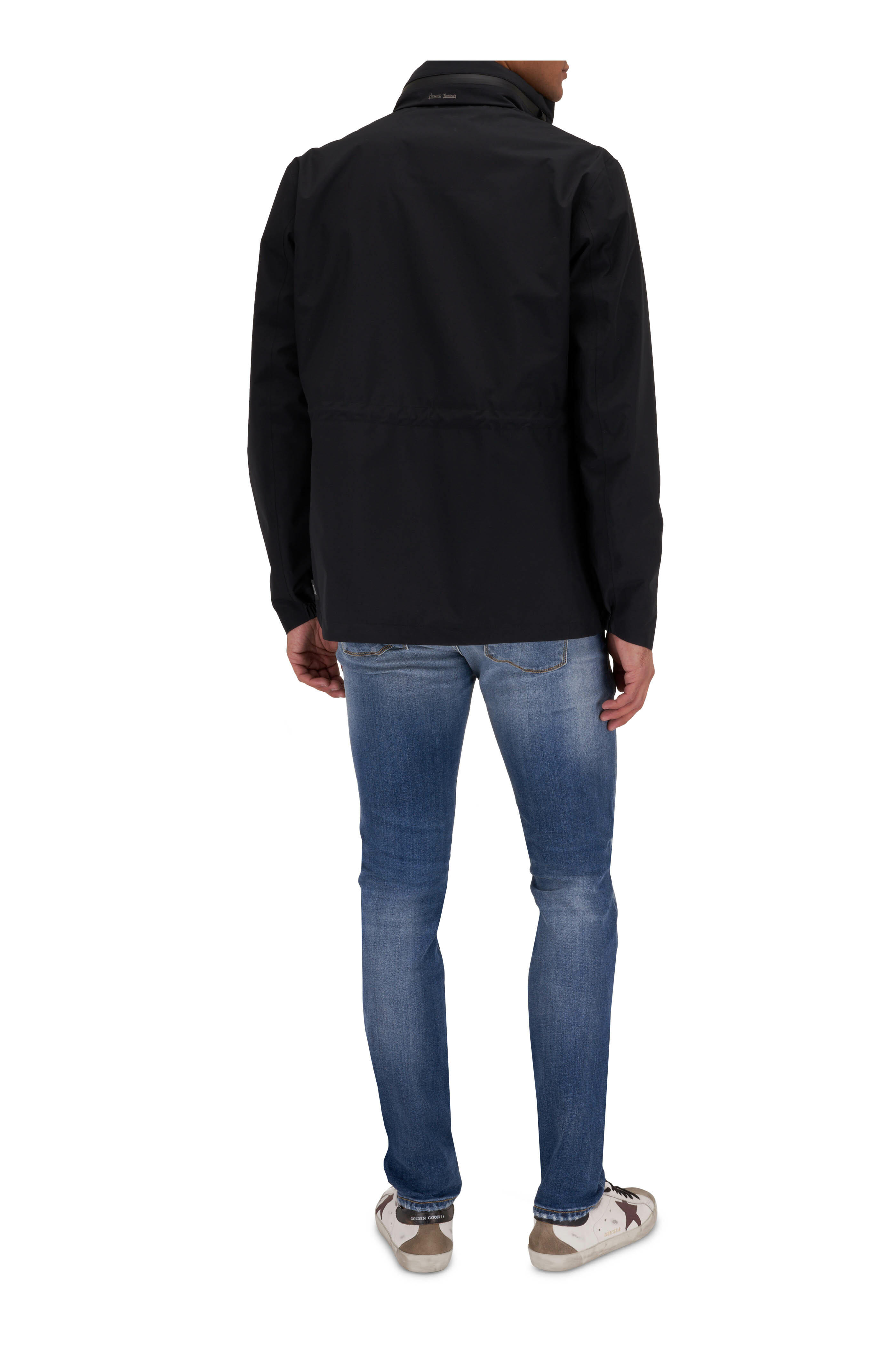 Stand collar with stowaway hood. Two-way front zip; front snap button placket. Elasticized cuffs. Lower flap patch pockets; chest flap and zip pockets; interior slip pocket. Interior drawstring at the waist. Imported. 100% polyester; fully lined. Hand wash.