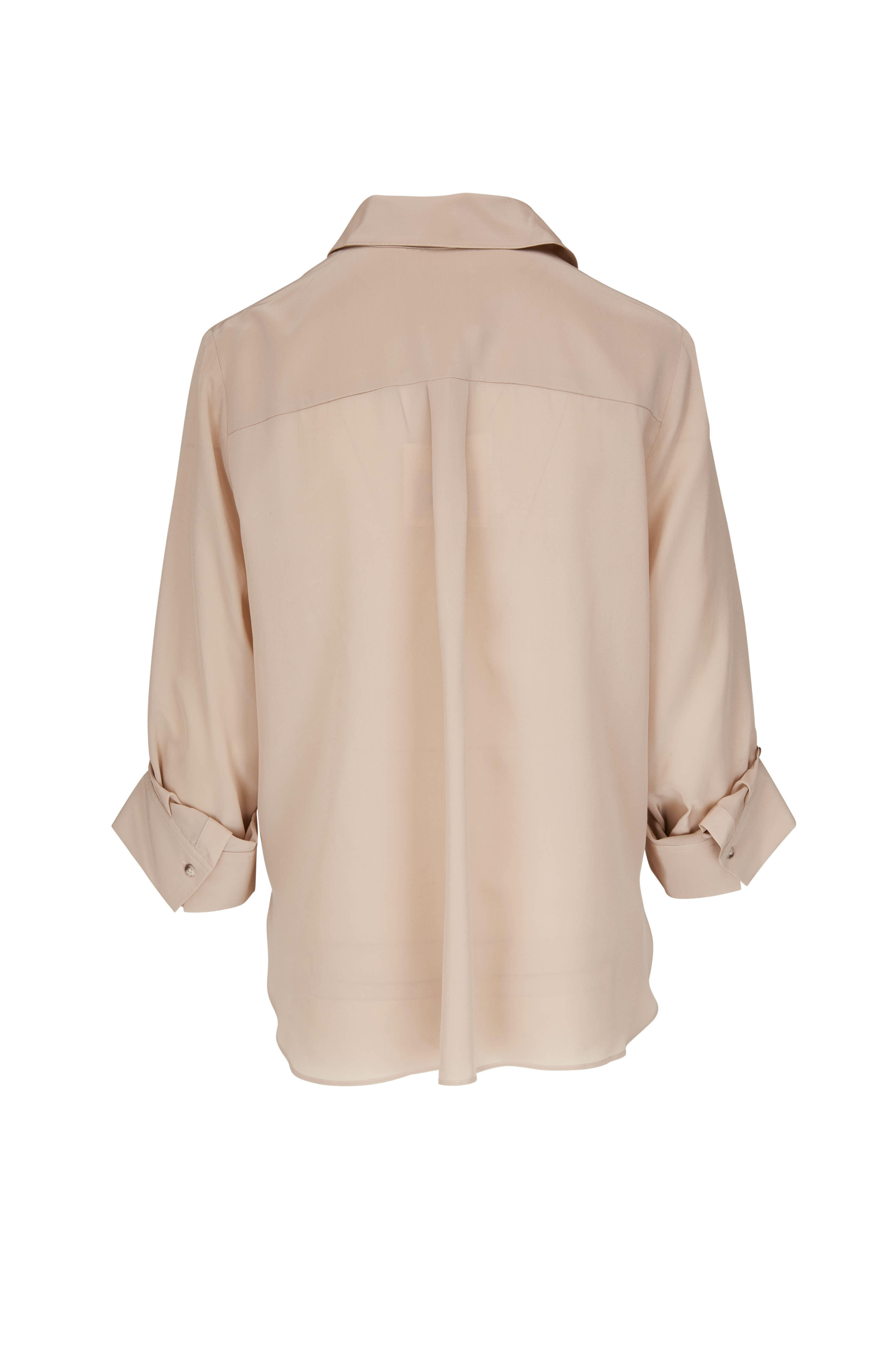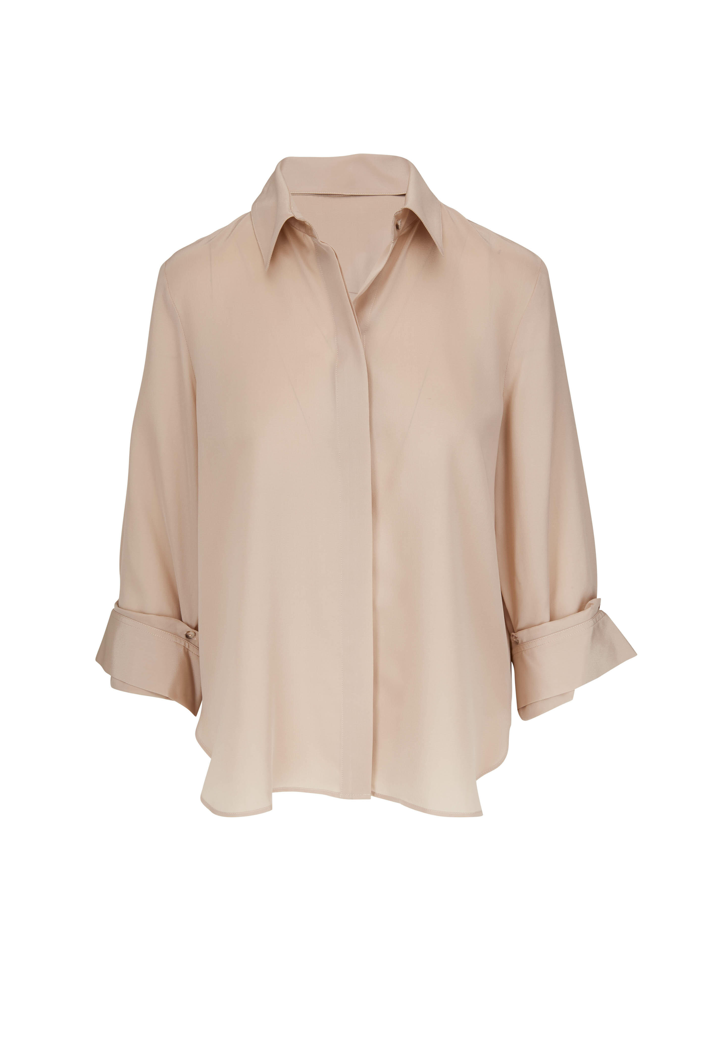 Spread collar. Concealed button placket. Adjustable button squared cuffs. Made in the USA. 100% silk. Dry clean.