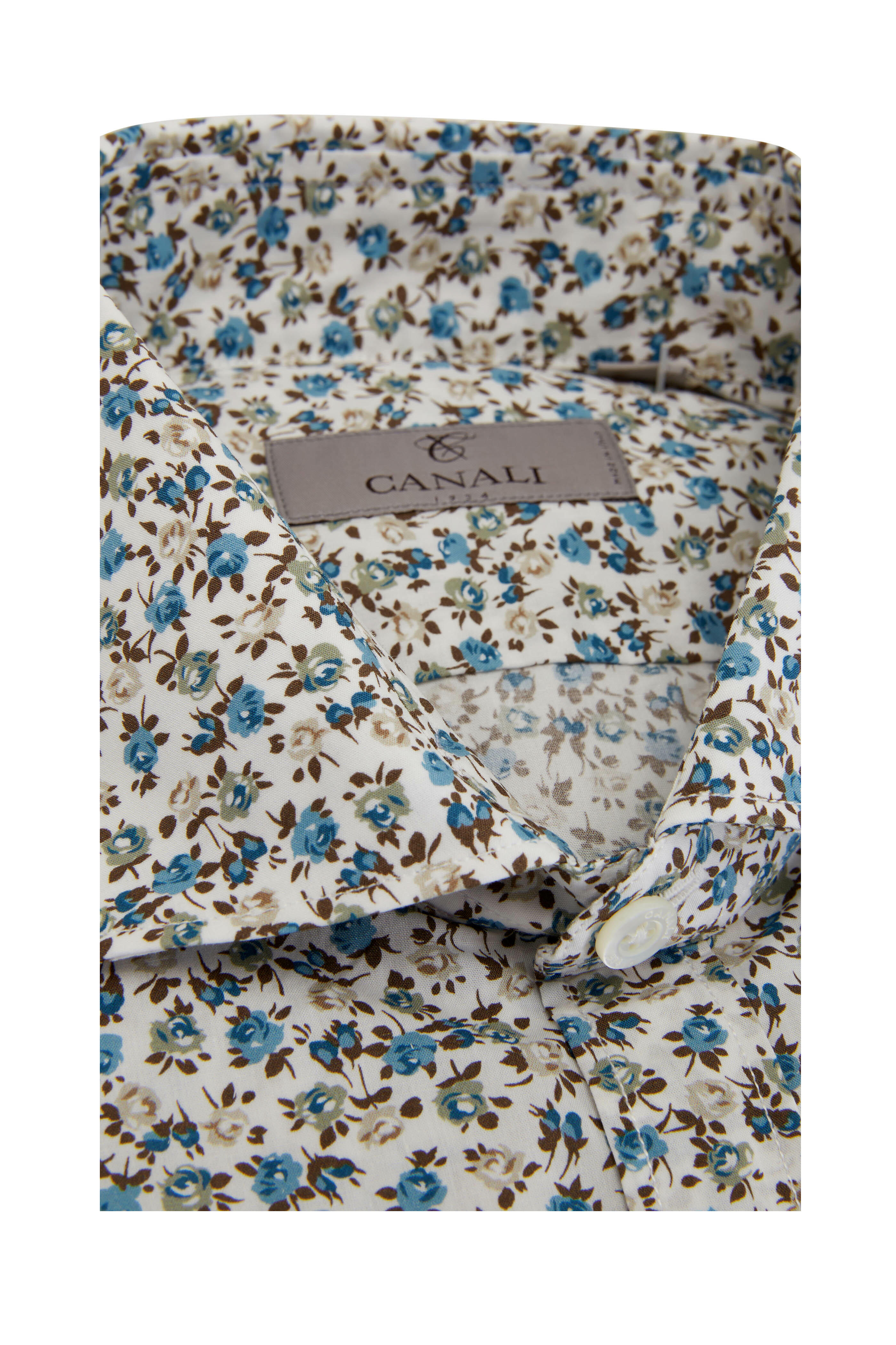 Spread collar. Button down placket. Single button cuffs. Made in Italy. 100% cotton. Dry clean.