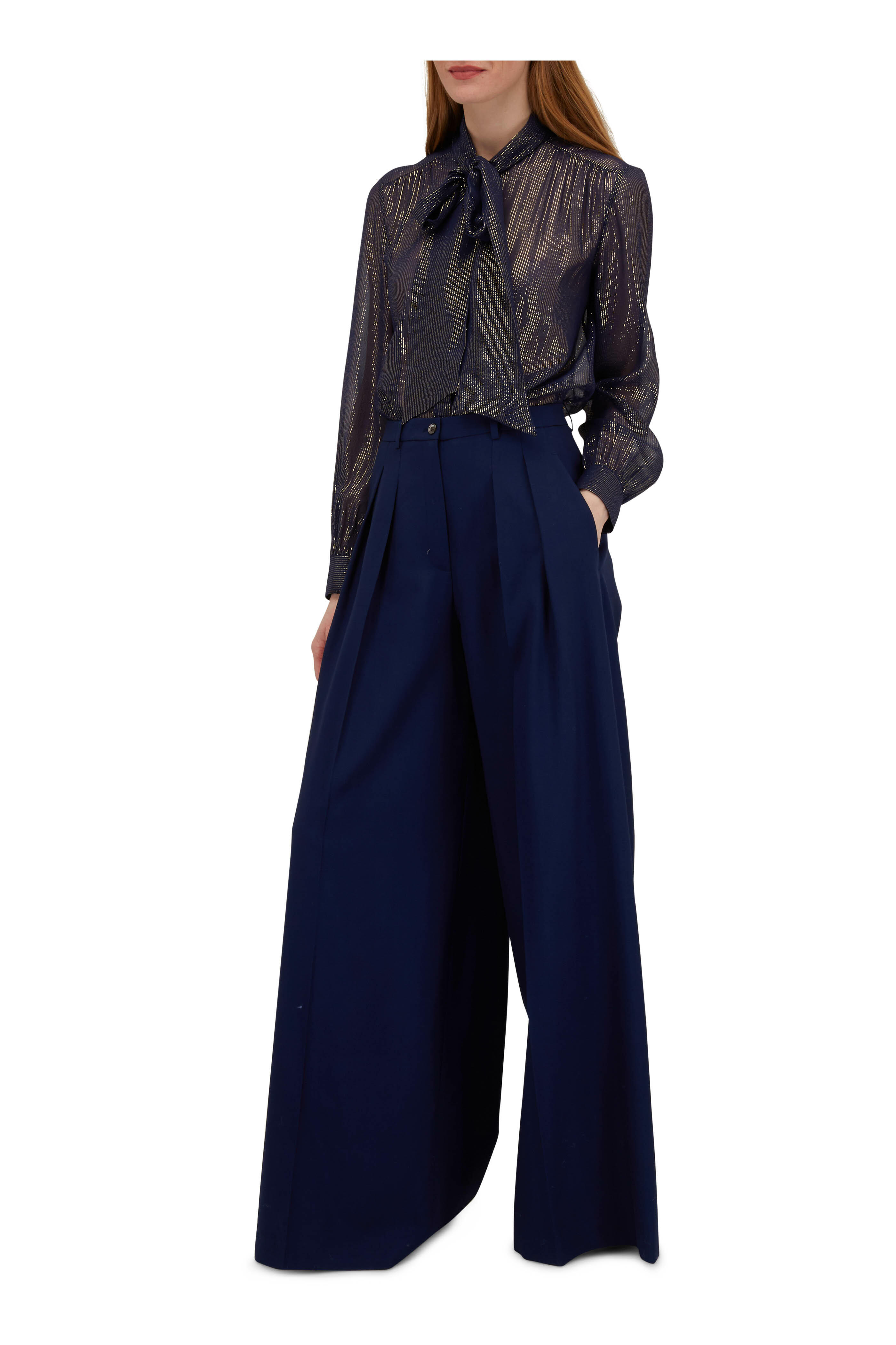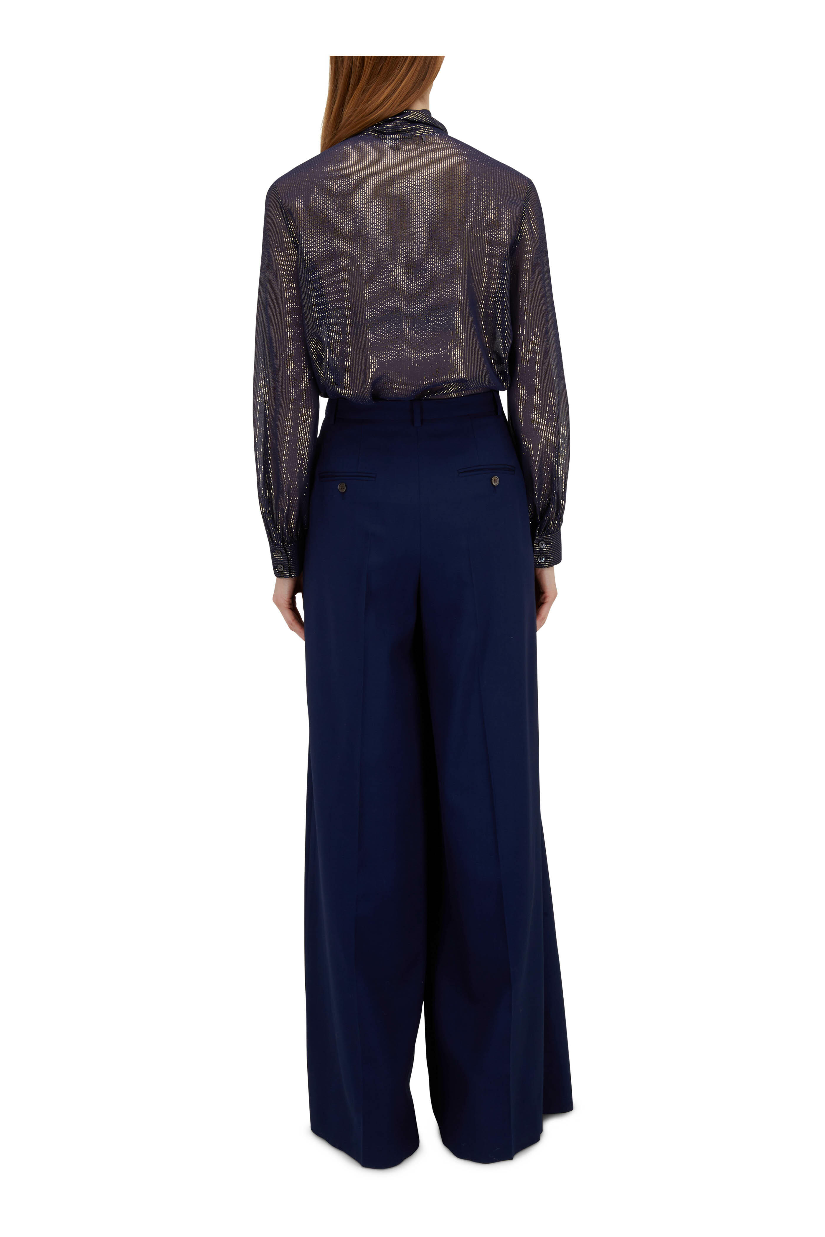 Necktie sash detailing. Concealed front button placket. Double button square cuffs. Straight hem. Made in Italy. 27" shoulder to hem. 93% silk, 7% metallized polyester. Dry clean.