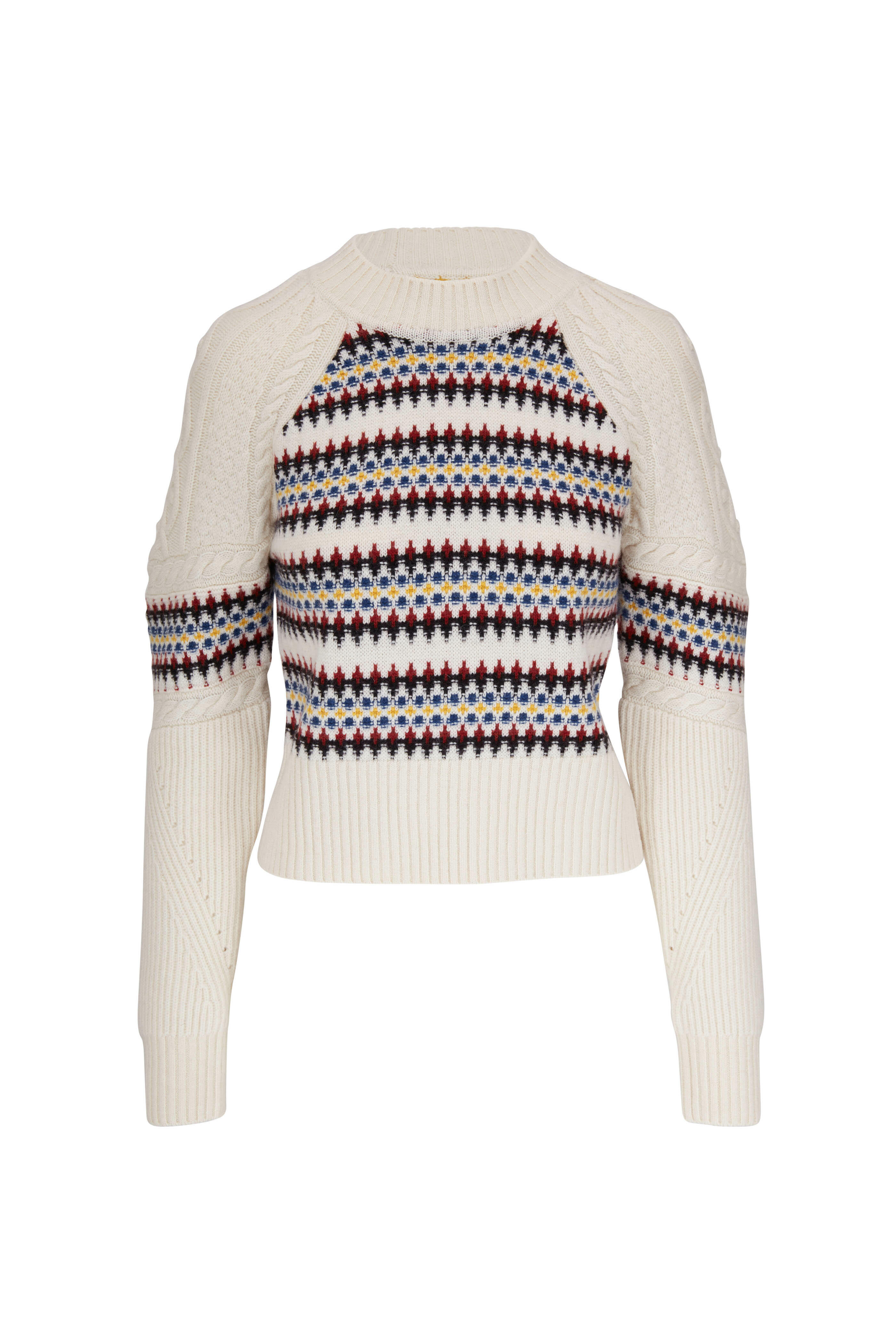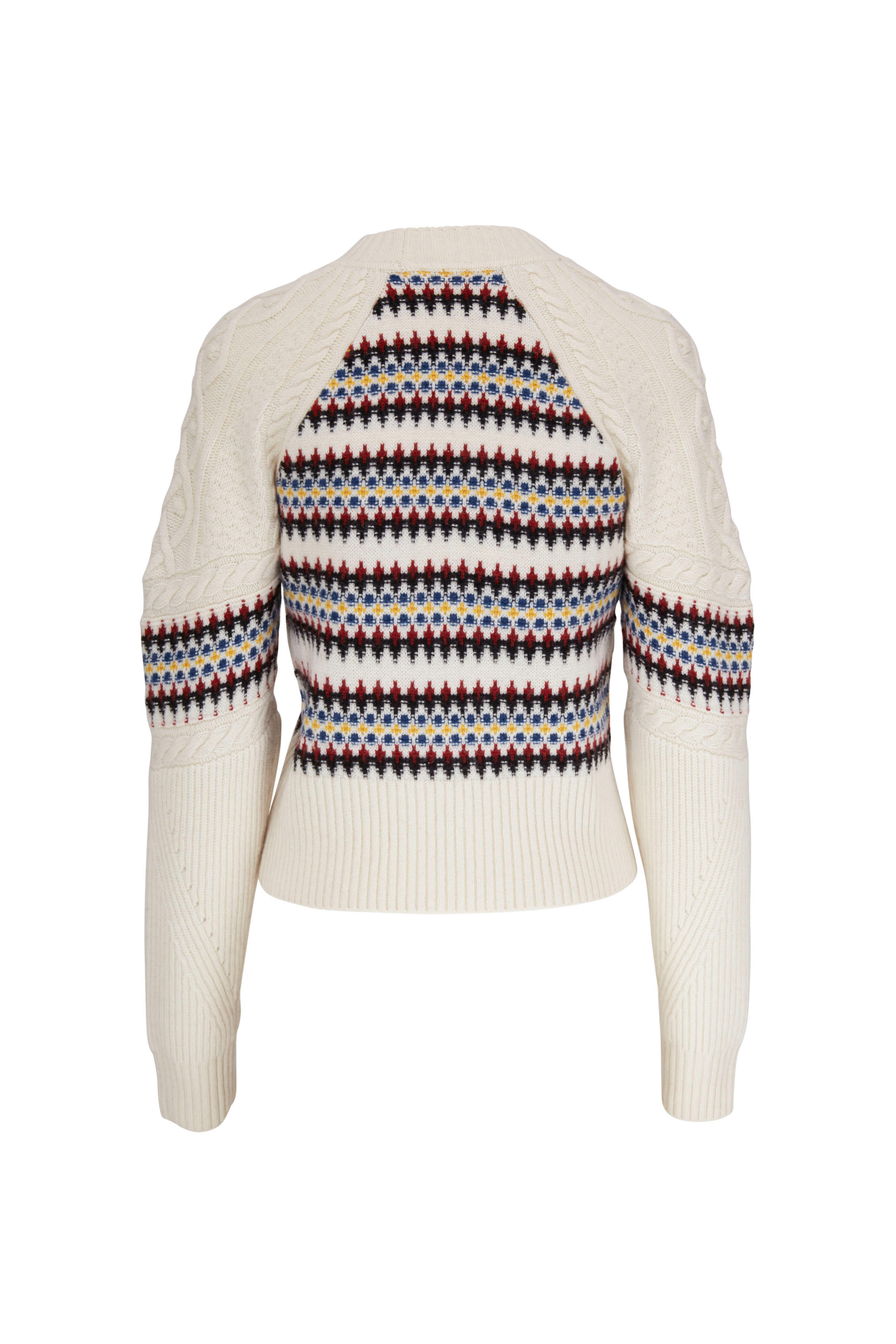 Crewneck. Raglan sleeves. Imported. Slightly cropped. Sleeve length 31 1/2". Length 20 1/2". 100% extrafine merino wool. Dry clean.