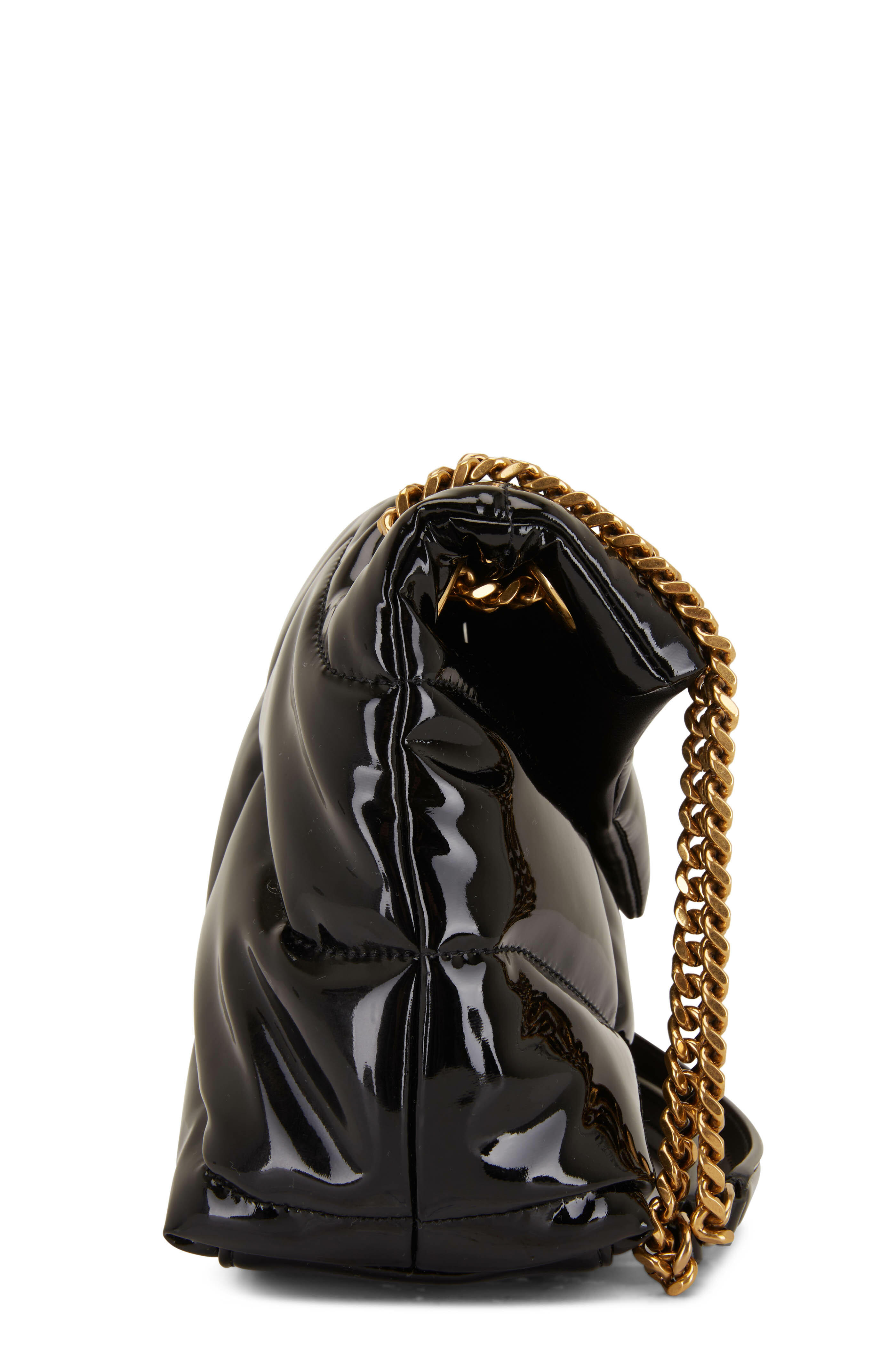 Vinyl and metal. Sliding chain strap. Flap top; magnetic snap closure. Interior zip pocket. One main compartment. Bronze-toned metal hardware. Tri-color YSL Cassandre logo. Cotton lining. Made in Italy. Width: 12". Height: 7". Depth: 4". Single strap drop: 20". Double handle drop: 10".