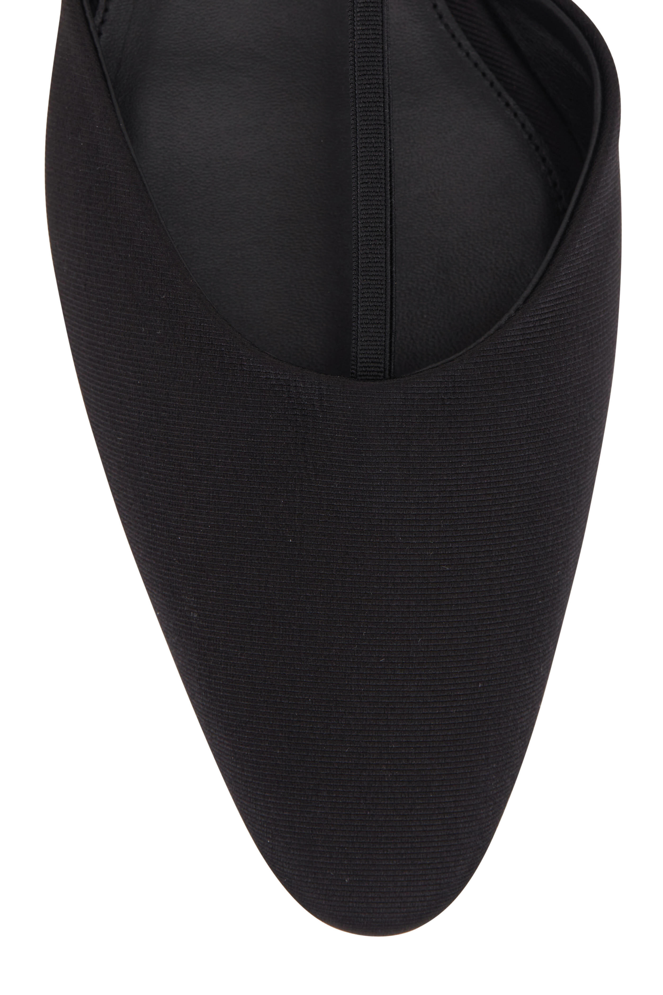 Silk grosgrain upper. Tapered toe. Slip on style. T shape elasticated straps. Leather sole. Made in Italy.