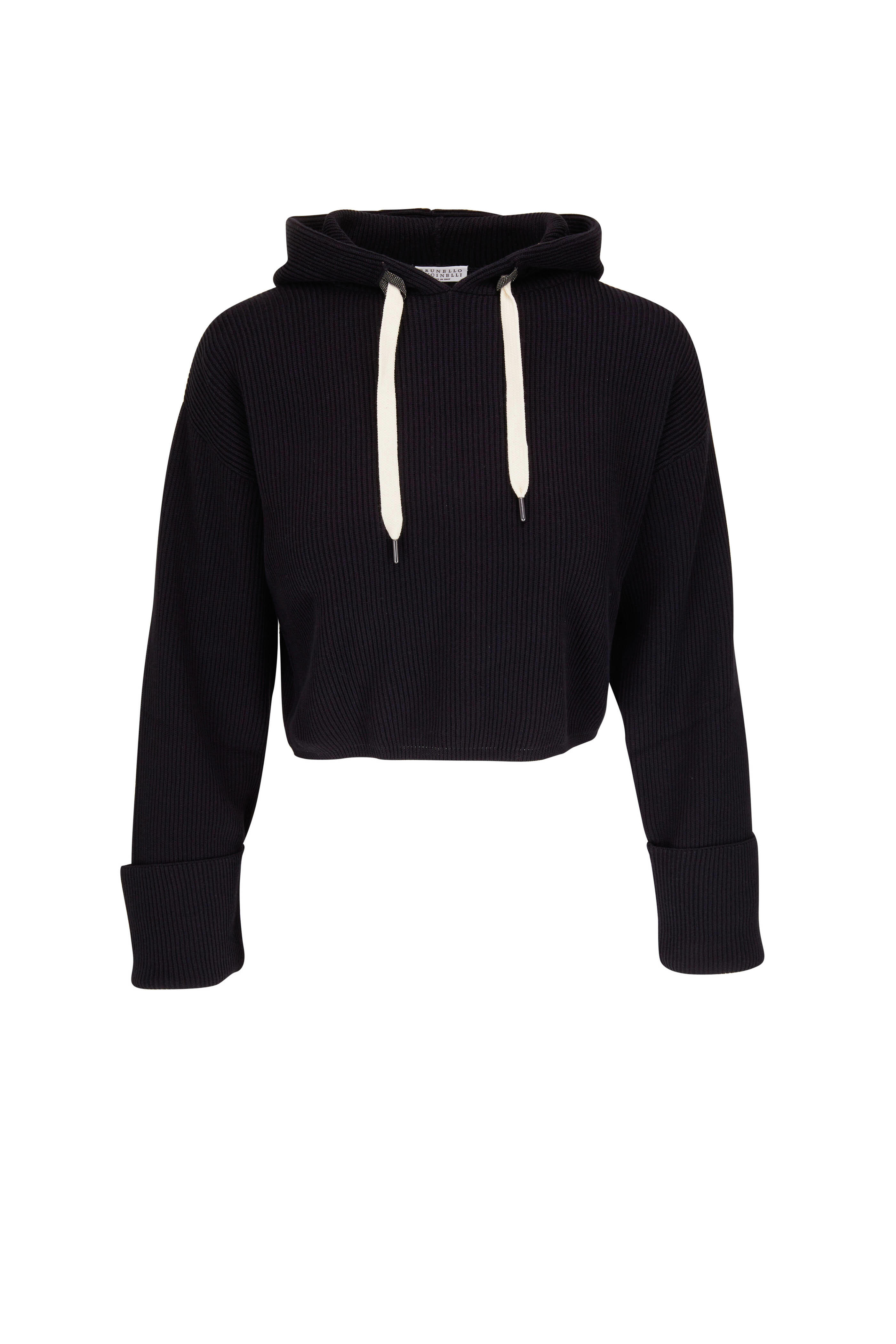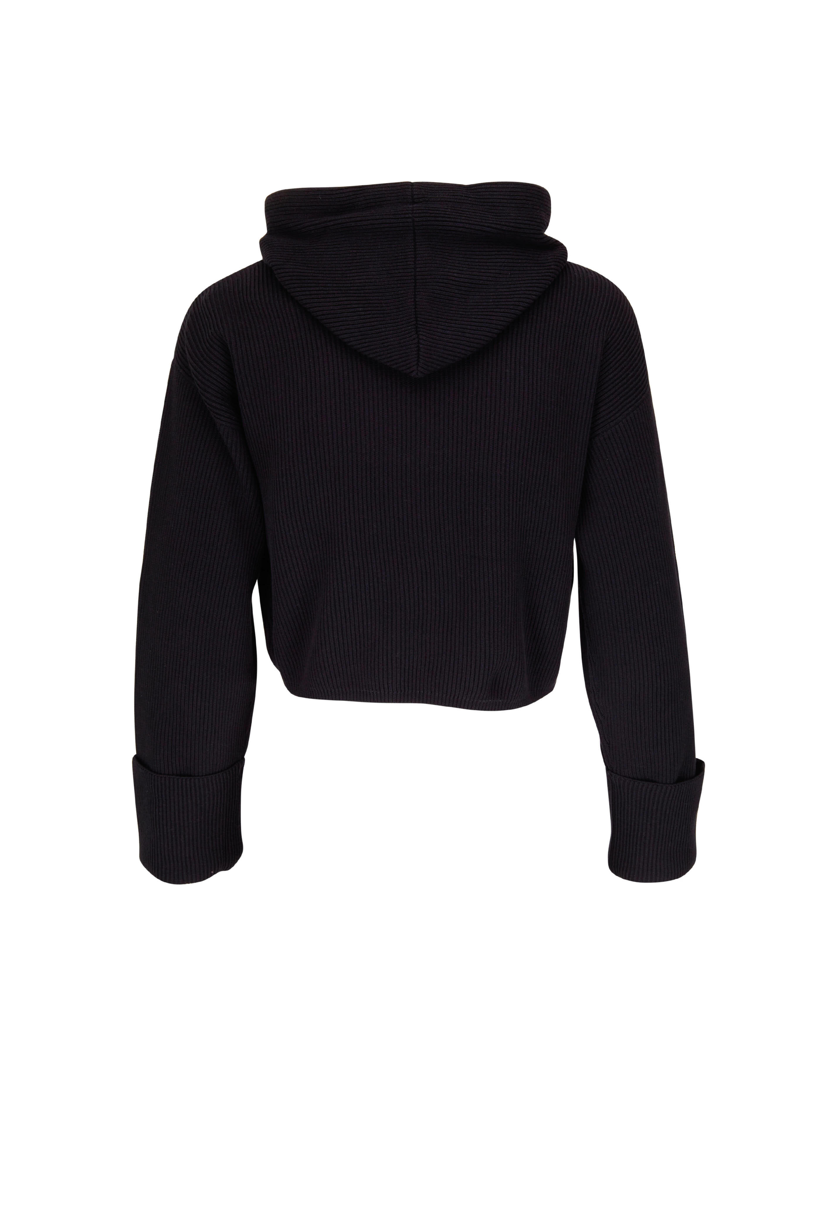 Attached drawstring hood. Cuffed sleeves. Made in Italy. Cropped. 100% cotton. Dry clean.