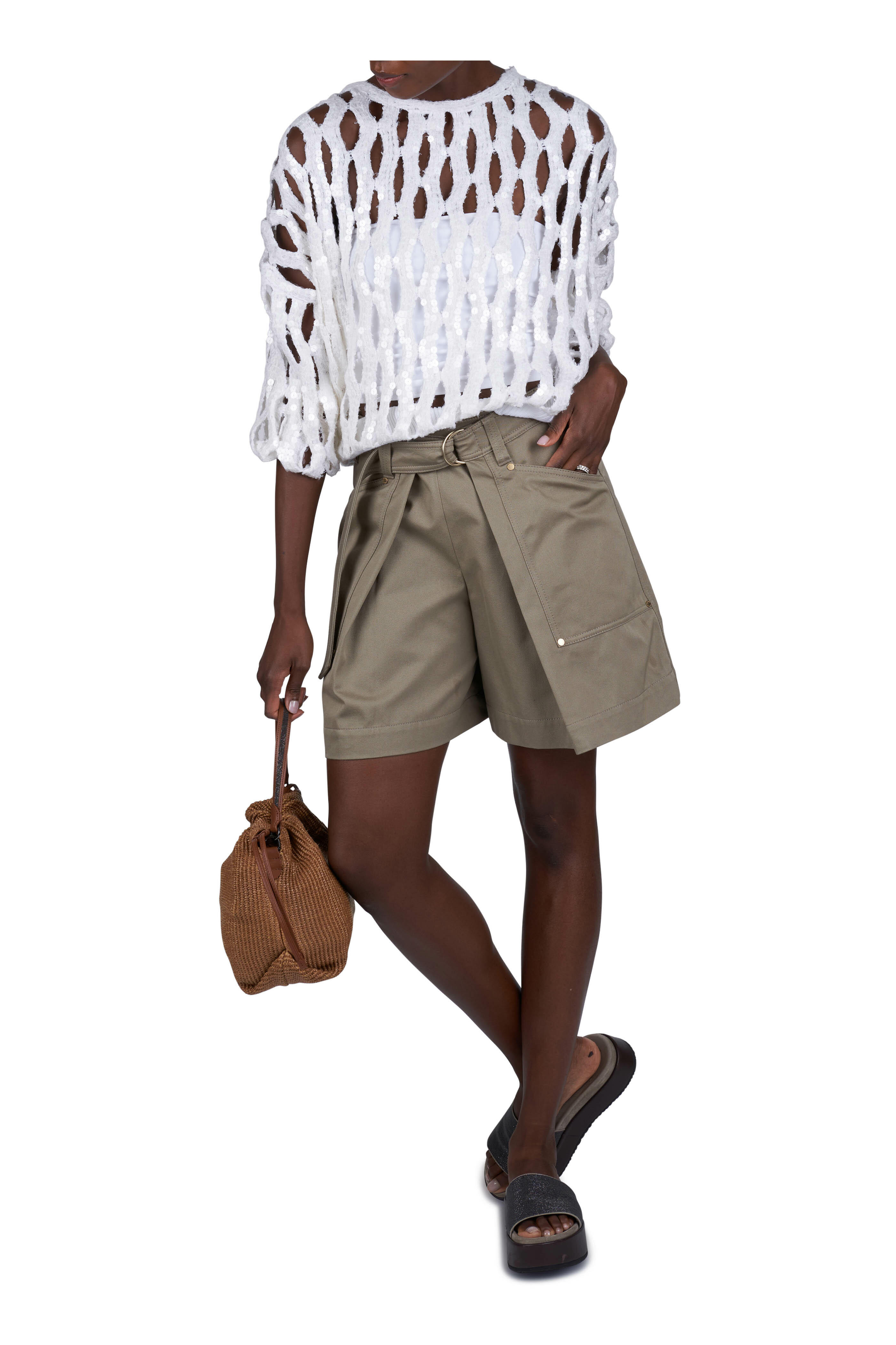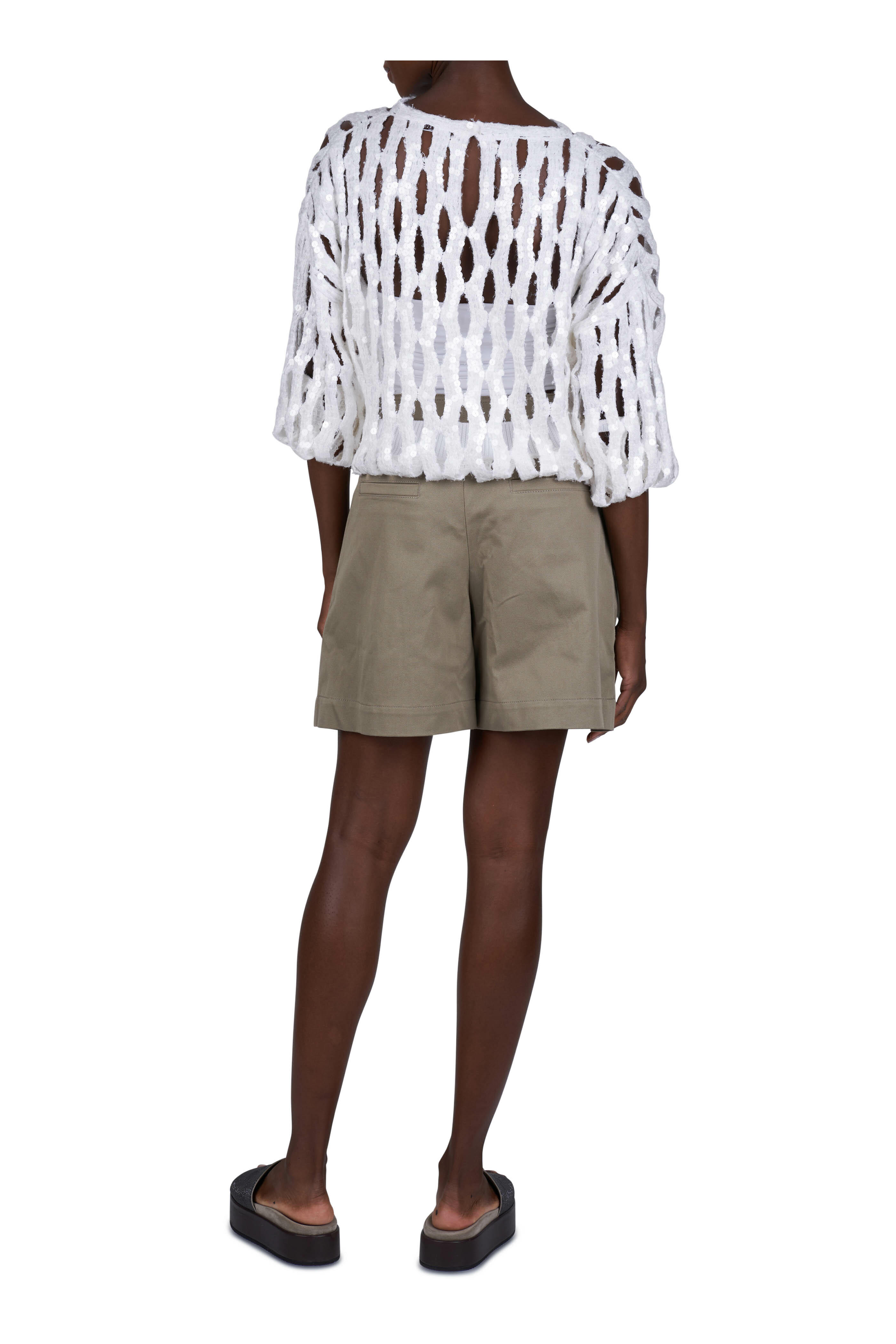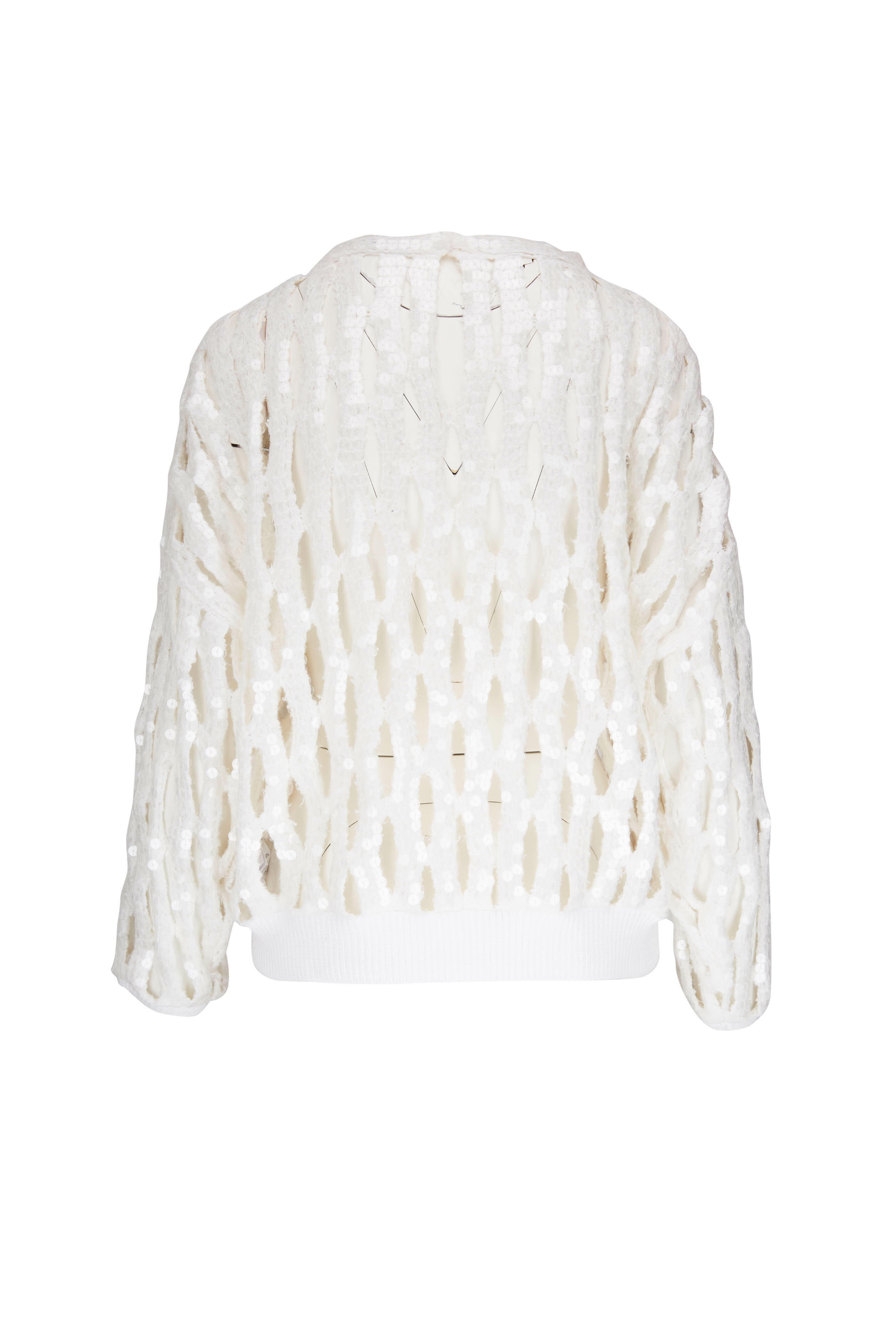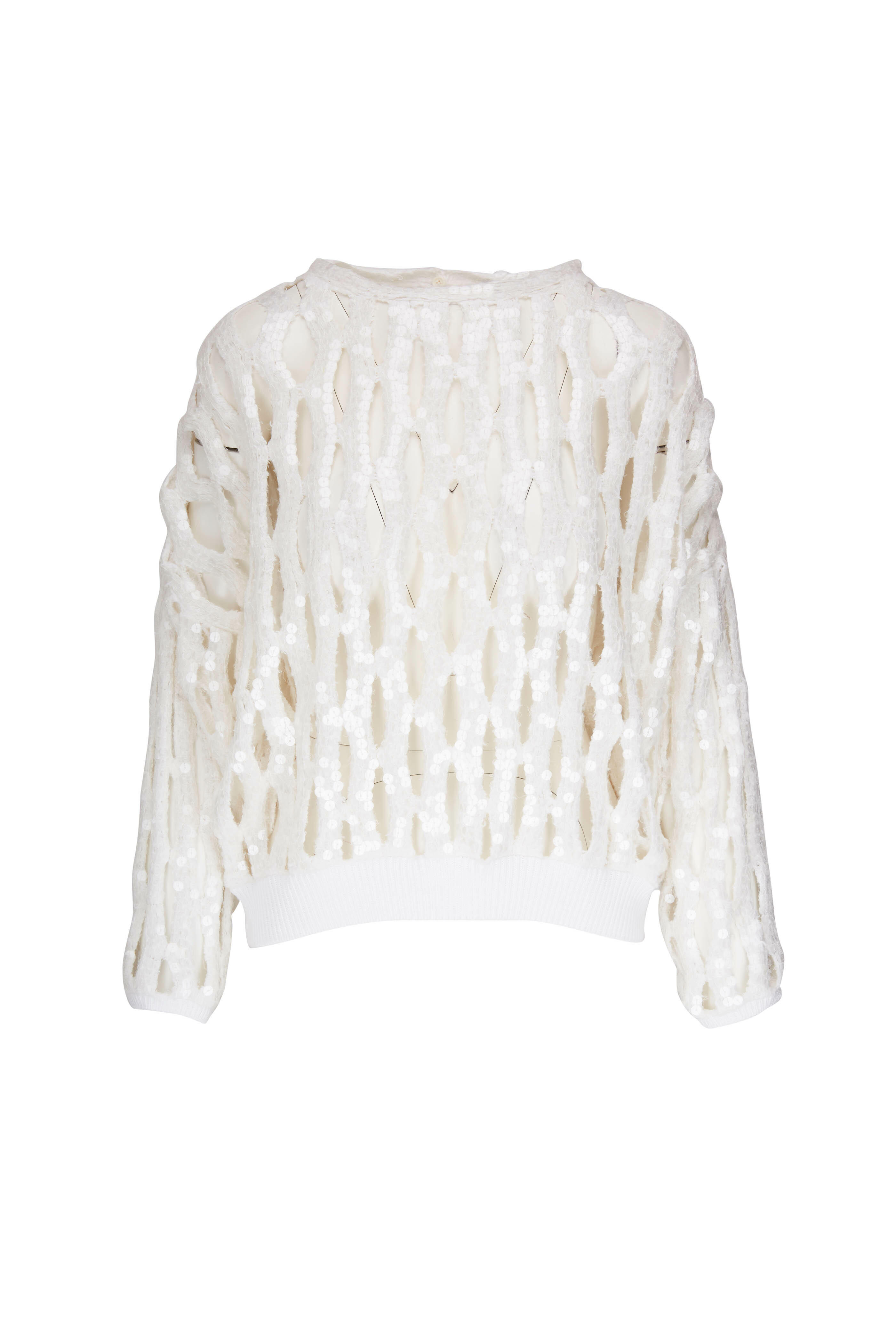 Round neckline. Open weave. All over paillette detailing. Made in Italy. 78% linen, 18% silk, 4% polyamide. Dry clean.
