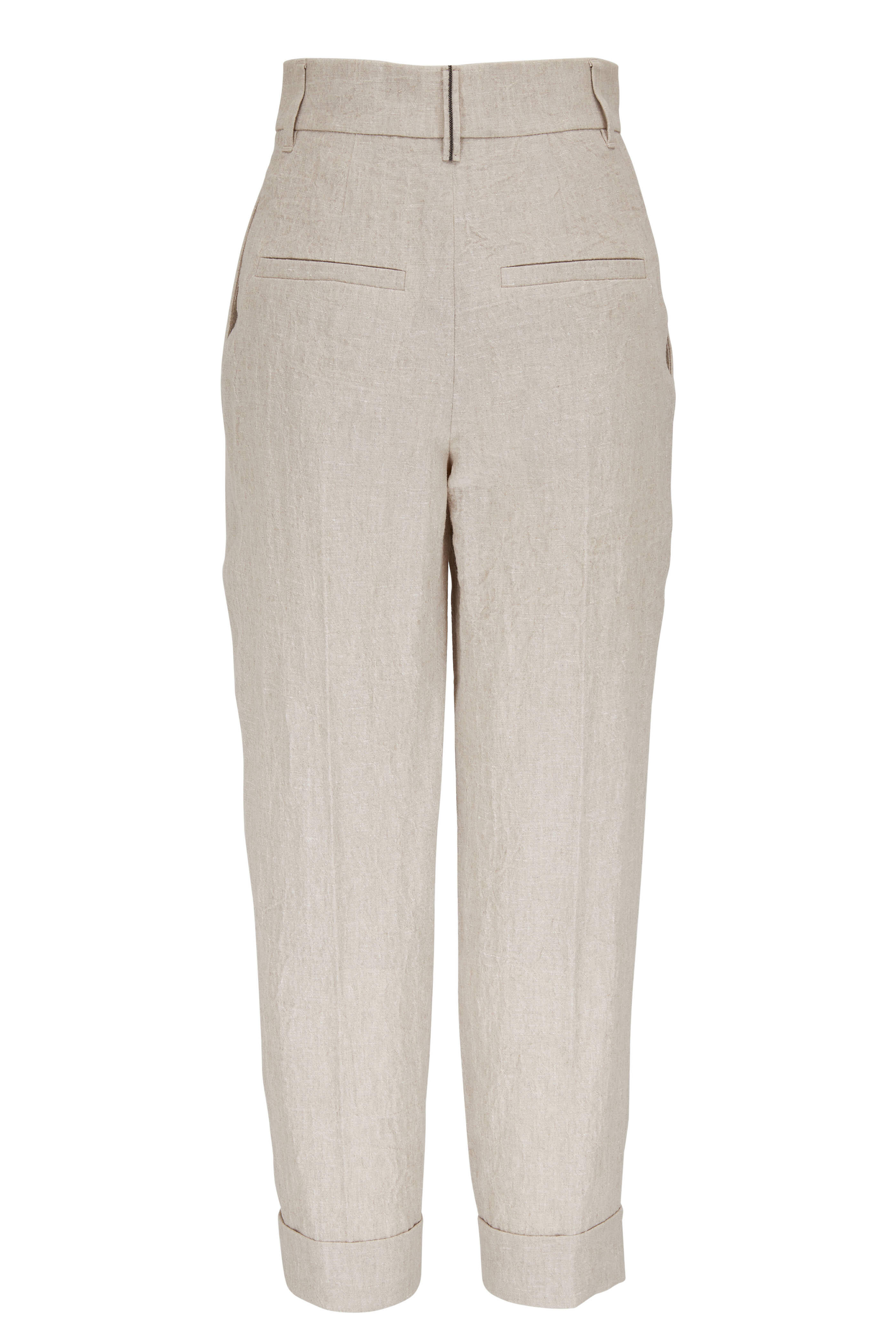 Zip fly; button; double hook-and-eye closure. Belt loops; banded waist. Pull-on style. Side slip pockets; back welt pockets. Cropped at the ankle. Made in Italy. 25" inseam. High rise. 100% linen. Dry clean.