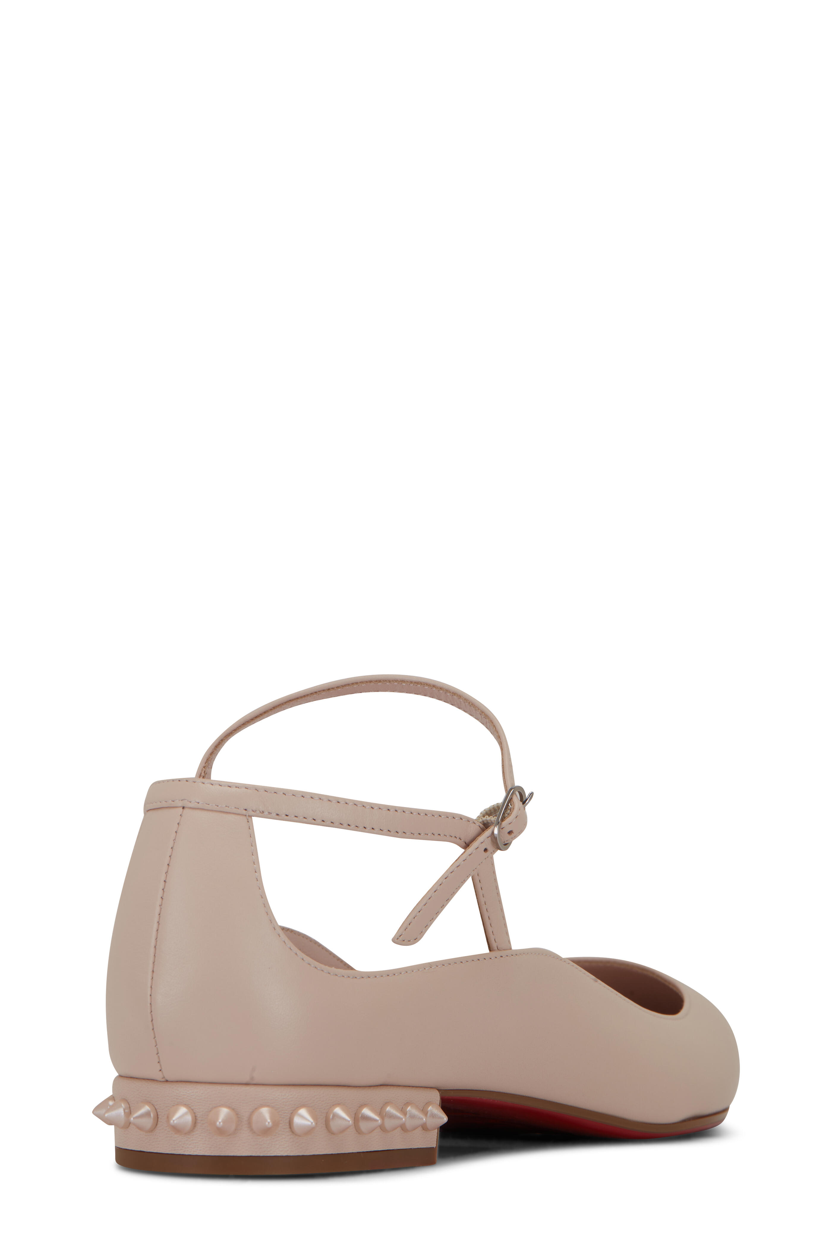 Leather upper. Pointed toe. Adjustable buckle ankle strap. Spike trim heel. Leather lining and insole. Signature red lacquer sole. Made in Italy.