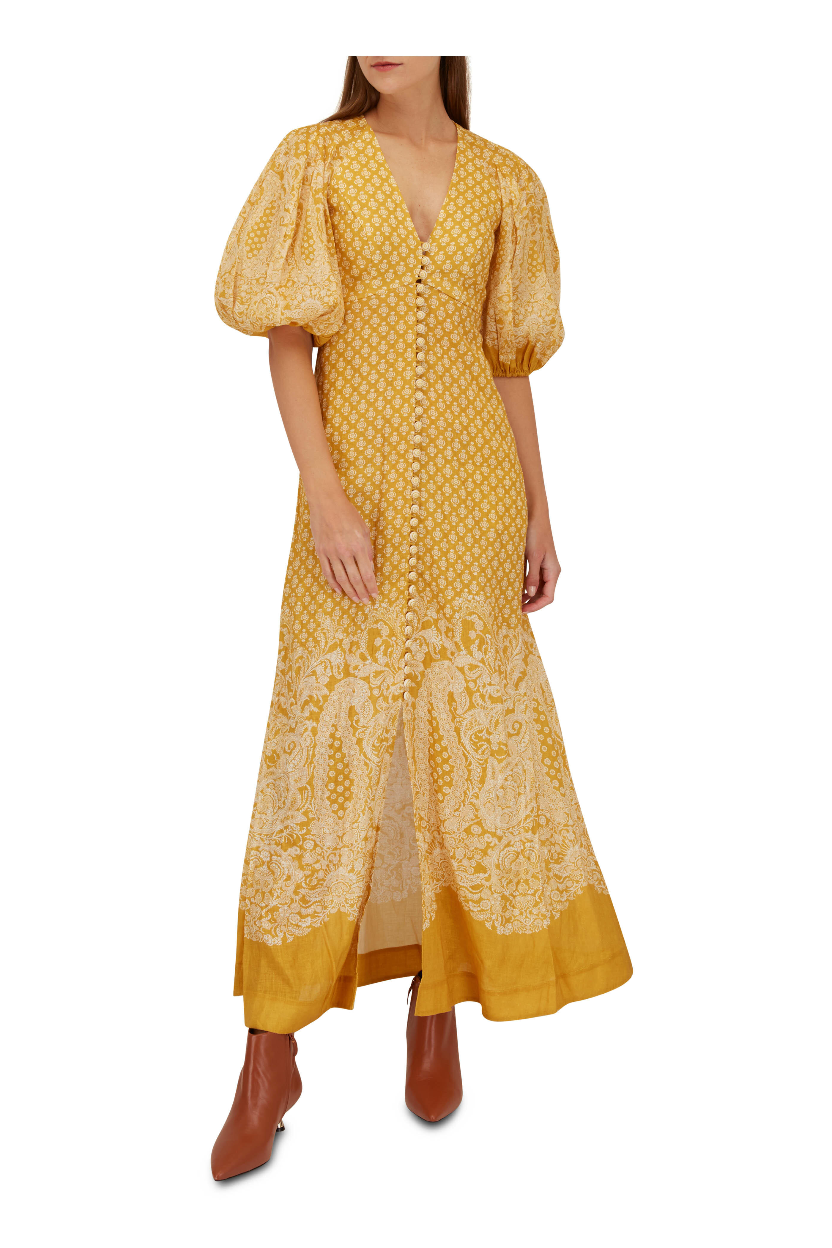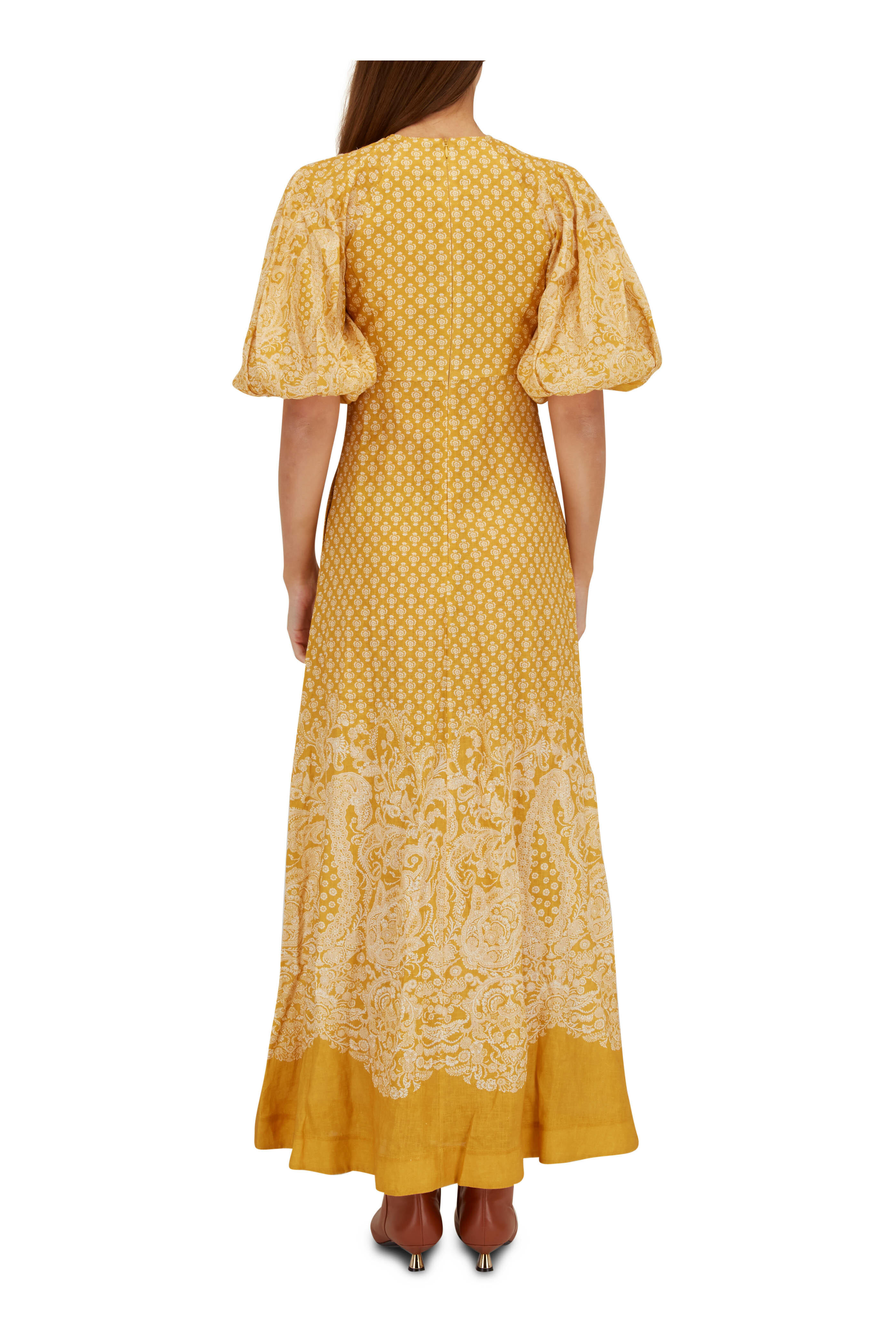 V-neckline. Concealed back zip. Three-quarter length puff sleeves. Imported. Abut 57" shoulder to hem. 100% linen. Dry clean.