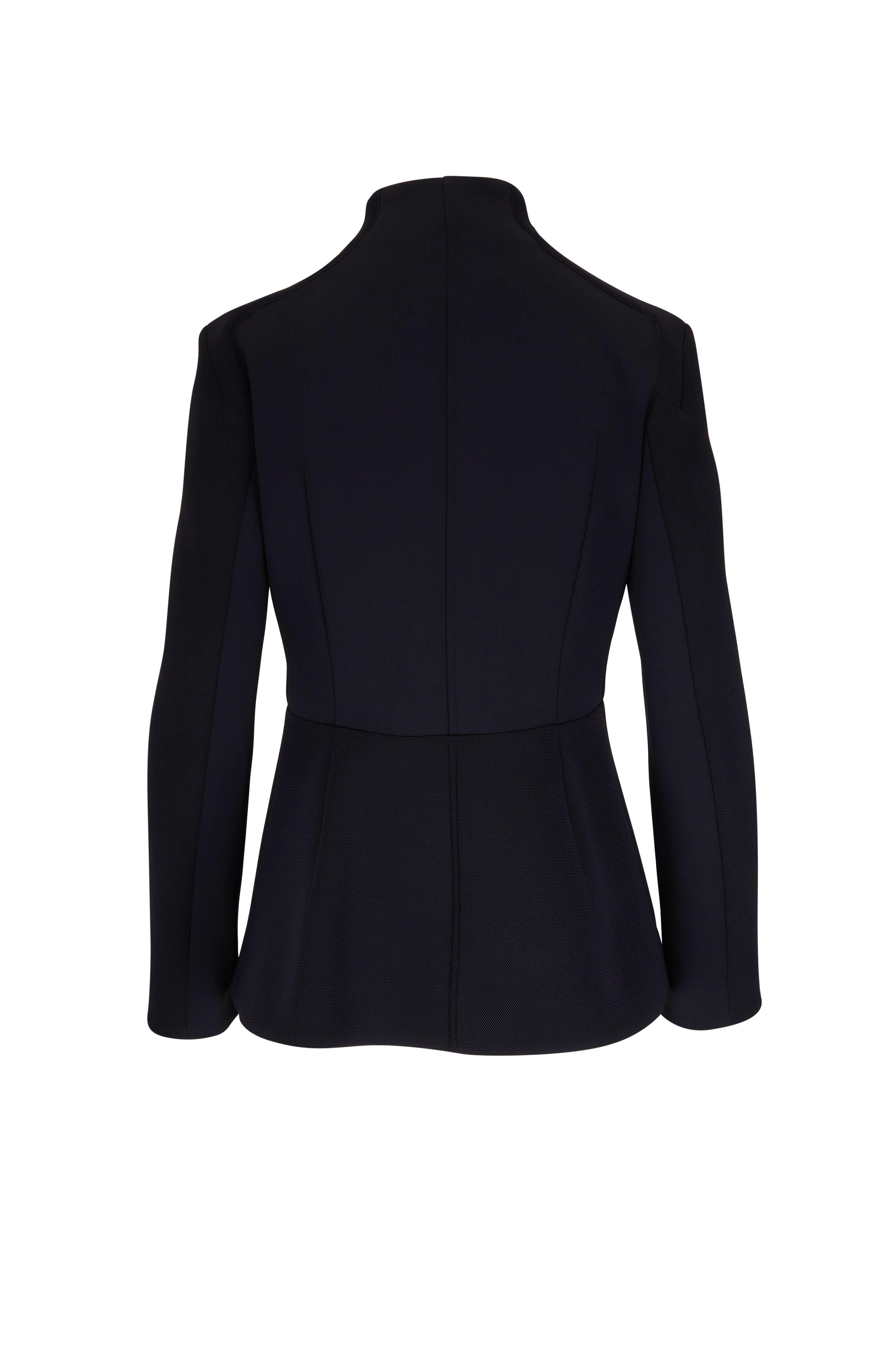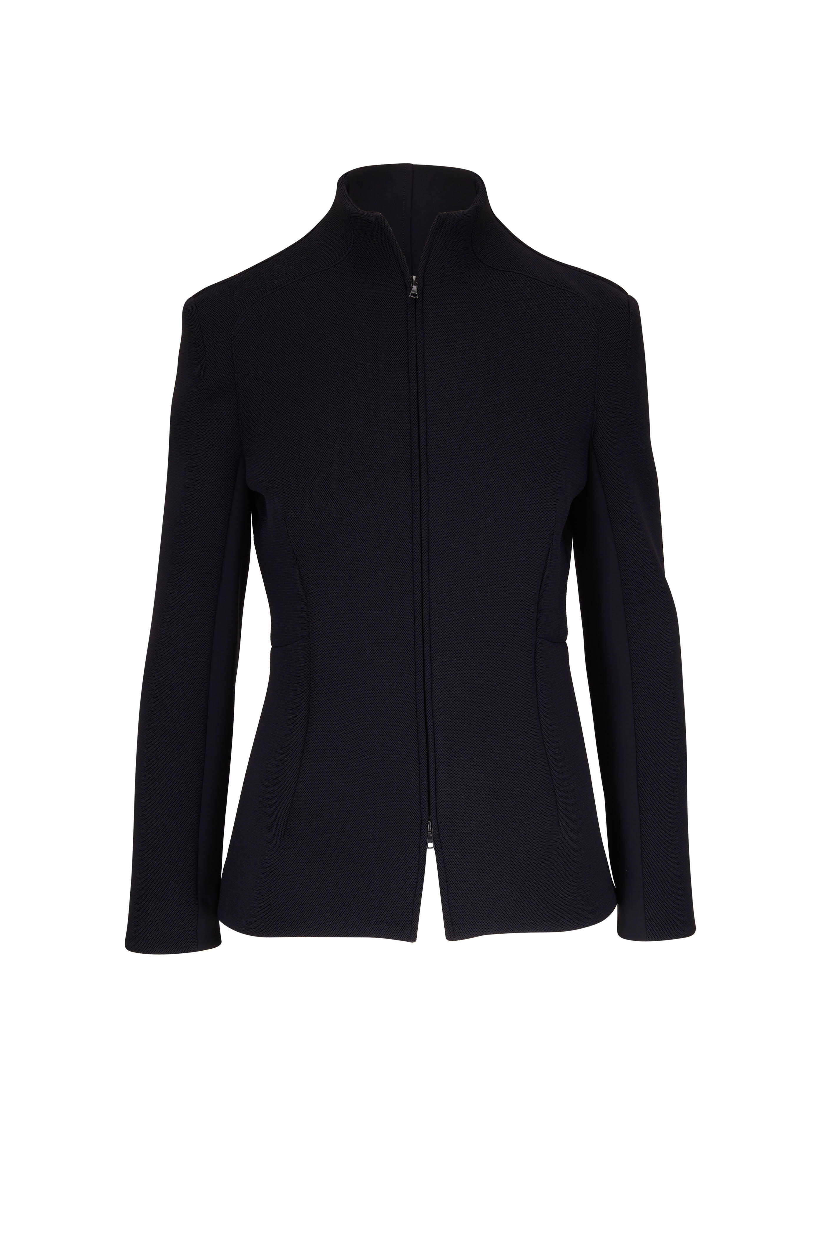 Funnel neck. Exposed two-way zip front closure. Double vent. Made in the USA. 90% polyester; 10% elastane. Dry clean.