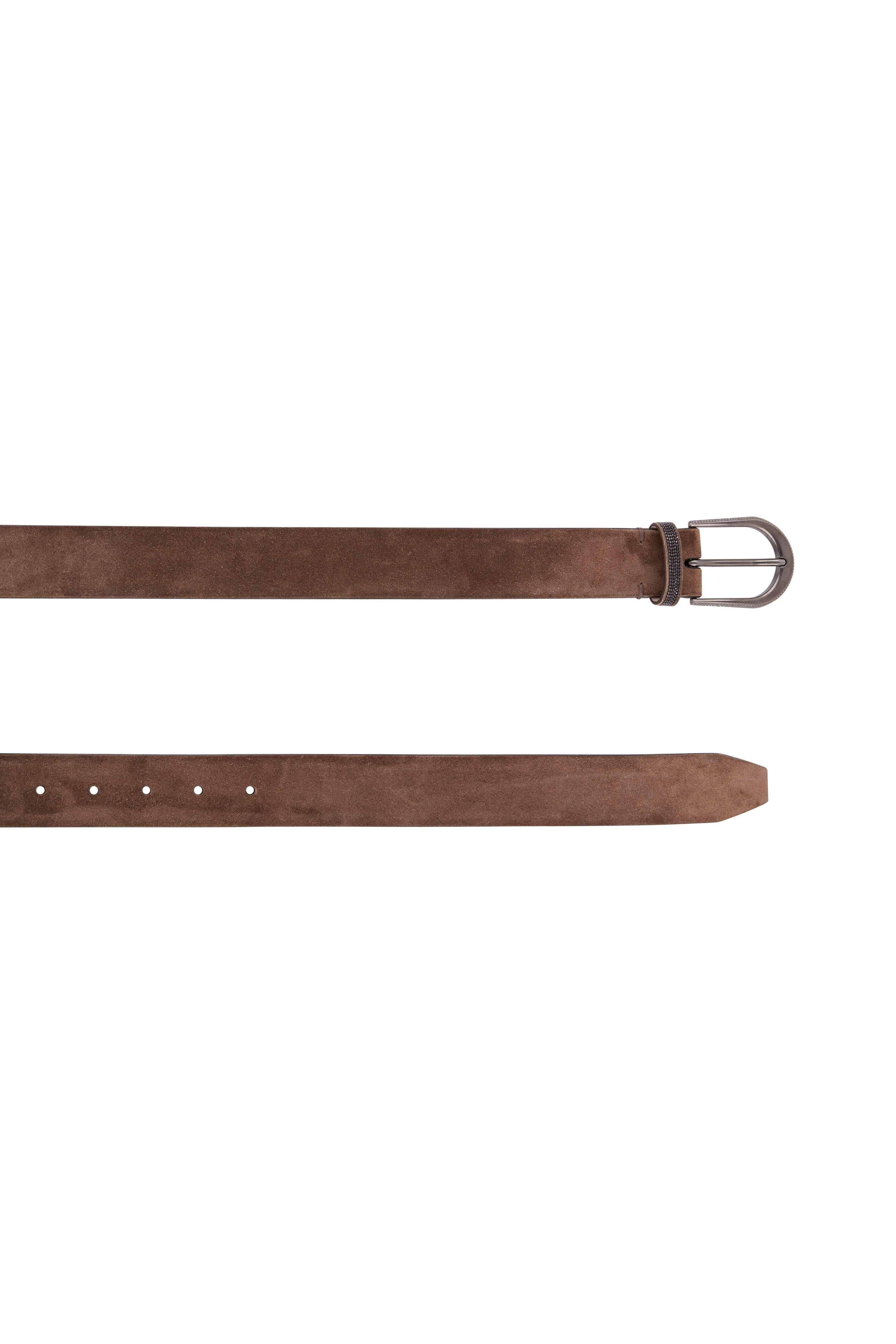 Round buckle. Single belt loop keeper. Monili detail. Made in Italy. 1 ½" width. 100% leather/suede.
