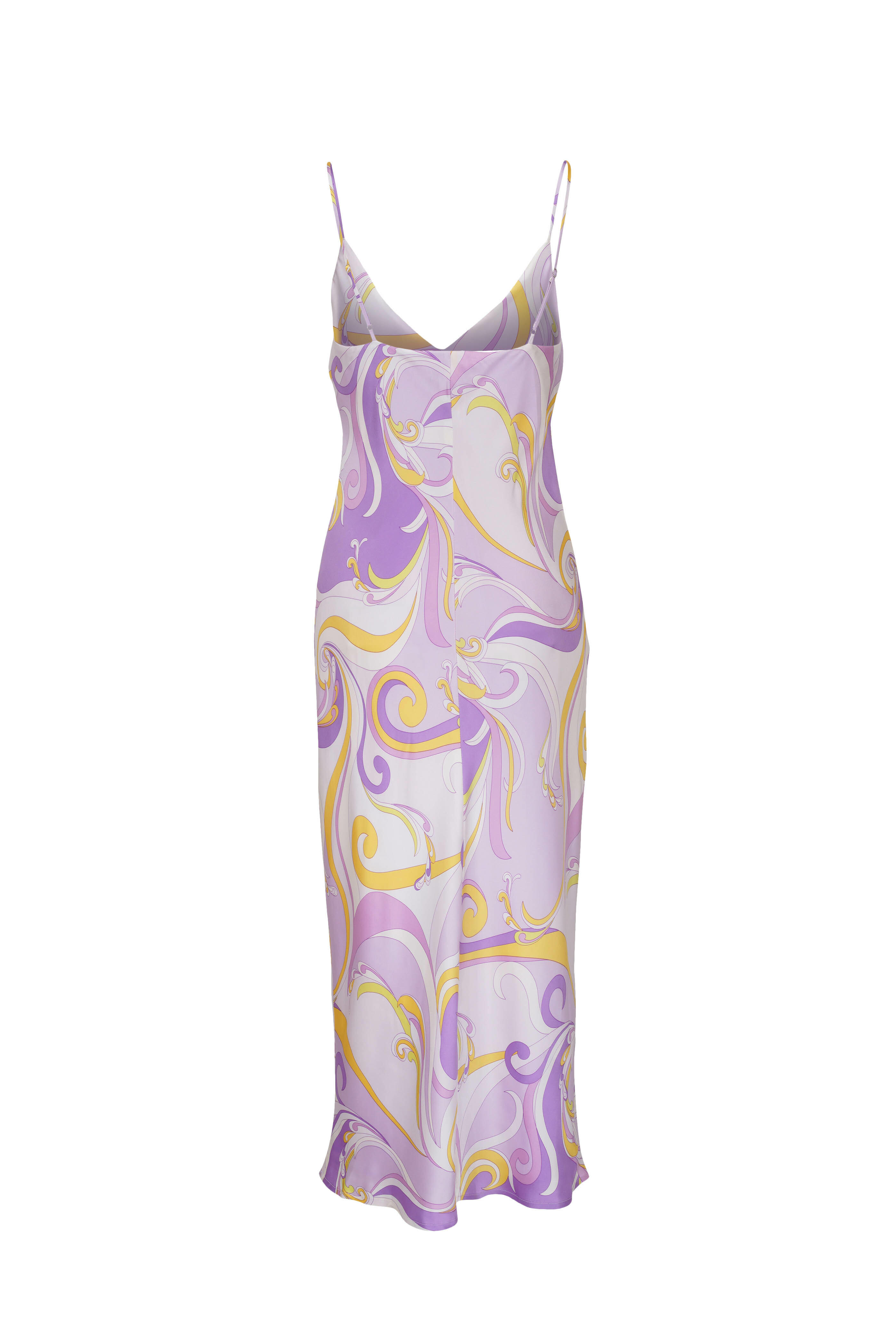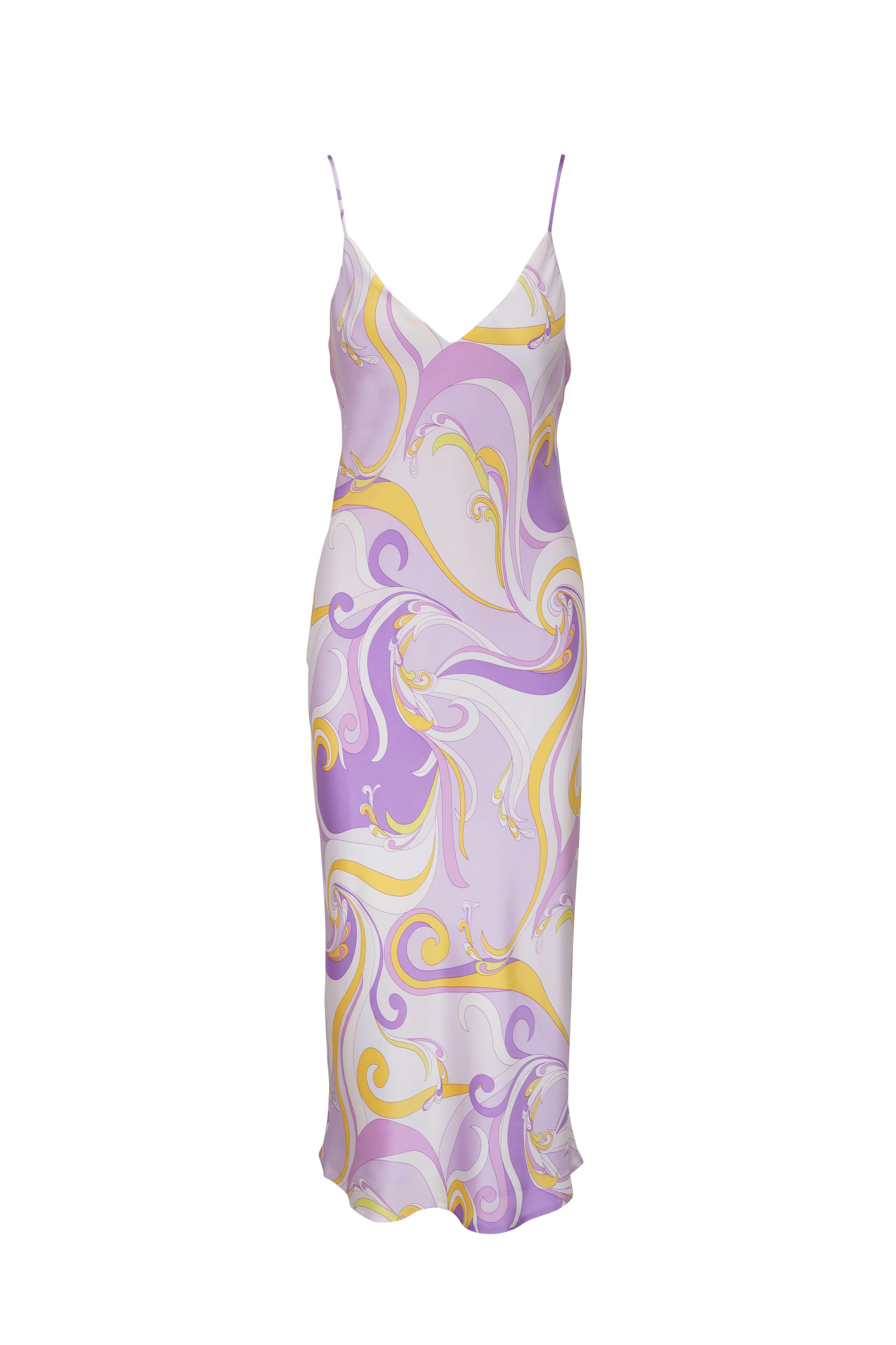 V-neckline. Slip over style. Adjustable spaghetti straps. Bias cut. Imported. About 44.5" from shoulder to hem. 100% silk. Dry clean.