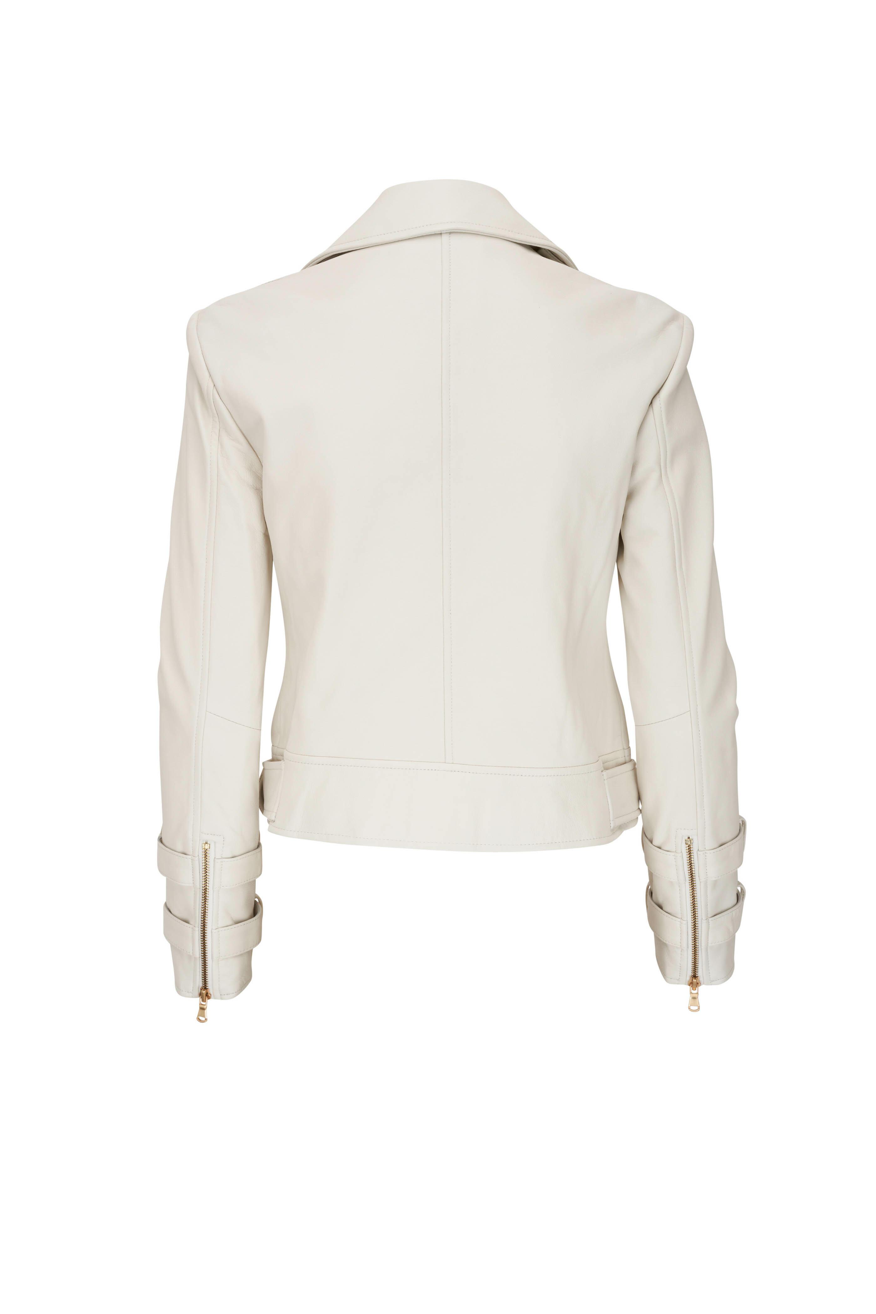Wide notched lapels. Asymmetric front zip. Detachable self belt. Belted, zipper cuffs. Lower zip pockets. Embossed gold-tone buttons. Imported. 20" shoulder to hem. 100% lambskin; lining: 100% polyester. Dry clean.