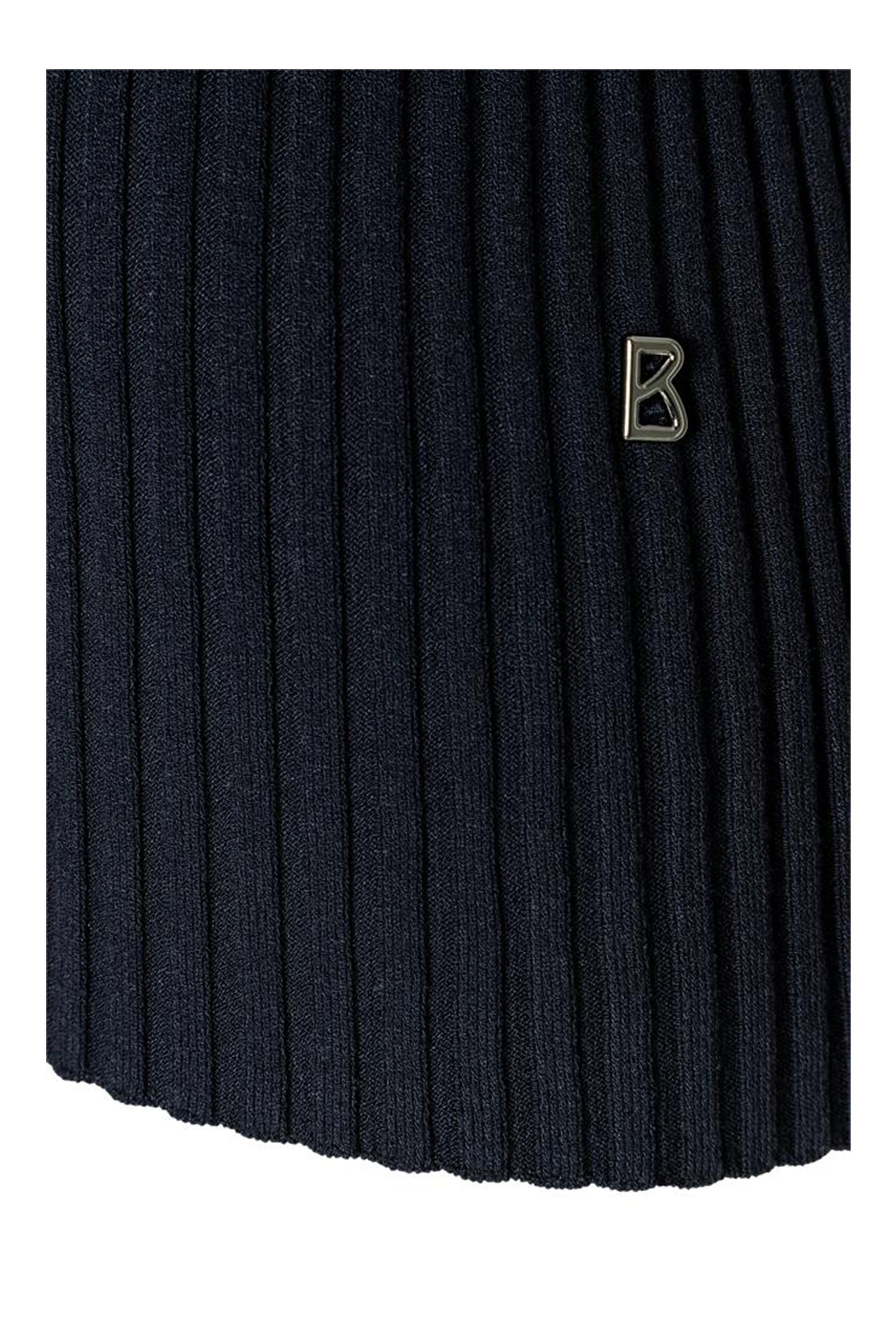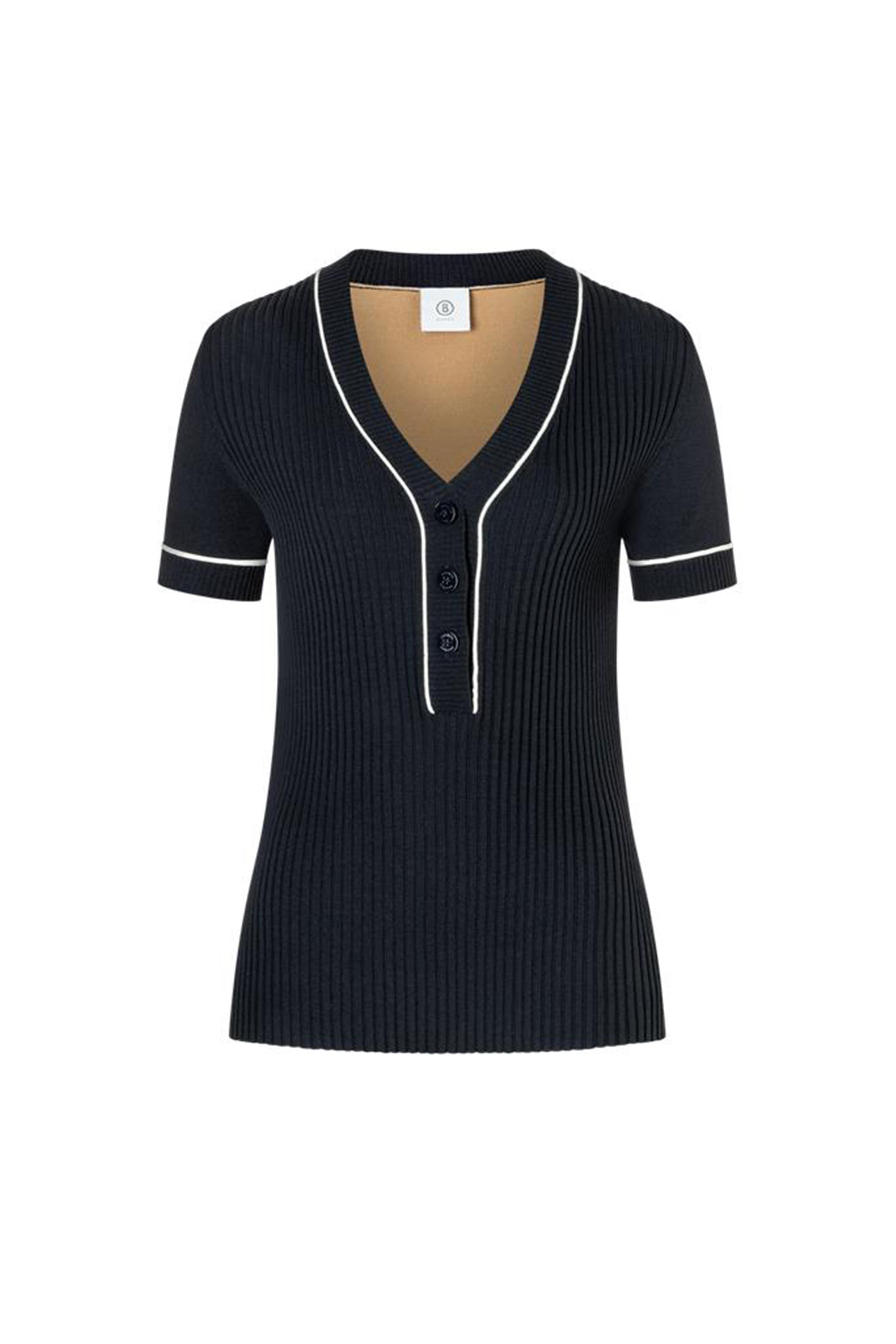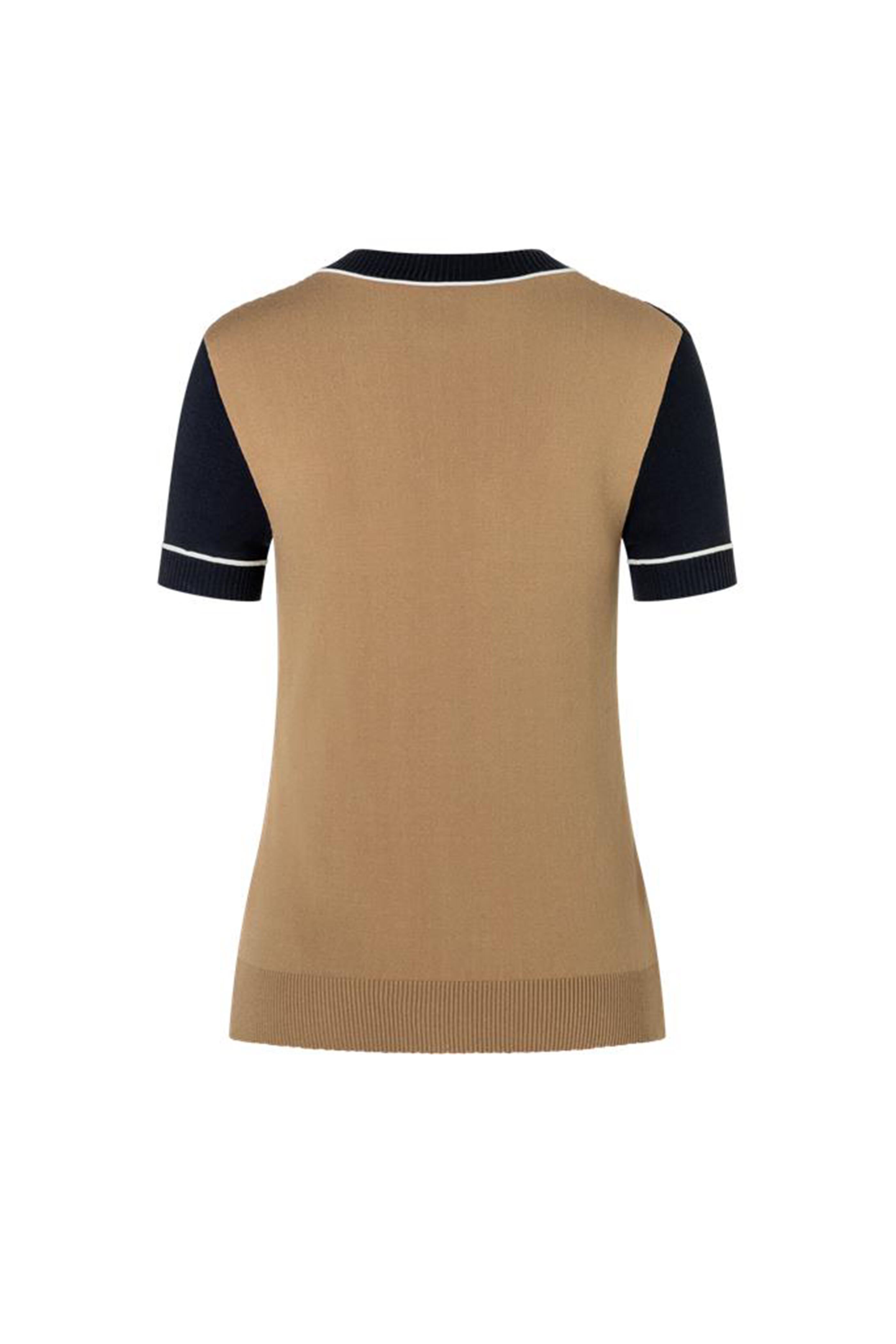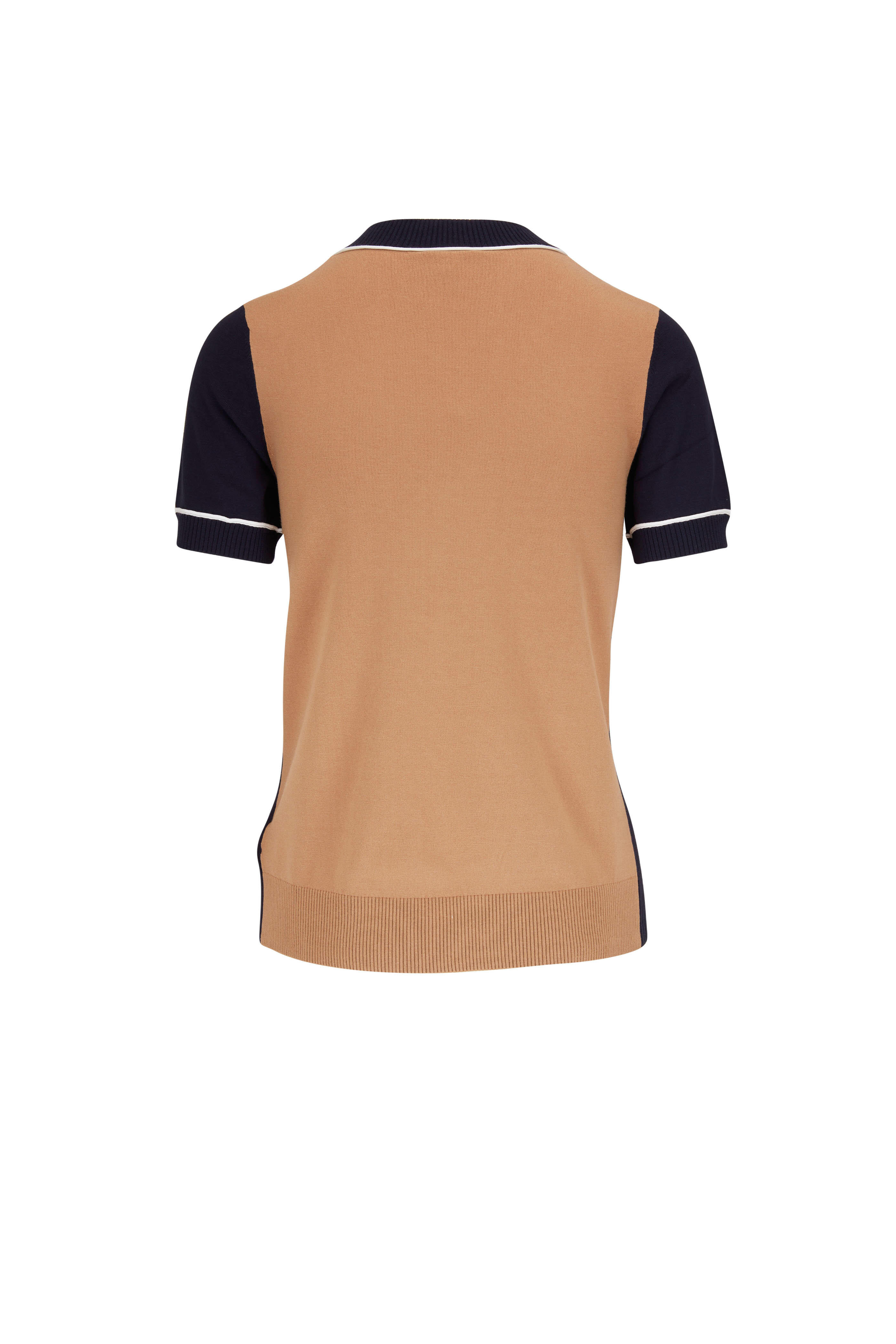 Deep V-neckline. Three button placket. Logo-embossed buttons. Mix of smooth and ribbed sections. Contrasting trim along neckline and sleeves. Beige back panel. Elasticized cuffs. Straight hem. Imported. Color: Navy & Camel. Body-hugging fit. 72% viscose, 28% polyester. Dry clean.