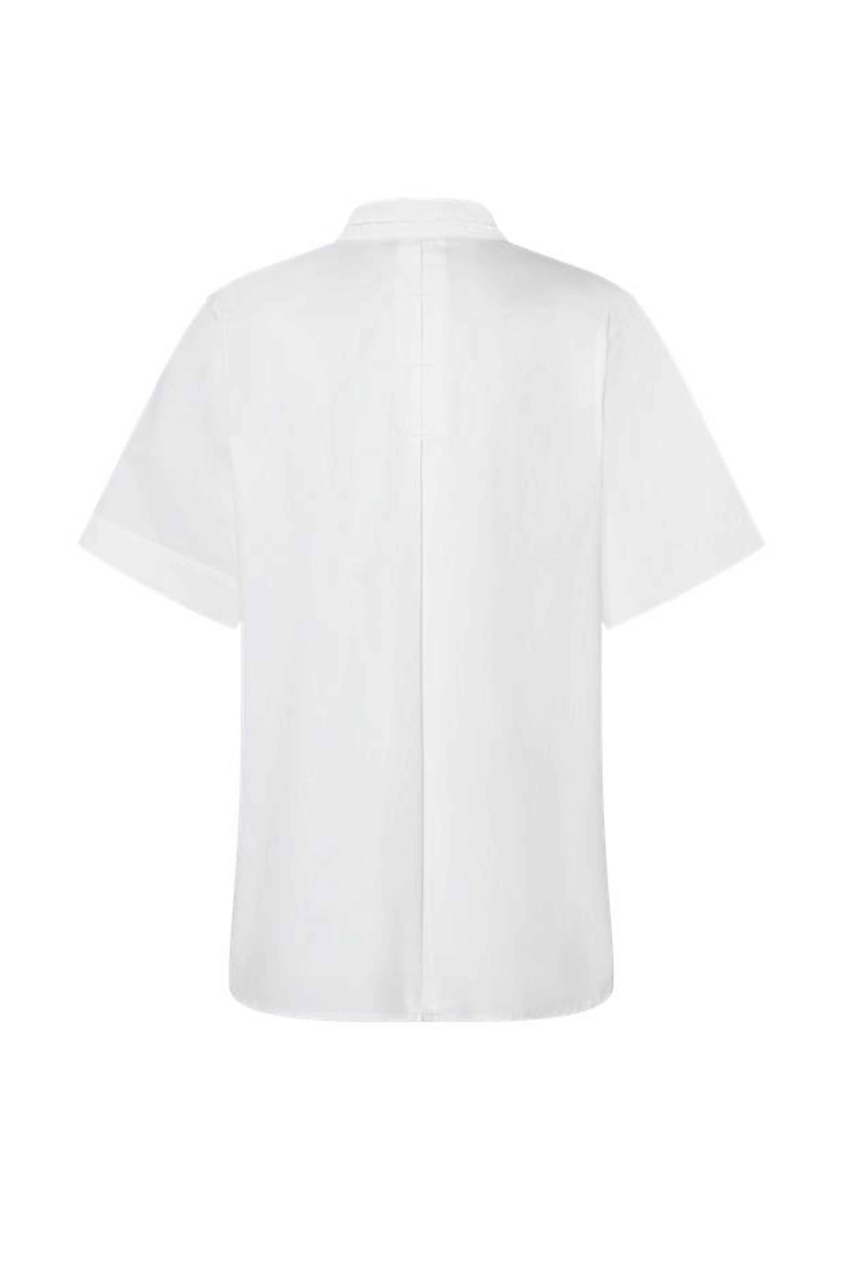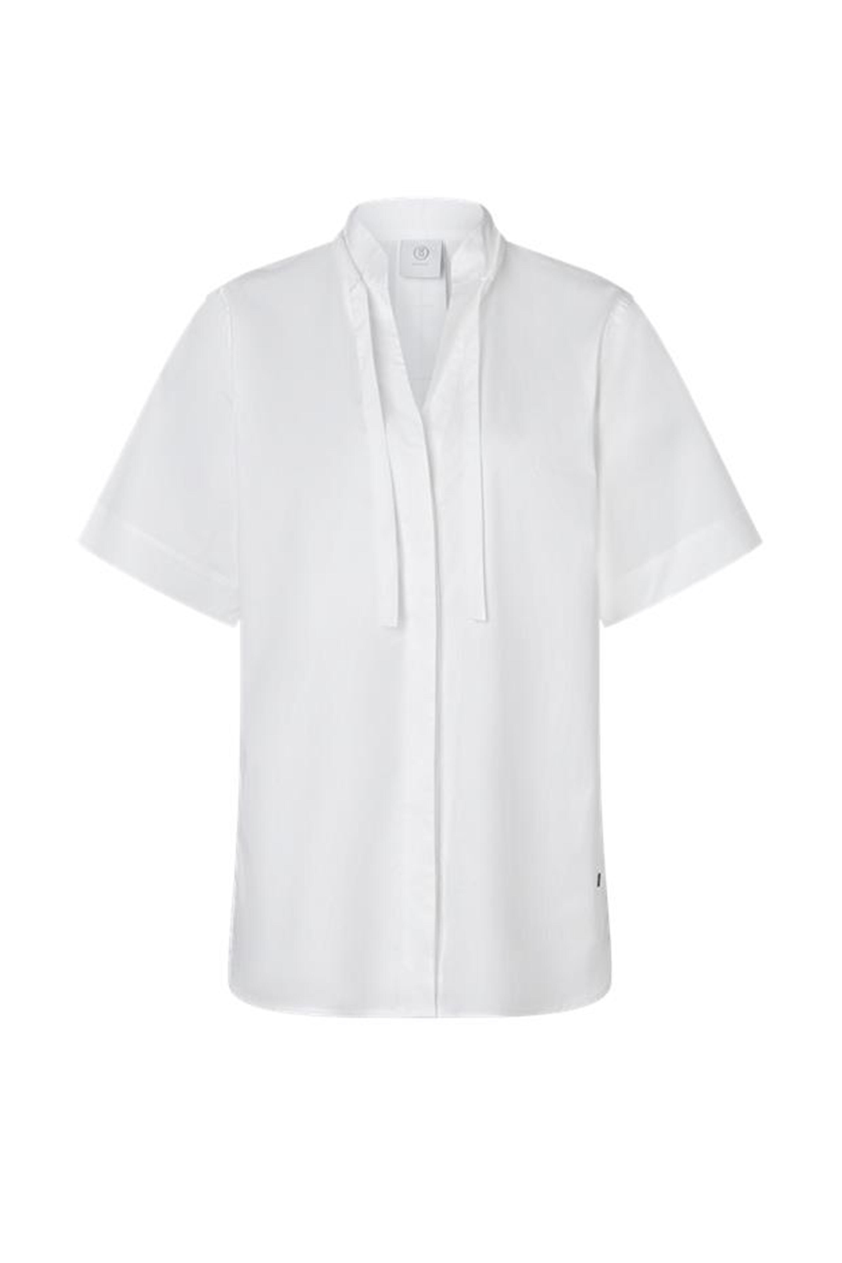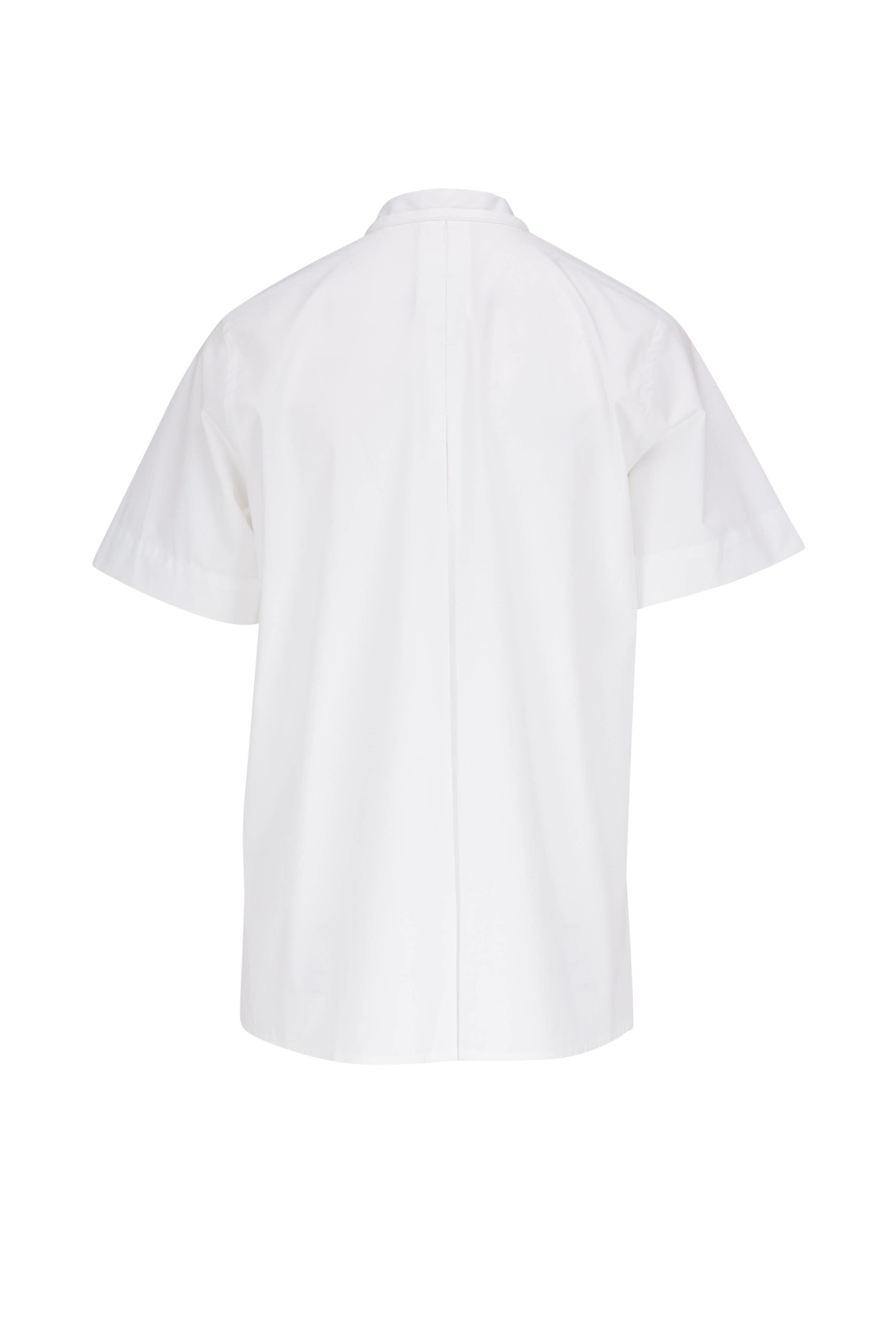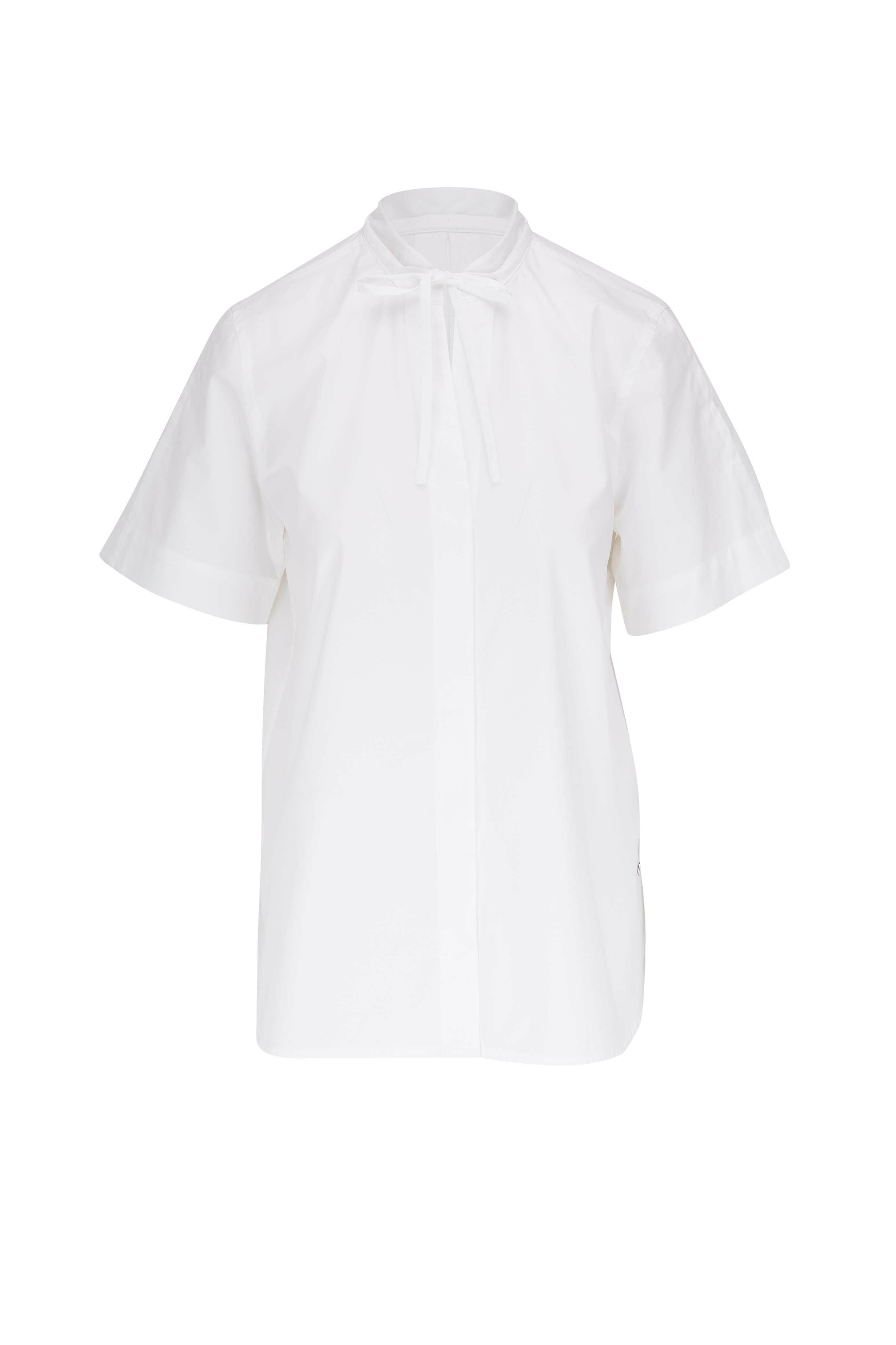 Band collar with self-tie neckline. Concealed front button placket. Short sleeves. Vented hem. Made in Portugal. 26 1/2" shoulder to hem. 97% cotton, 3% elastane. Dry clean.