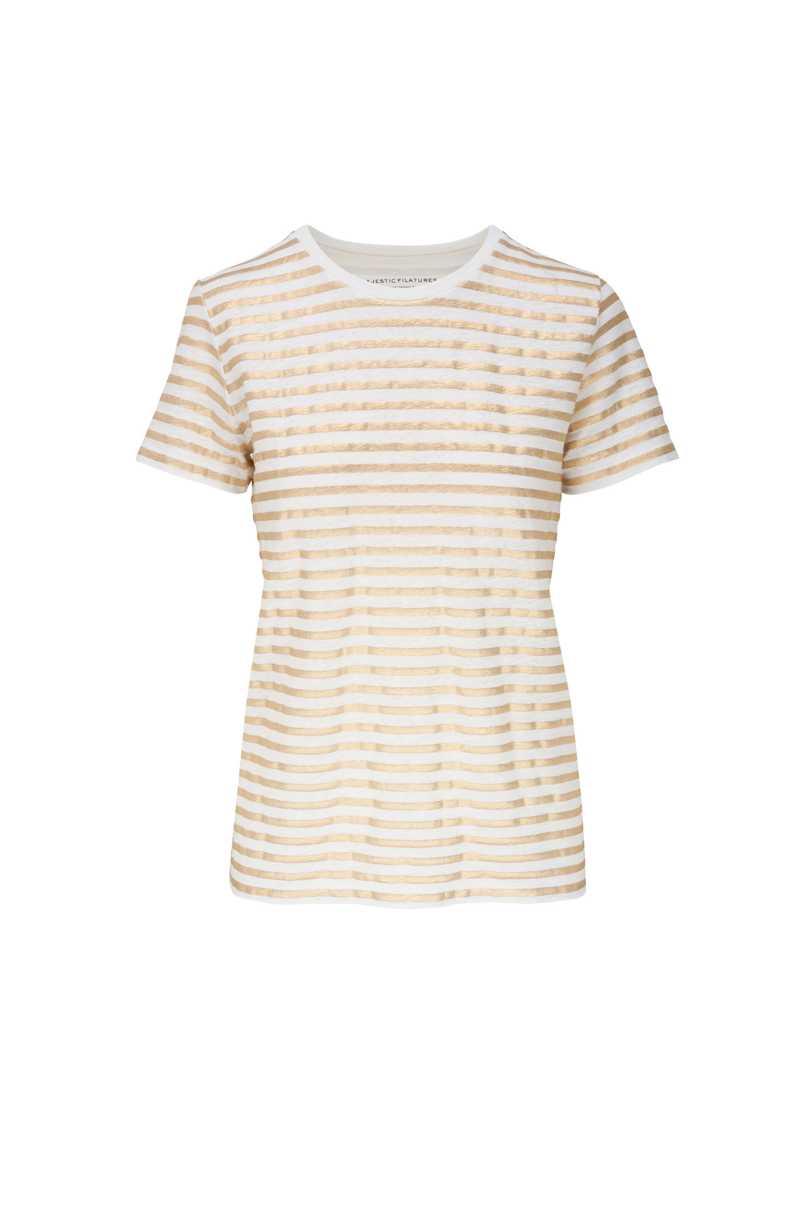 • Majestic - Gold Metallic Striped Crewneck Linen T-Shirt