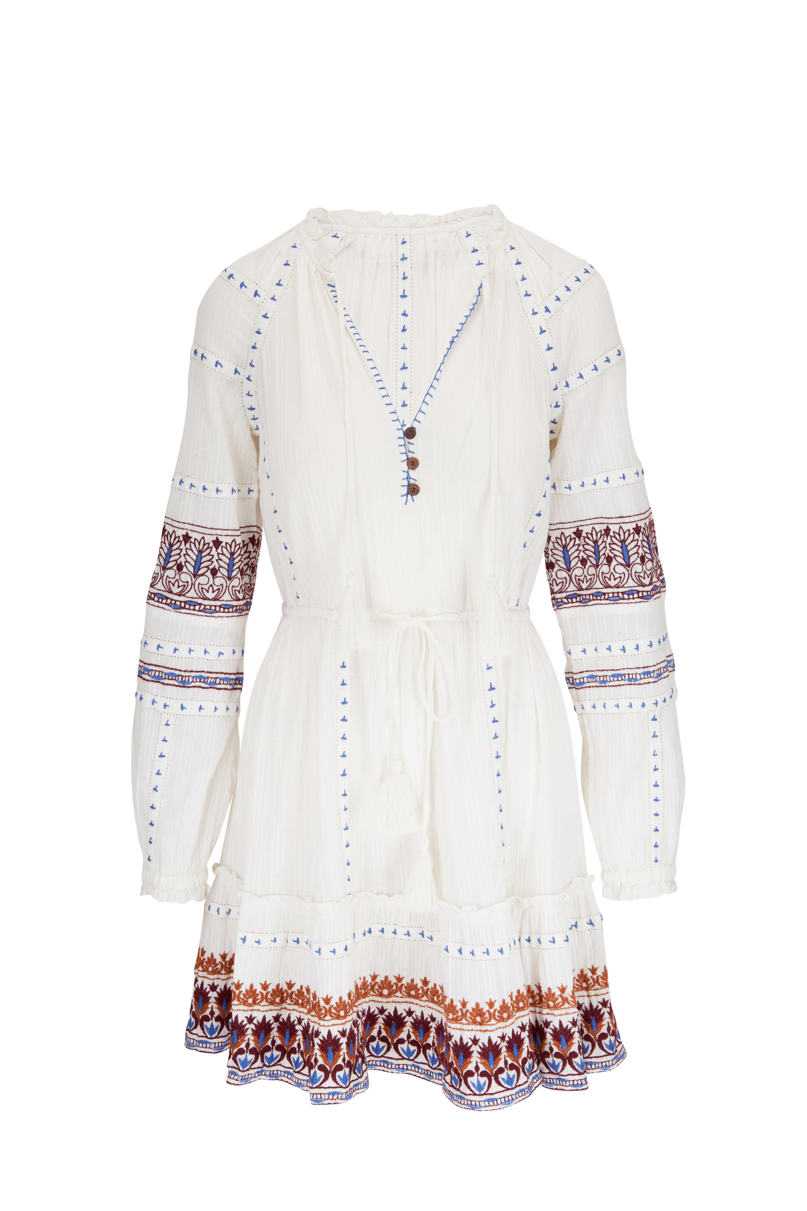 V-neckline; ruffle collar with self-tie. Three-button placket at neckline. Self-tie waist. Elasticized cuffs with ruffle hem. Embroidery and contrasting stitch detailing throughout. Imported. Color: Off-White Multi. 32" sleeve length. 34" shoulder to hem. Tunic silhouette. 100% Cotton. Dry clean.
