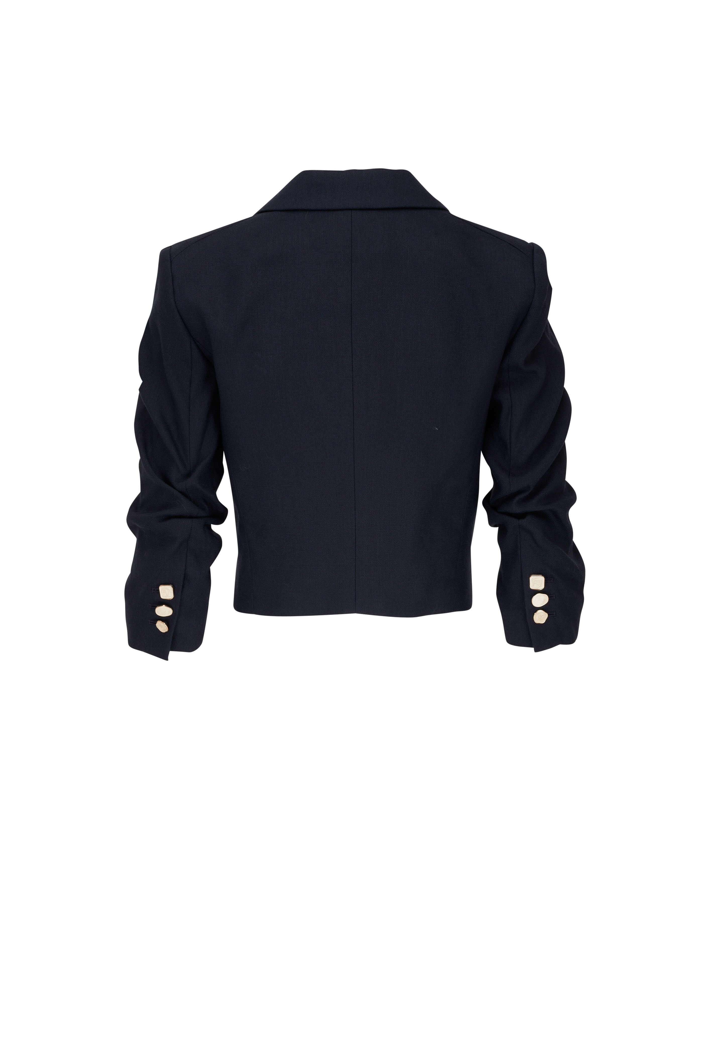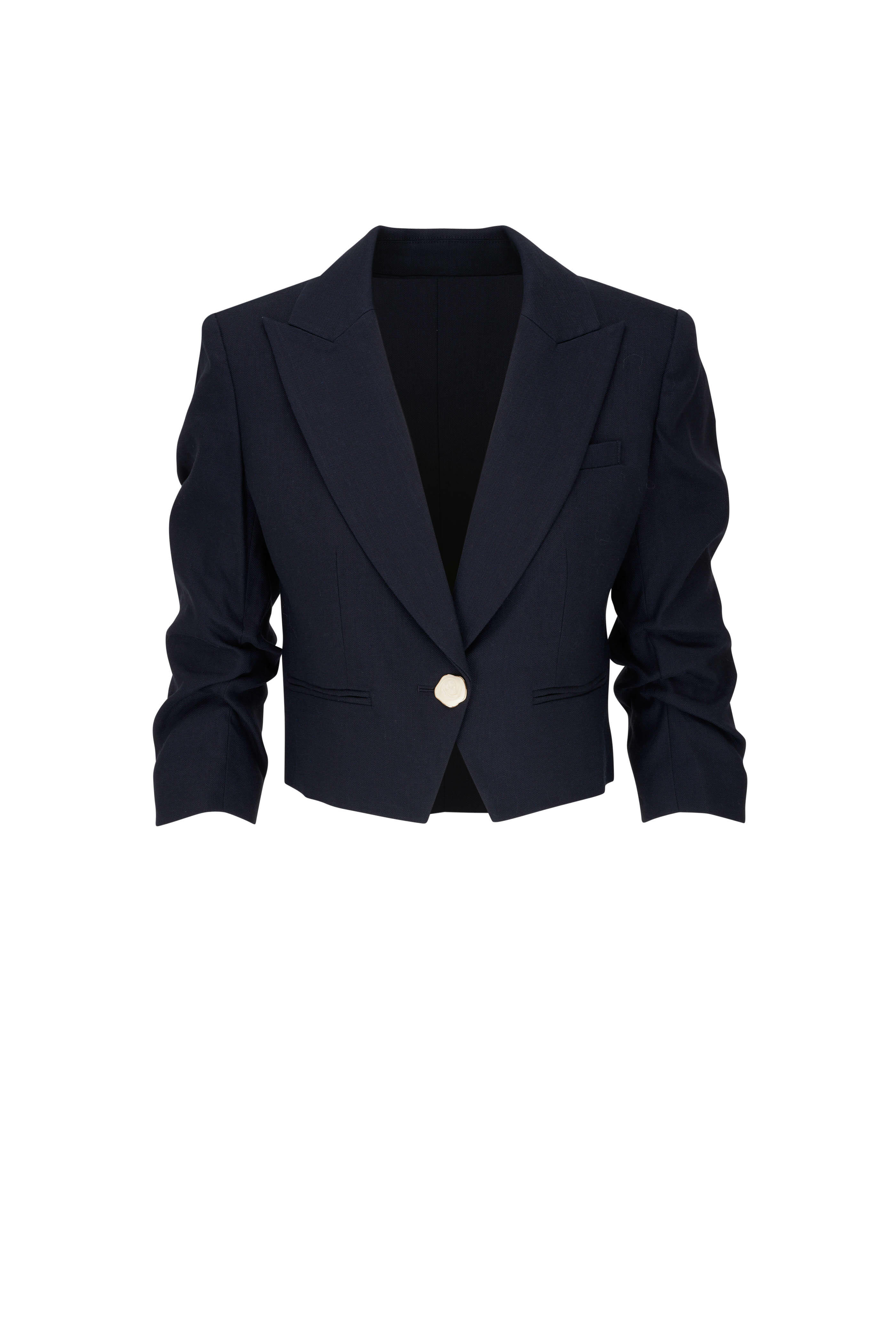 Peak lapels. Single button front closure. Ruched three-quarter sleeves, button accent at cuffs. Front welt pockets. Imported. Color: Navy. 19 ¼" shoulder to hem. 18" sleeve length. 58% linen, 27% polyester, 14% viscose, 1% elastane. Machine wash.