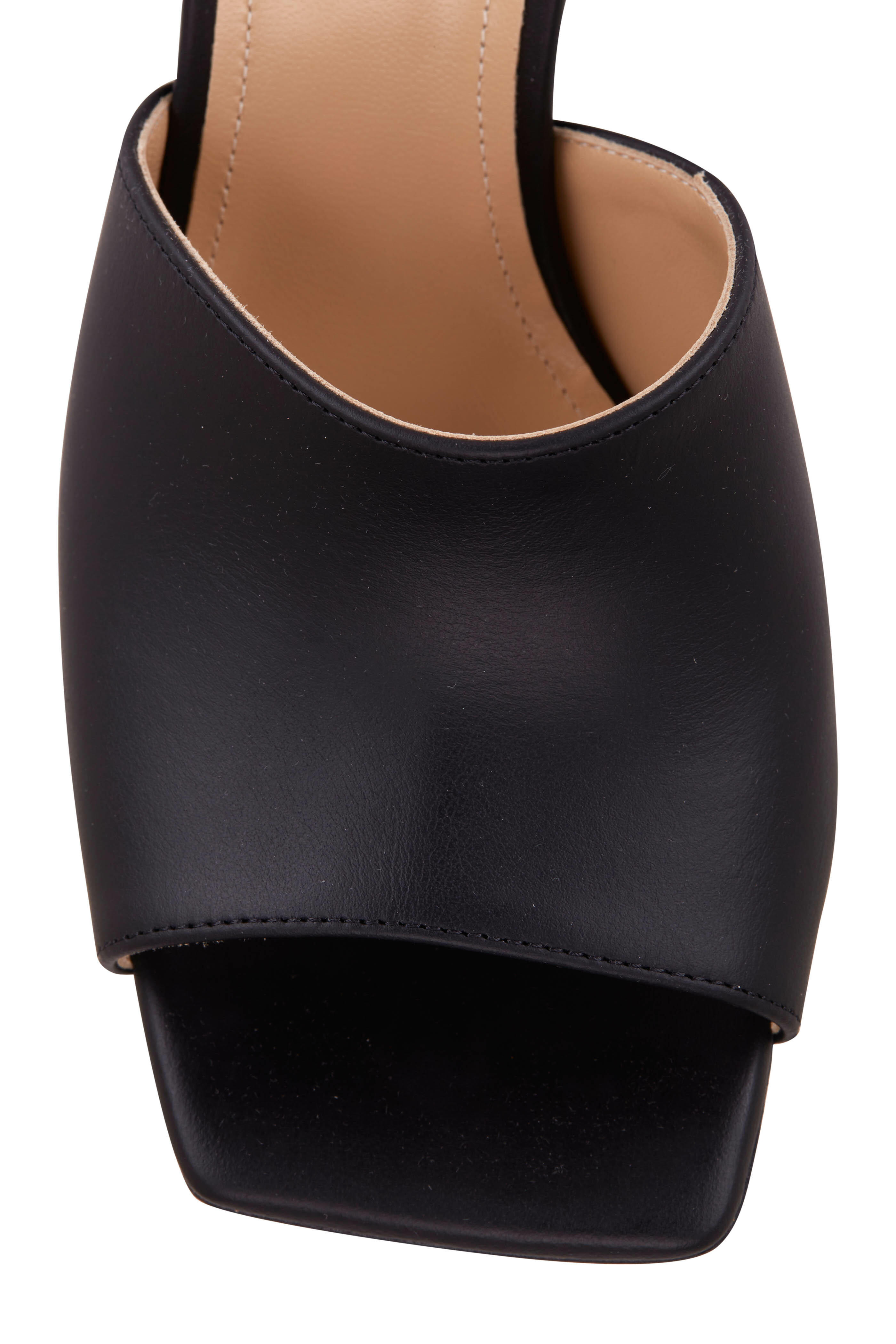 Leather upper. Square, open toe. Slip on style. Leather lining and insole. Sculptural embellished heel. Leather sole. Made in Italy. Heel measurement: 3 3/4" (95mm).