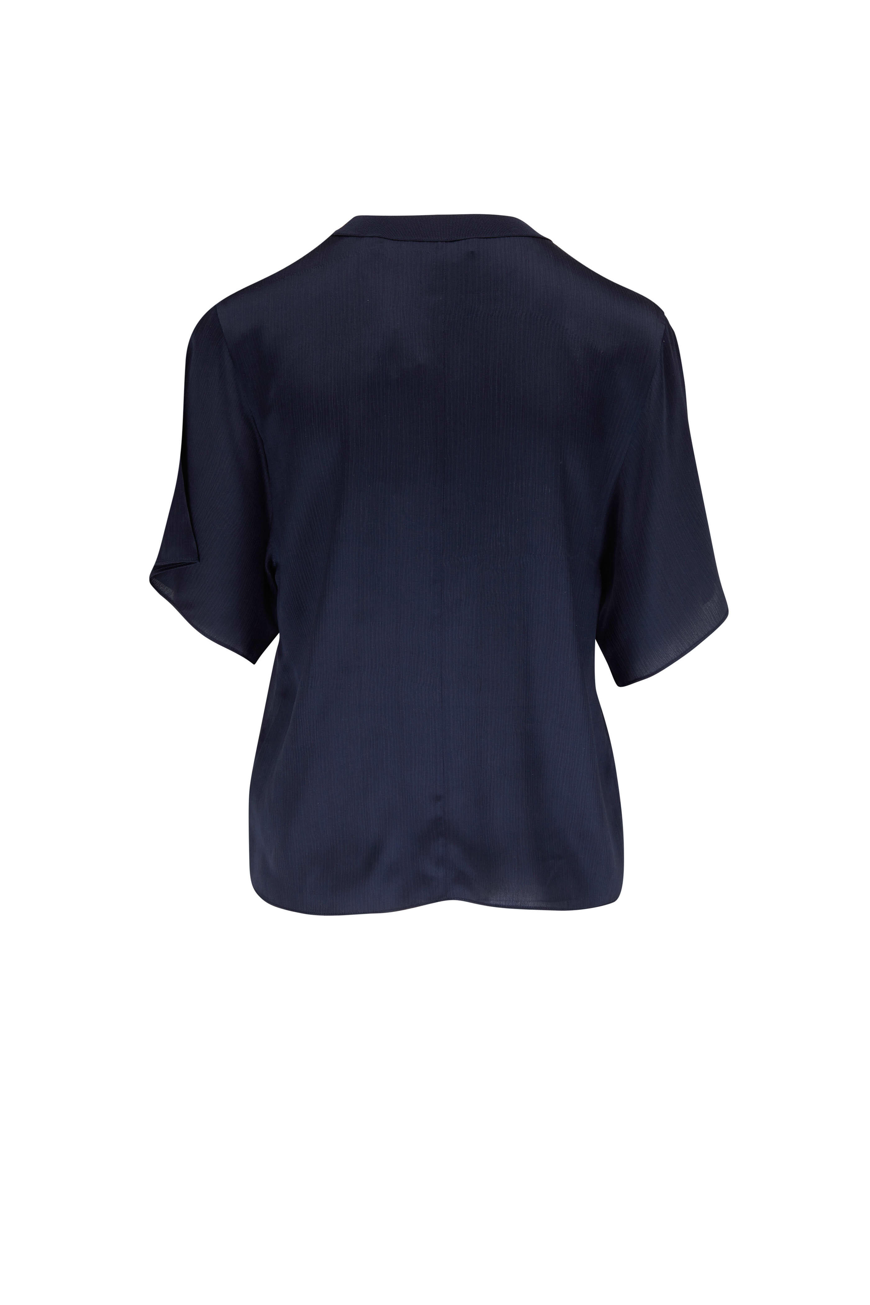 Crew neckline. Slip on style. Oversized short sleeves. Ribbed trims. Imported. Color: Coastal Blue. 100% silk; trim: 52% viscose, 27% nylon, 16% polyester, 5% spandex. Dry clean.