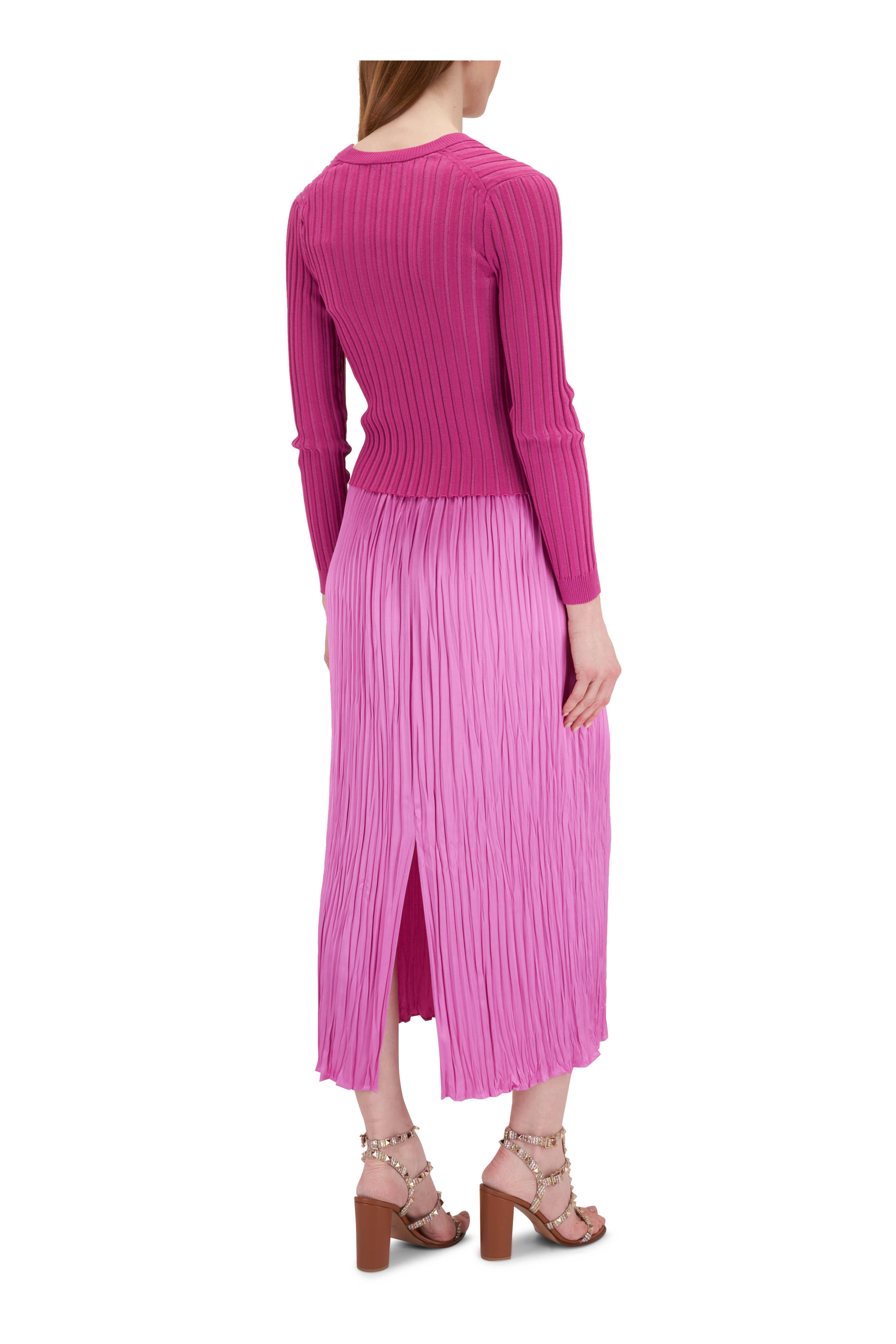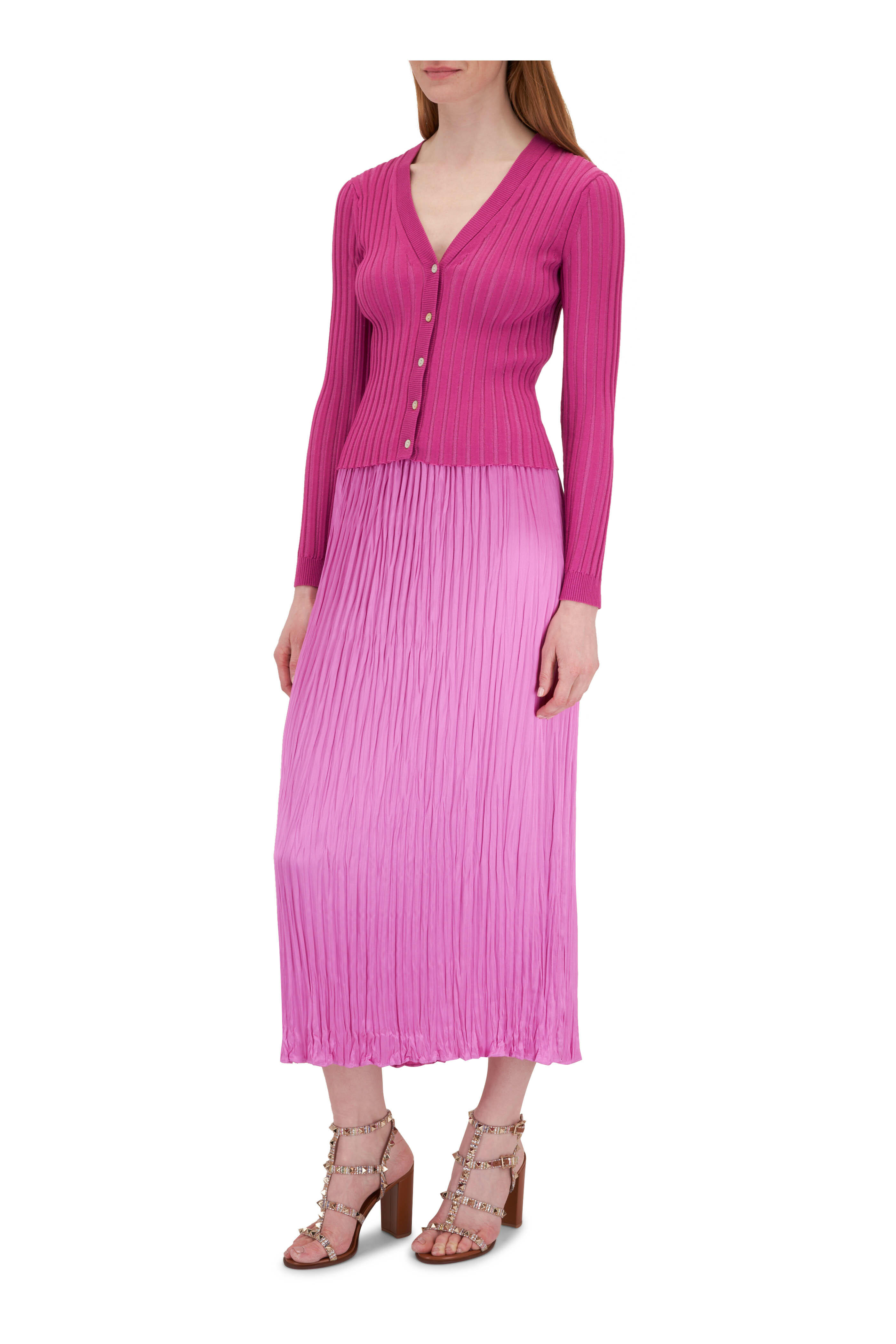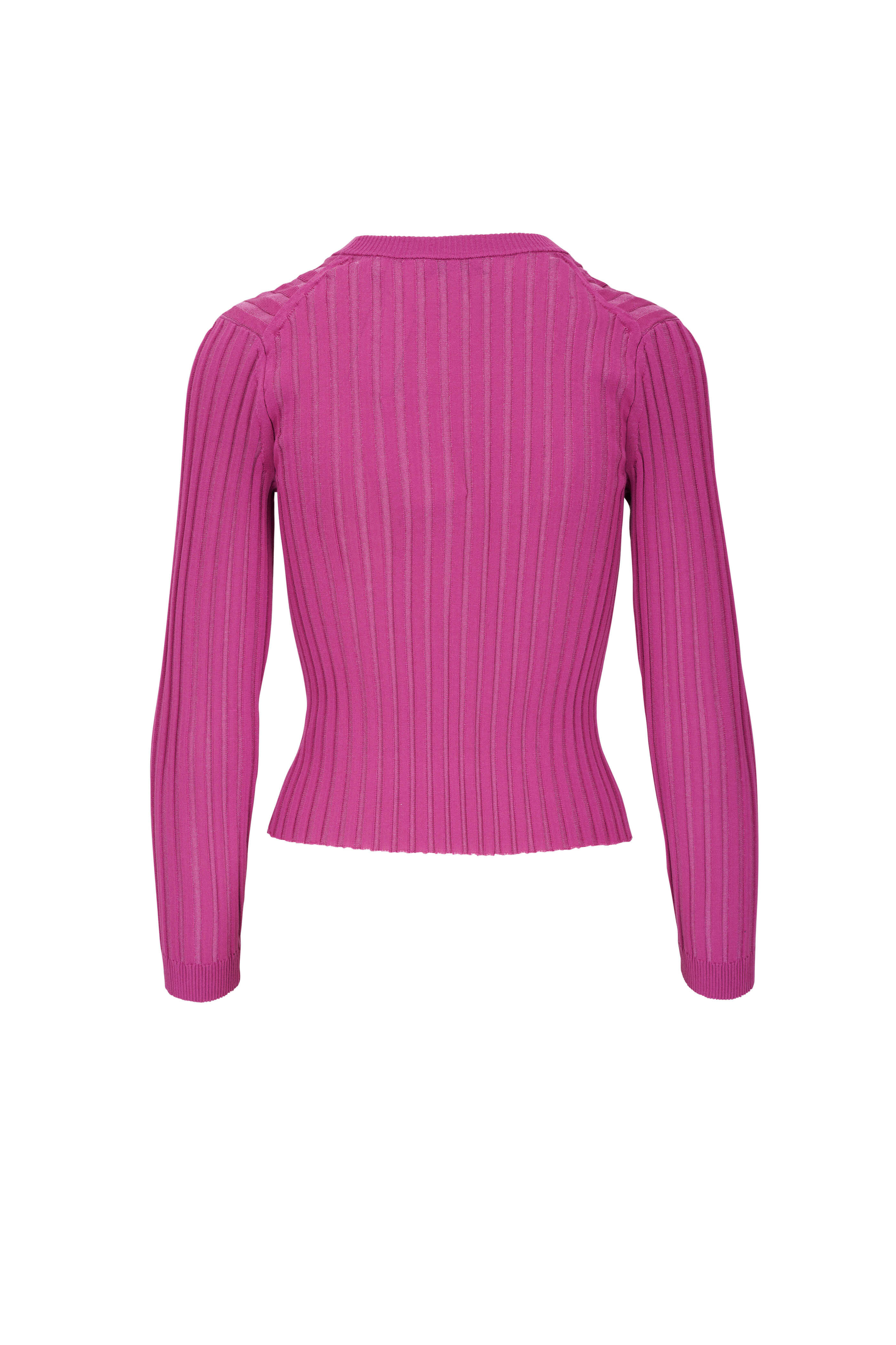 V-neckline. Front button placket. Allover wide ribbed knit. Ribbed trims. Imported. Color: Rosea. 20" shoulder to hem. 73% cotton, 27% polyester. Machine wash.