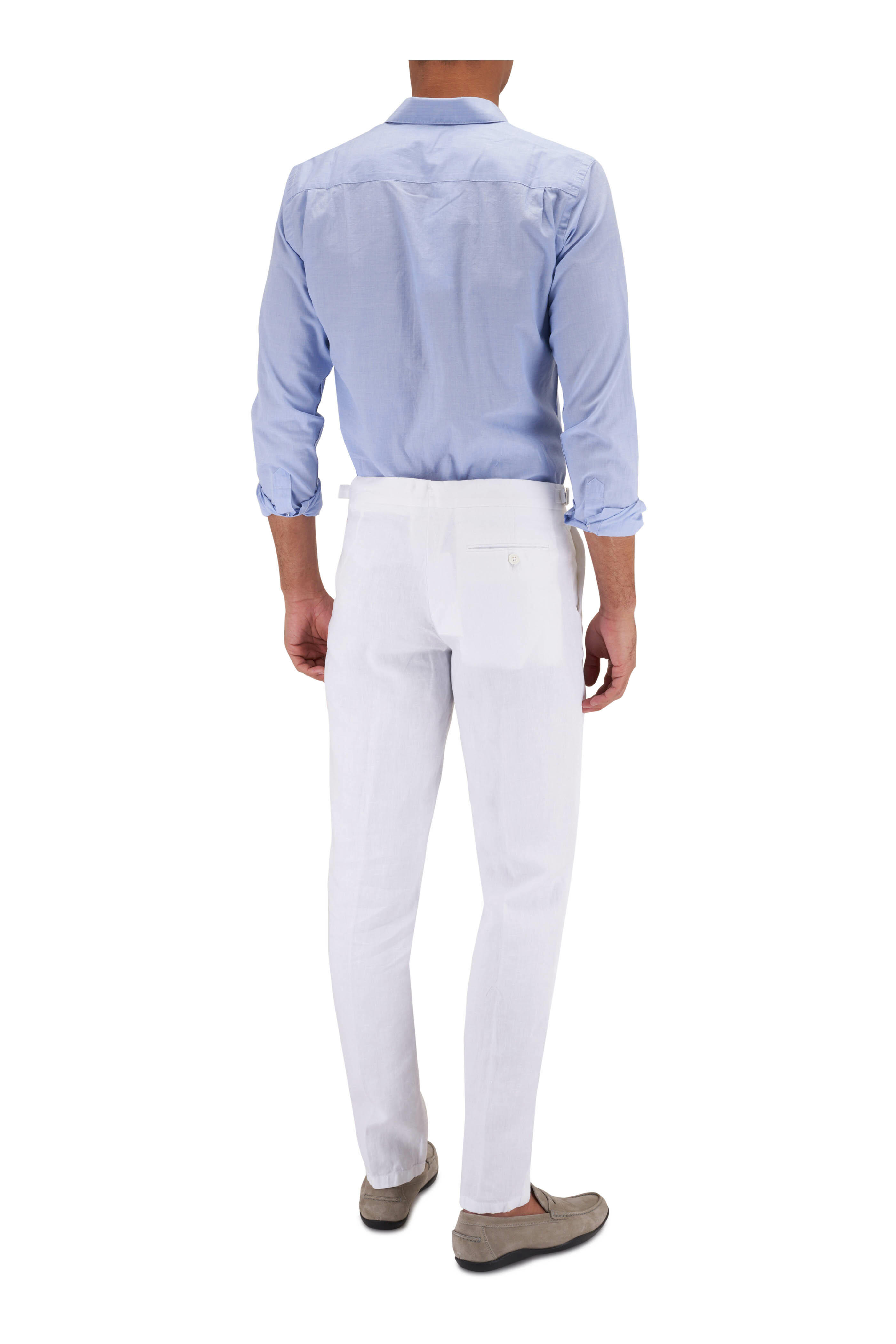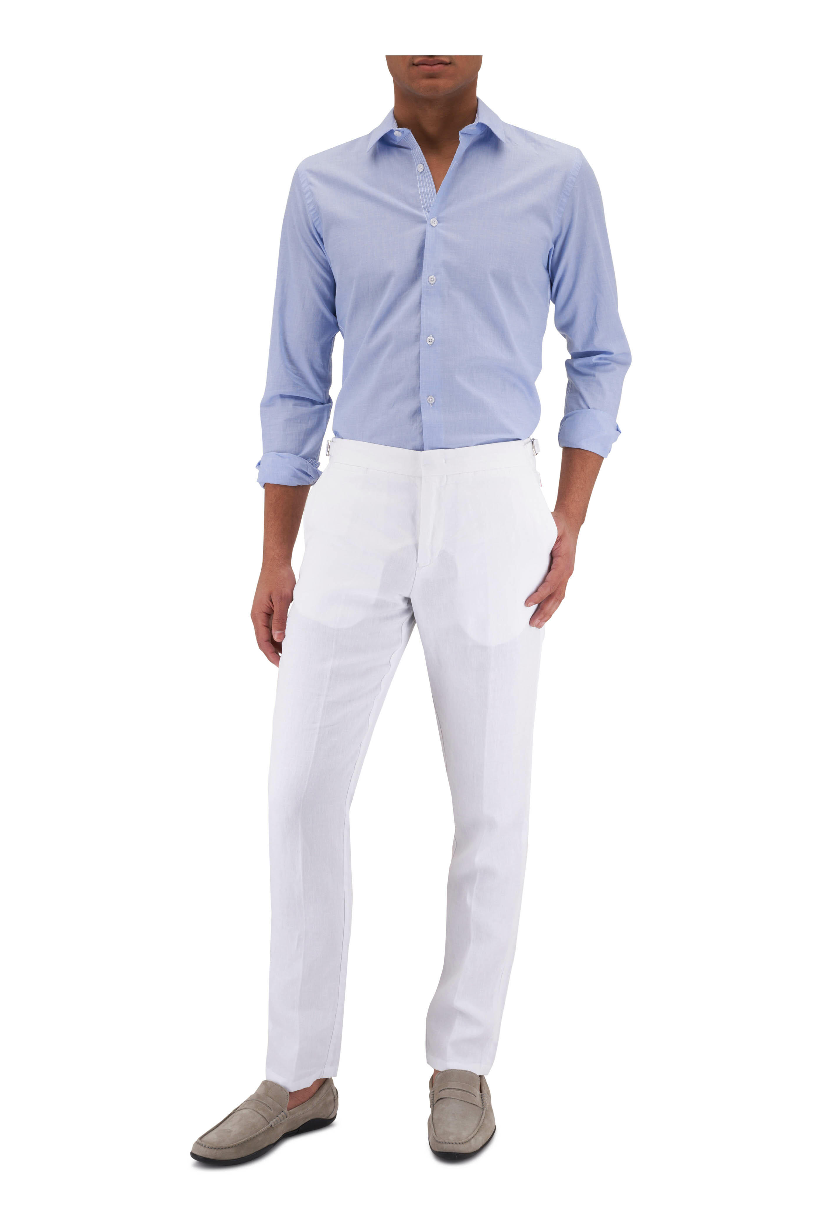 Pointed collar. French placket. Single button mitered cuffs. Curved hem. Imported. Tailored fit. 100% cotton. Machine wash.