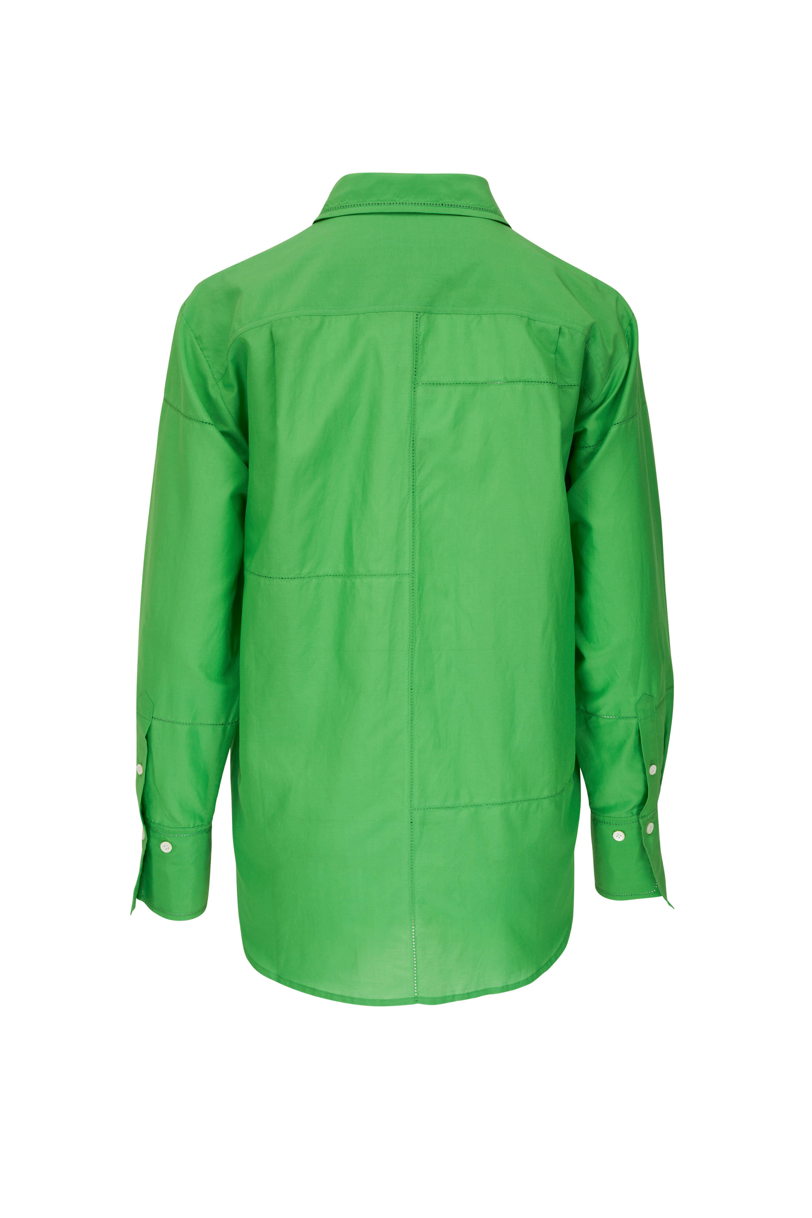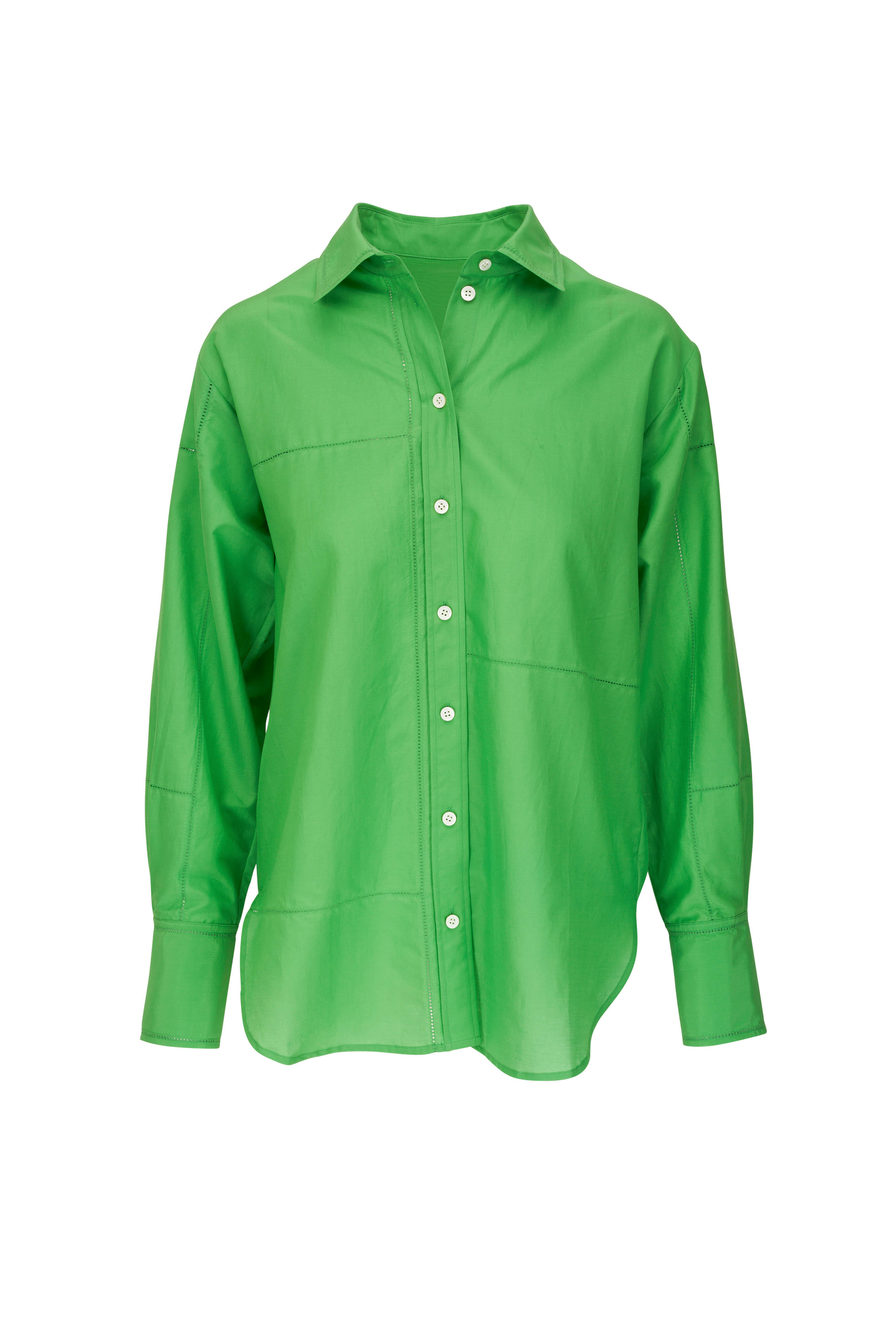 Spread collar. Front button placket. Ladder lace detailing. Imported. Intended to be worn oversized. 30" shoulder to hem. 70% oraganic cotton, 30% silk. Dry clean.