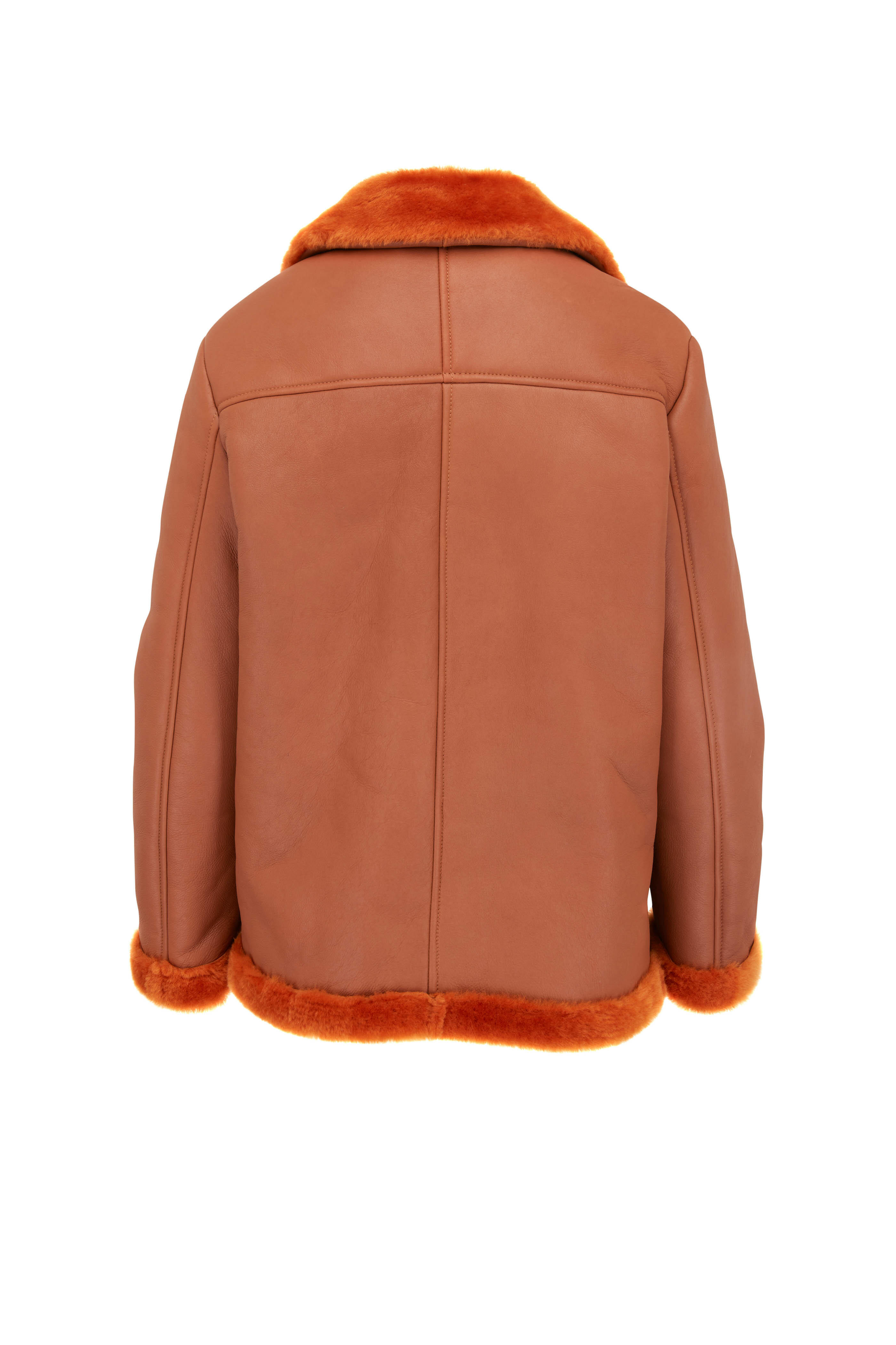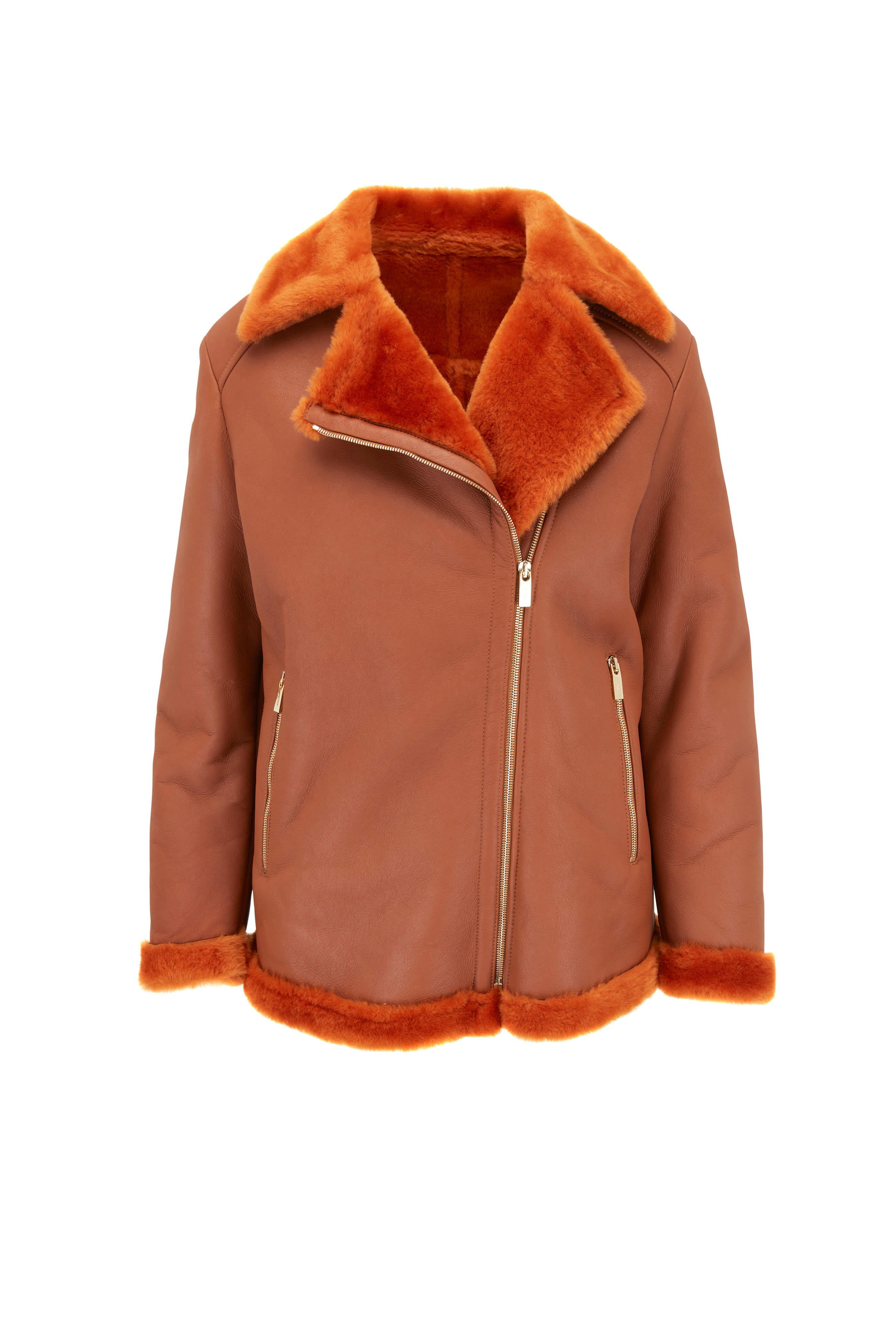 Specialist clean. Notched lapels. Asymmetric front zip; Lower waist zip pockets. Shearling cuffs and hem. Country of Origin: Spain. 100% lambskin leather; Shearling.