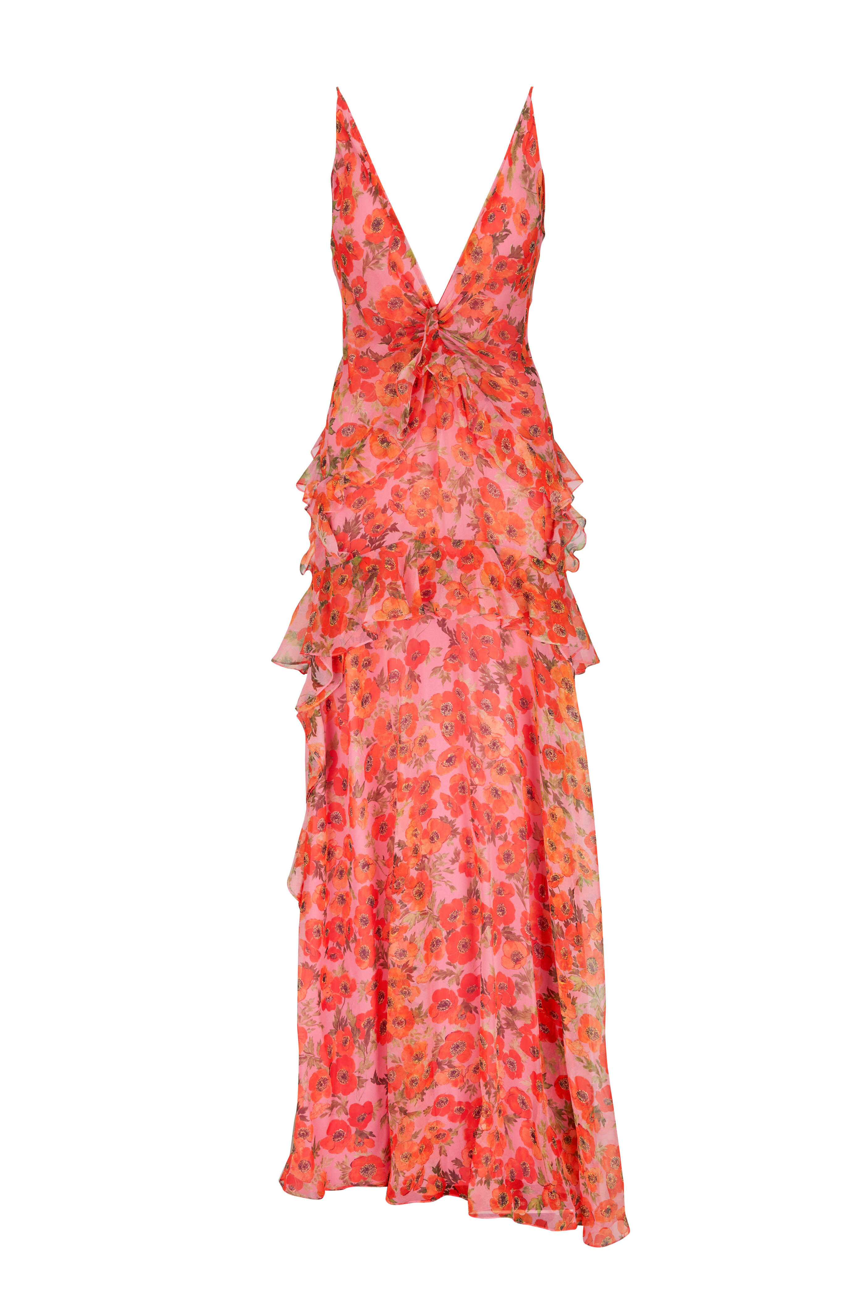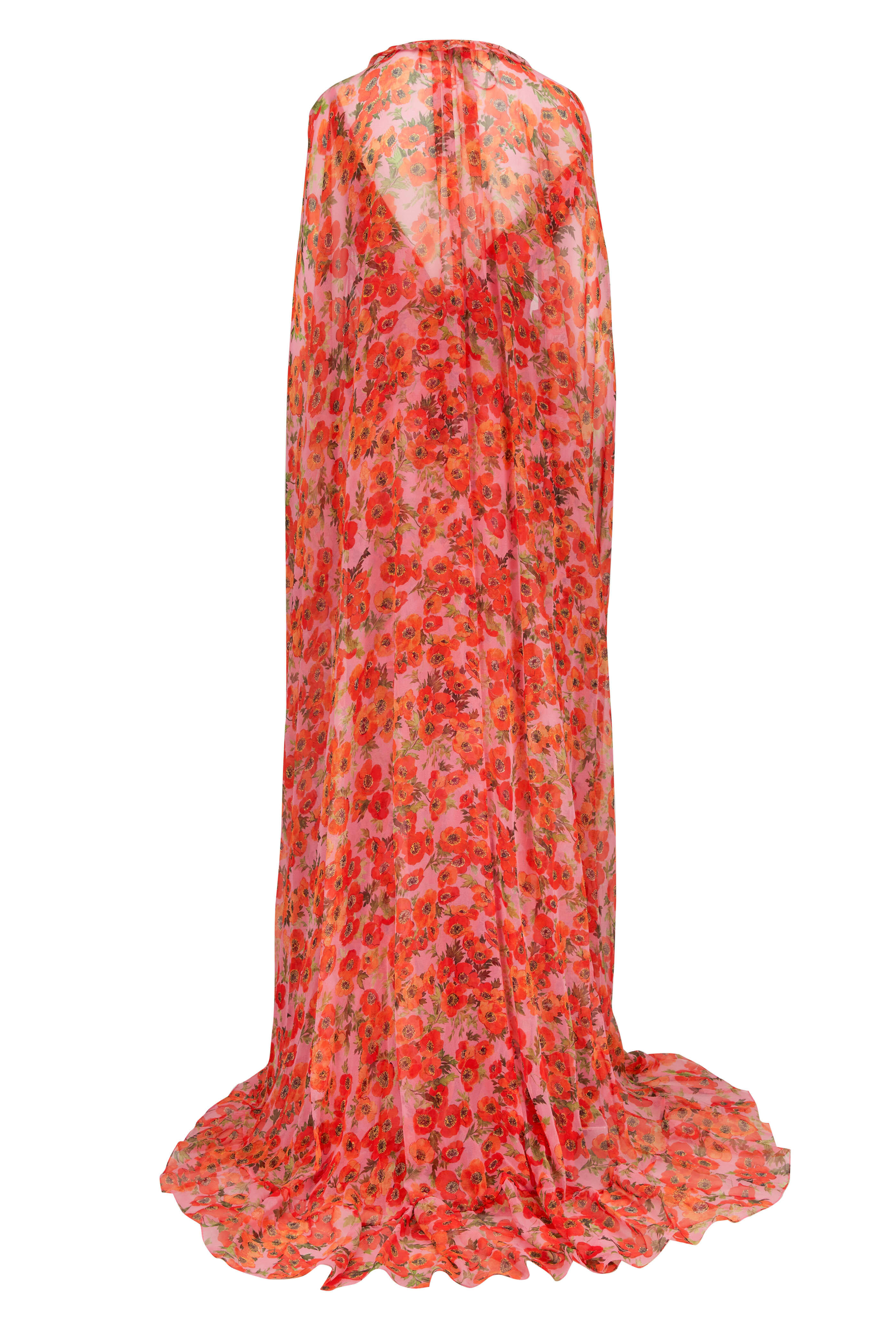 V-neckline. Concealed back zip closure. Gathered waist; ruffle trim. Floor sweeping hem. Detachable cape. Made in the USA. Floor length. 100% silk. Dry clean.