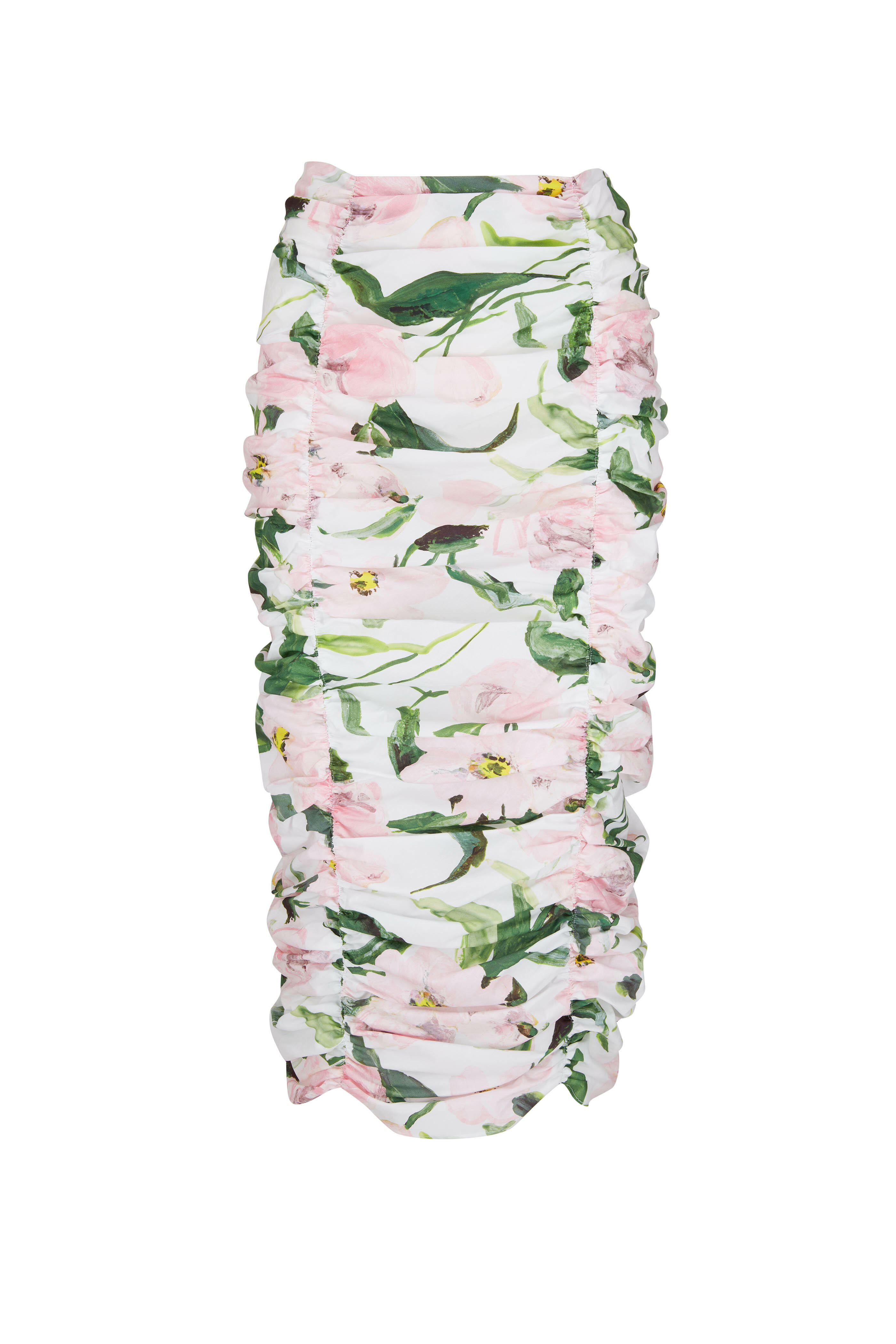 Elasticized waistband. Concealed back zip closure. Ruched panel detailing. Made in Italy. 38" length. 97% cotton, 3% elastane. Dry clean.