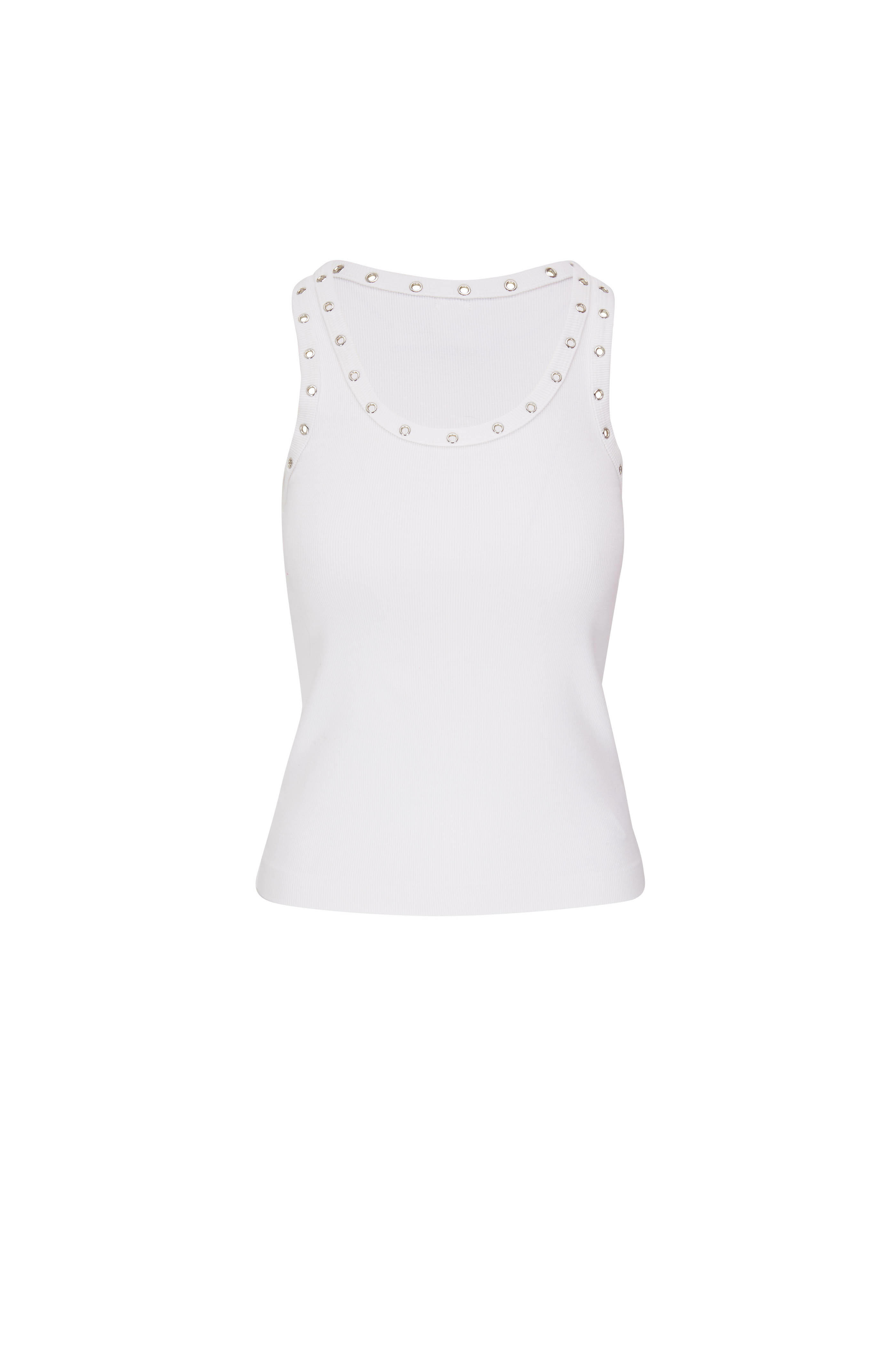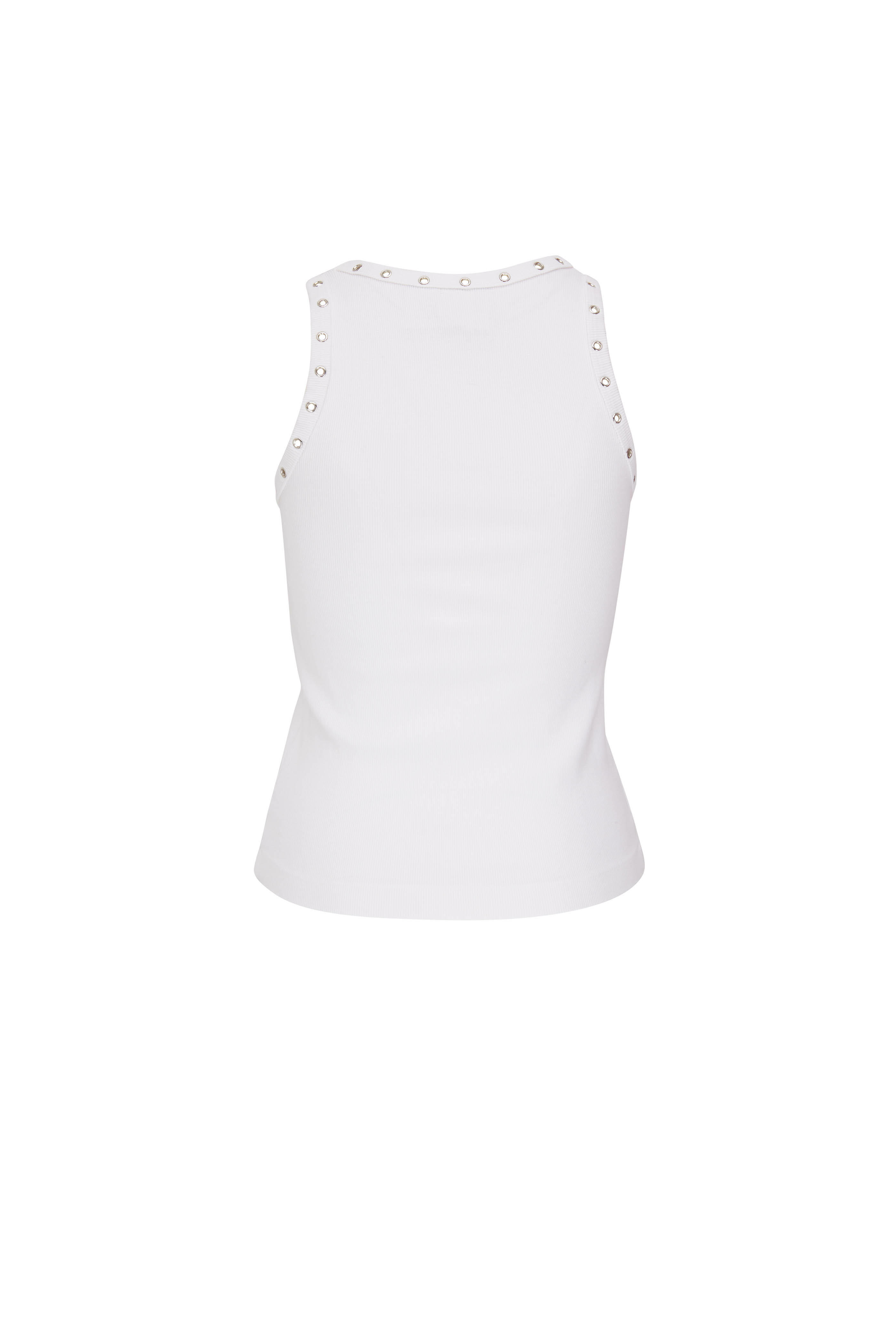 Scoop neckline with with metal eyelets. Sleeveless. Straight hem. Made in the USA. Classic fit. 96% cotton, 4% spandex. Machine wash.