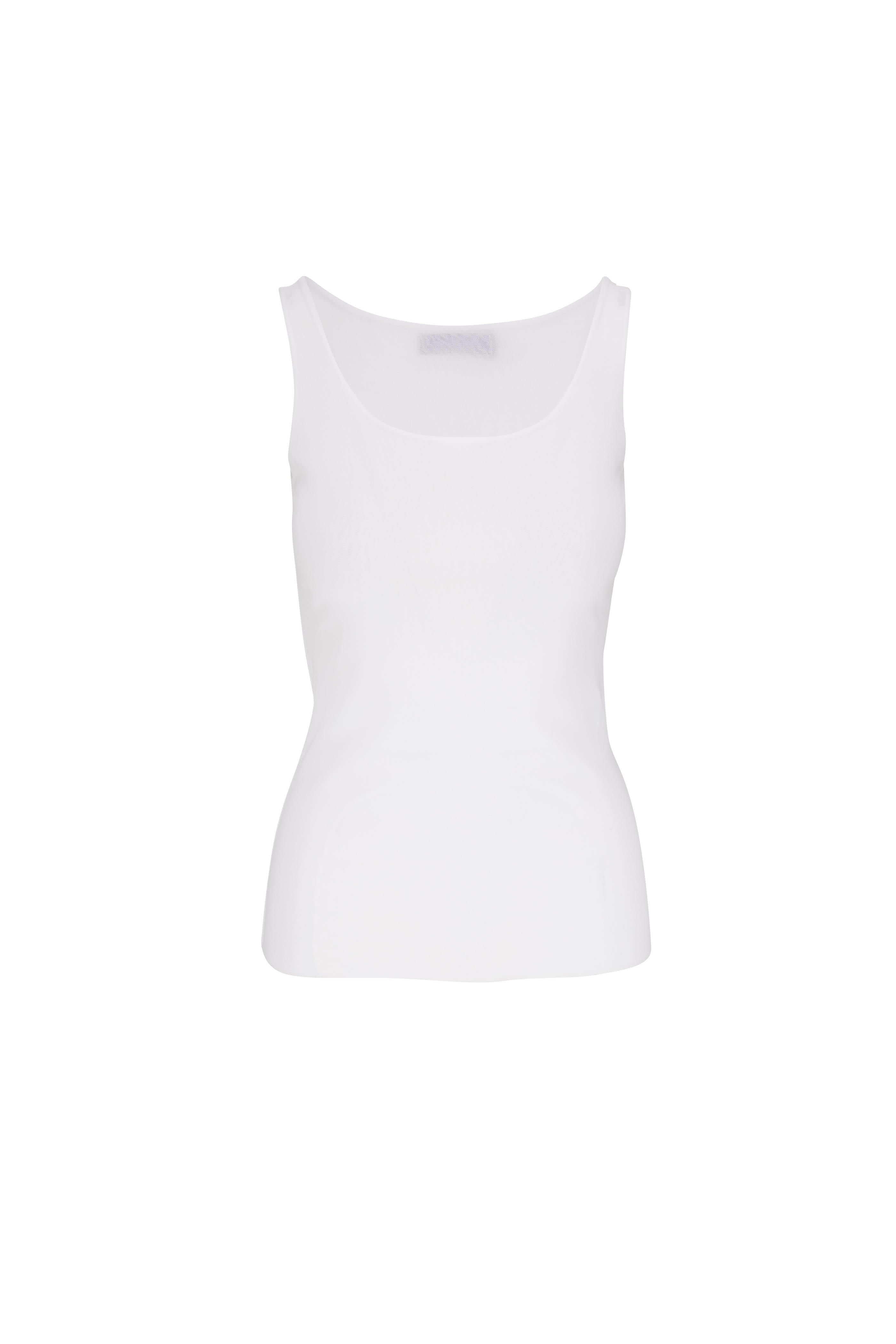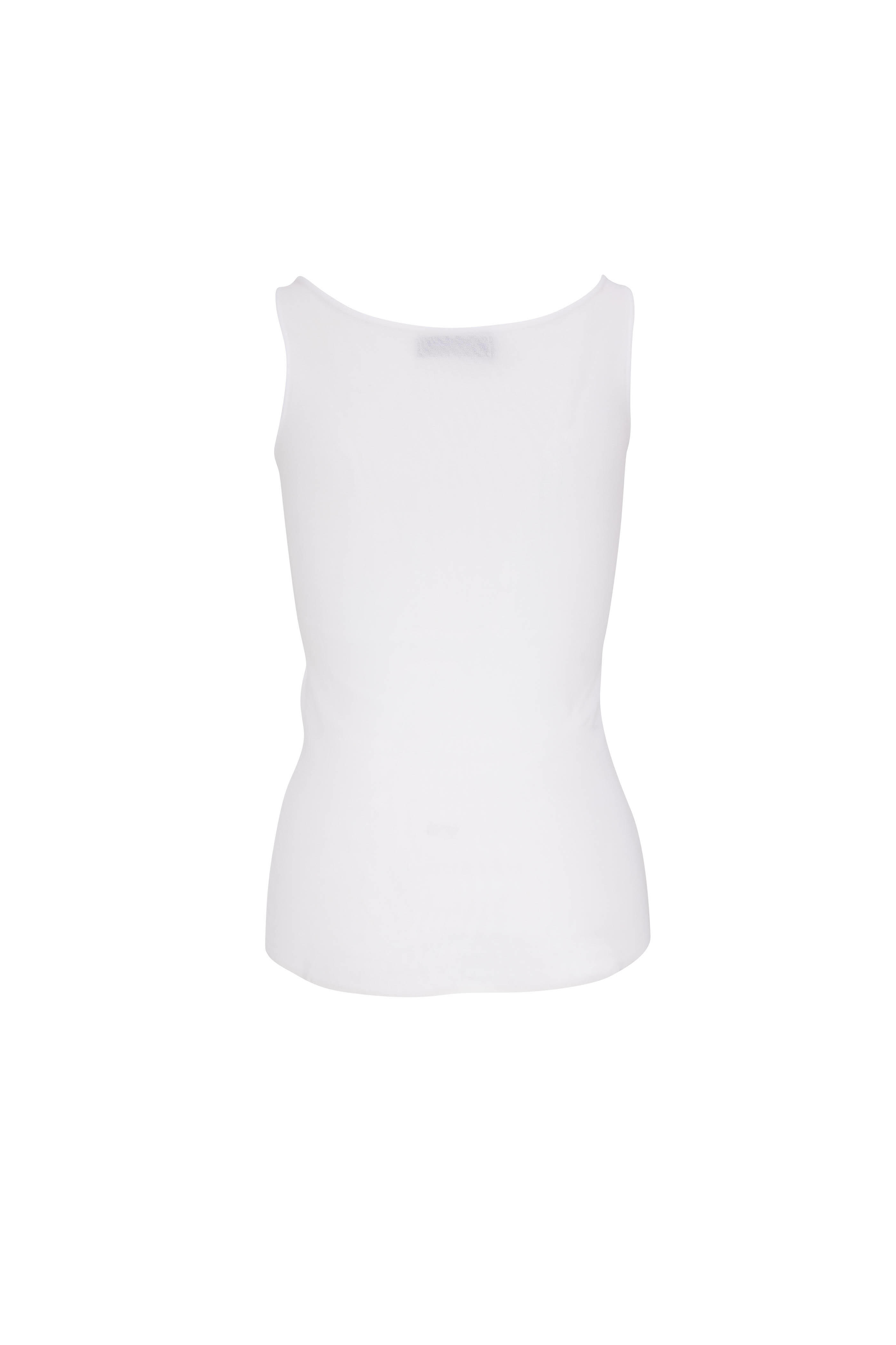Scoop neckline. Raw edge hem. Made in Italy. 100% nylon. Machine wash.