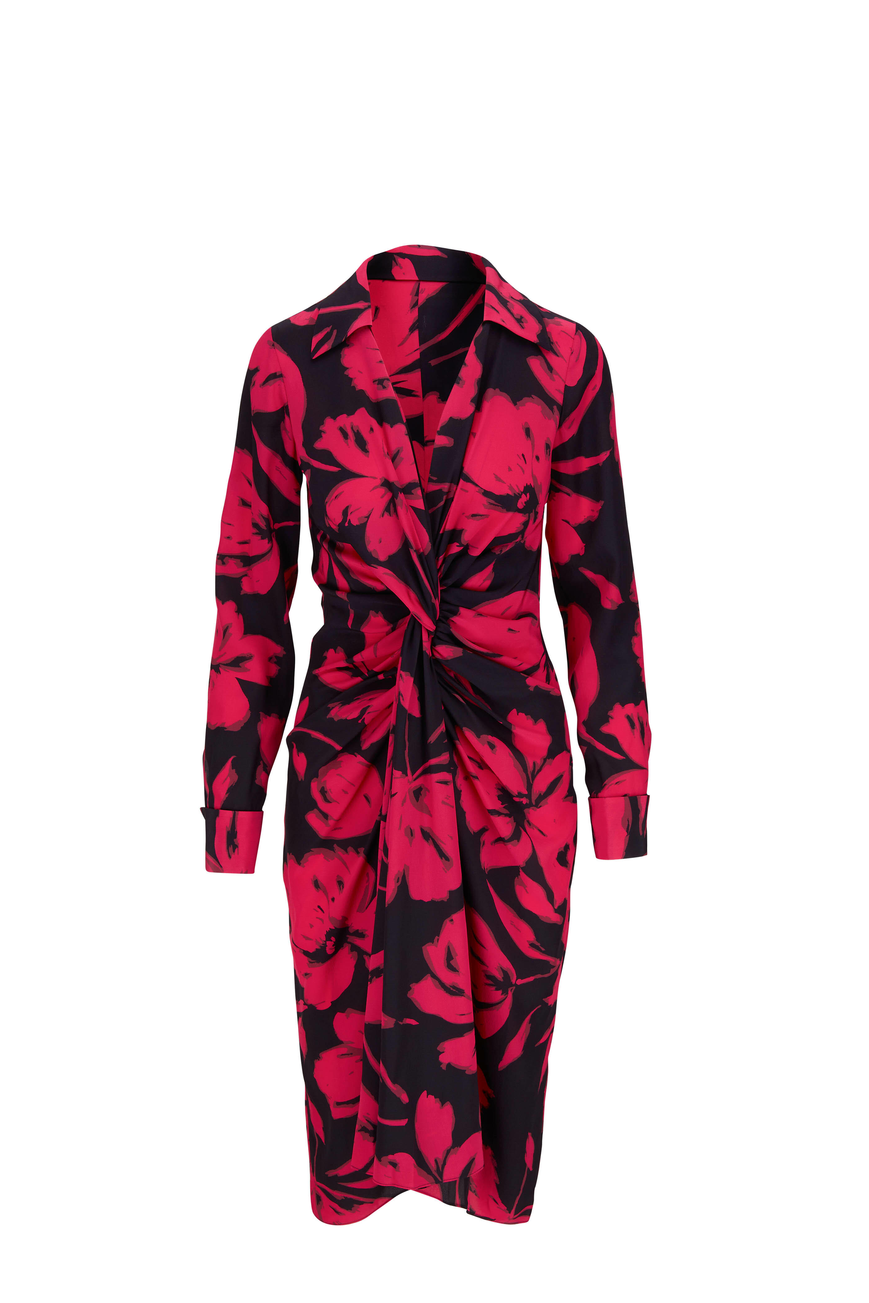 Pointed collar with v-neckline. Gathered waist detailing. Imported. 46" shoulder to hem. 100% silk. Dry clean.