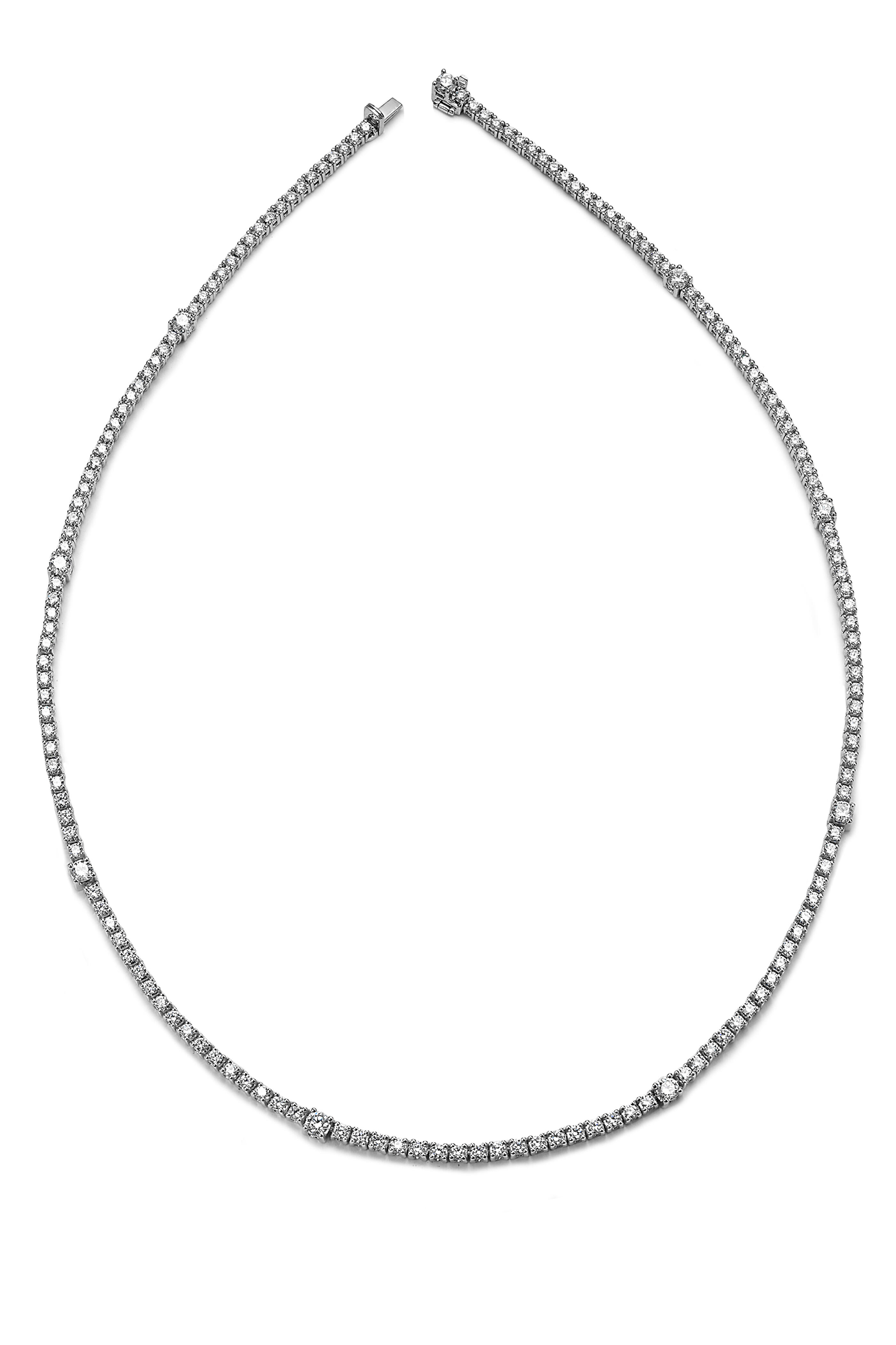 18K White Gold. Round Cut Diamonds: 4.85 tcw. Secure Box clasp. Measures: 16" Long.
