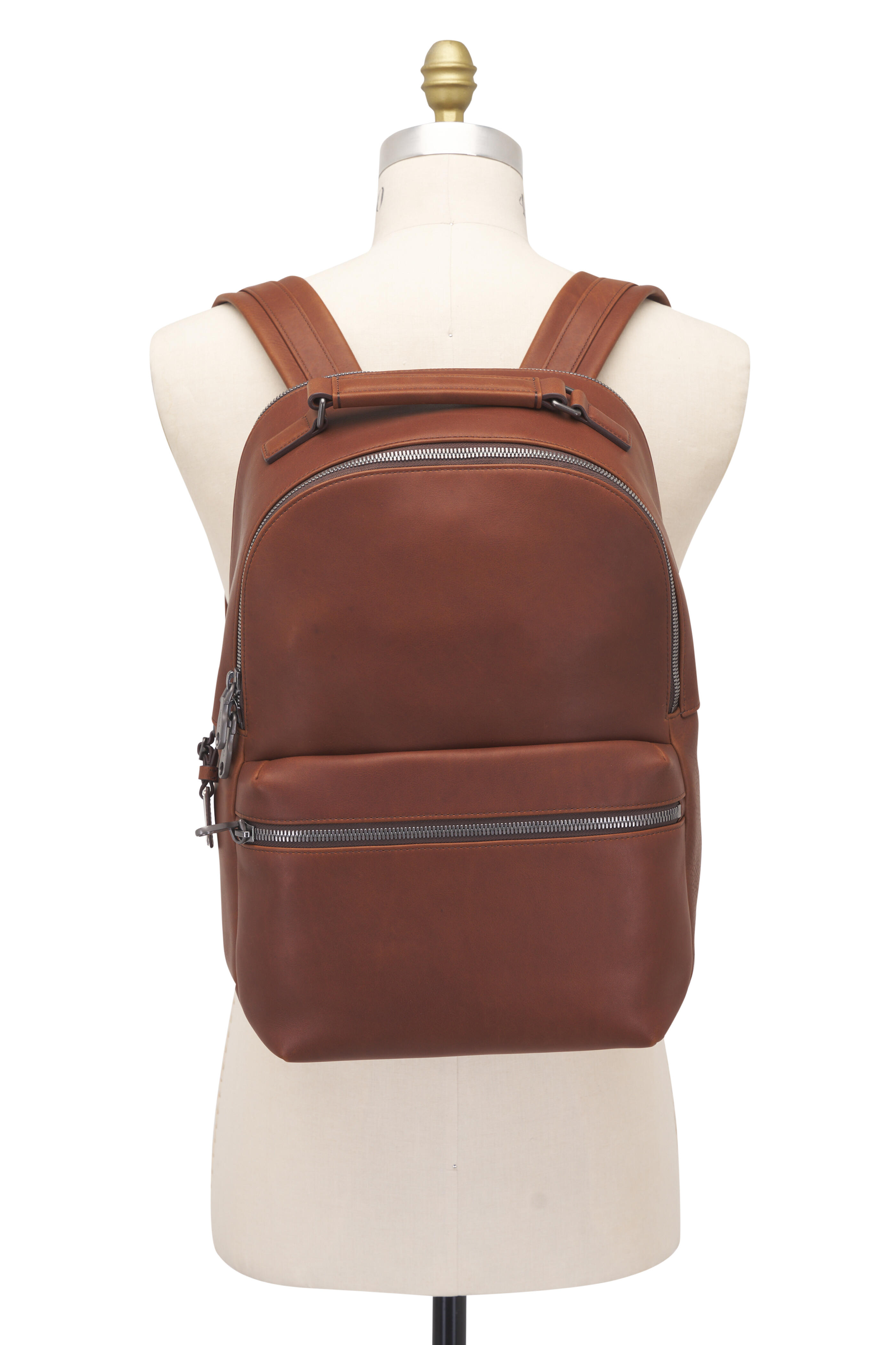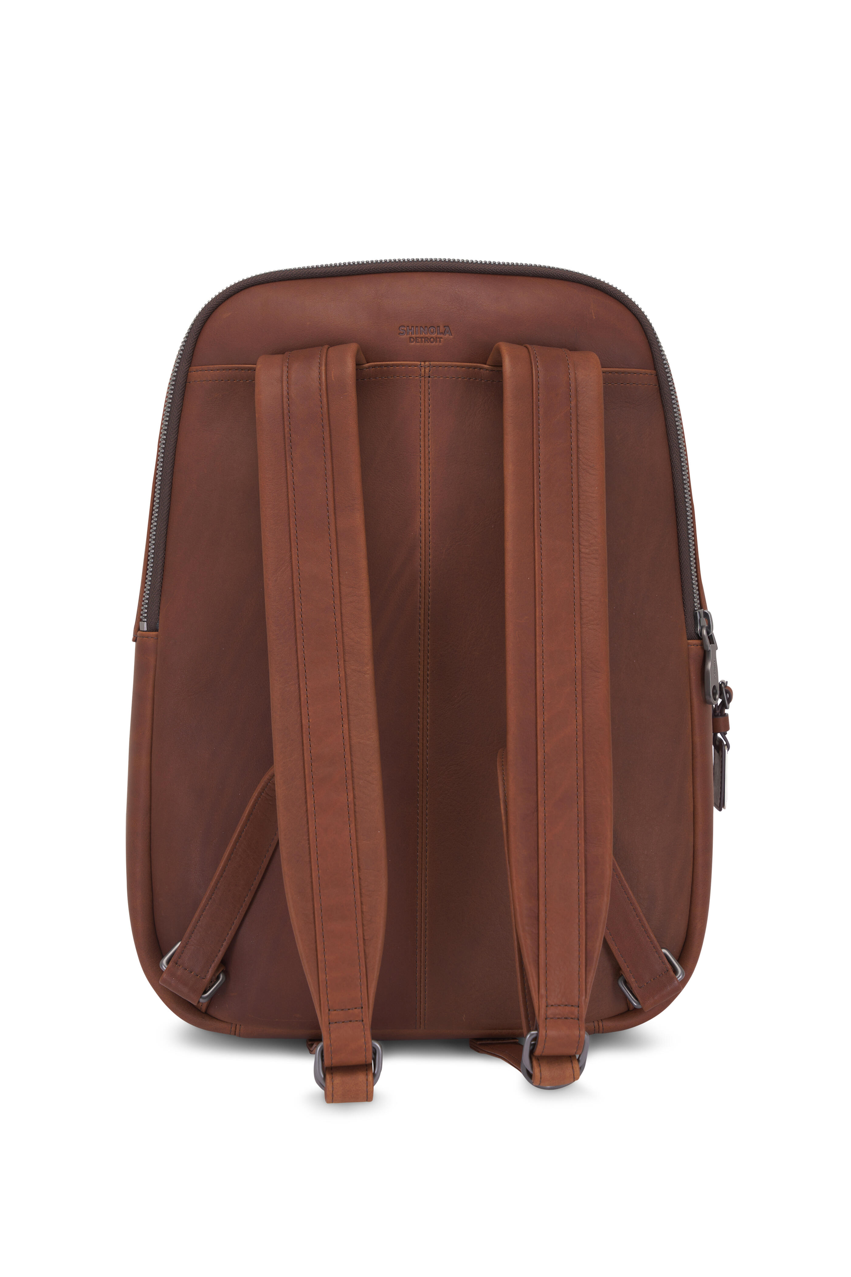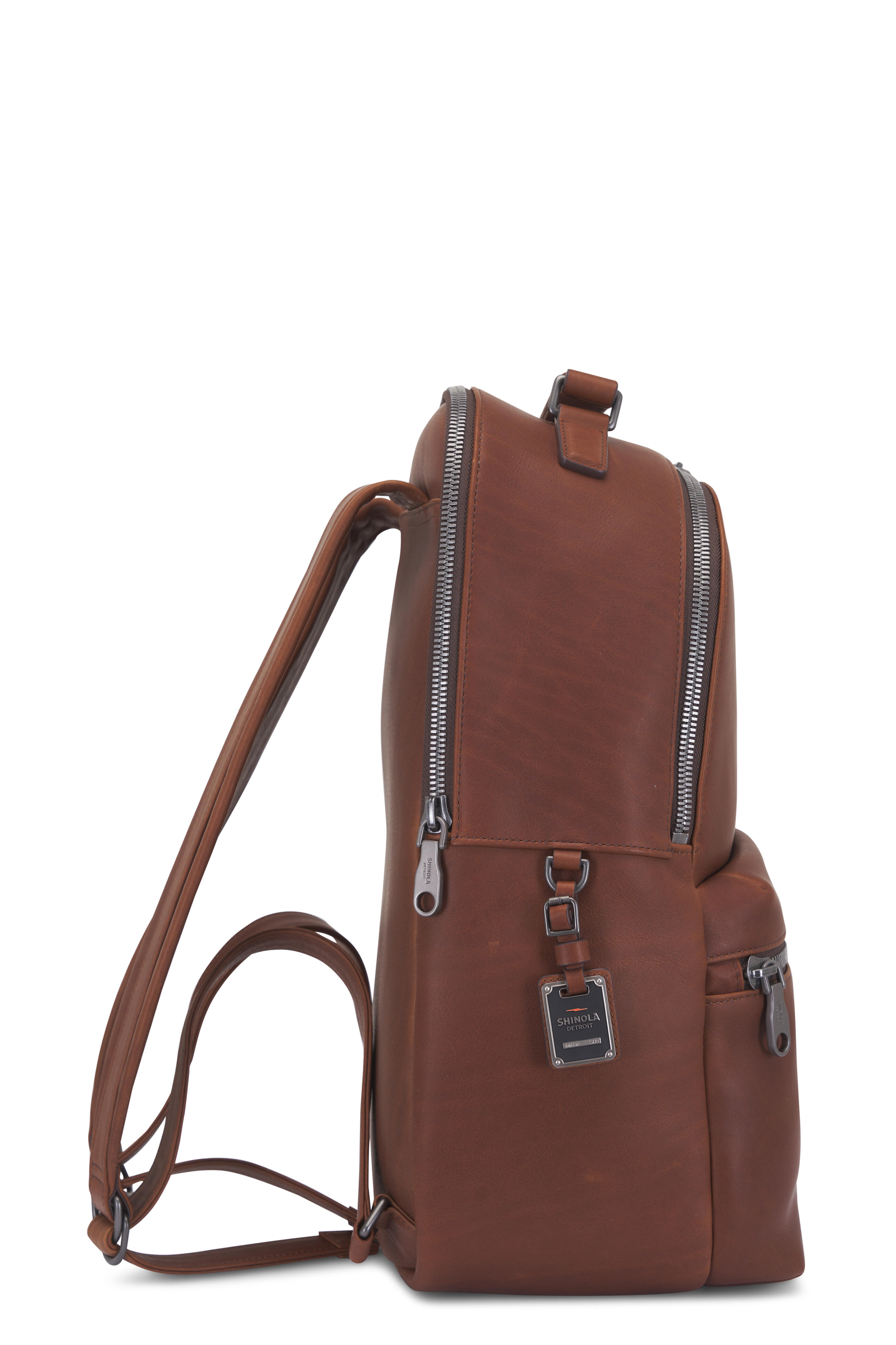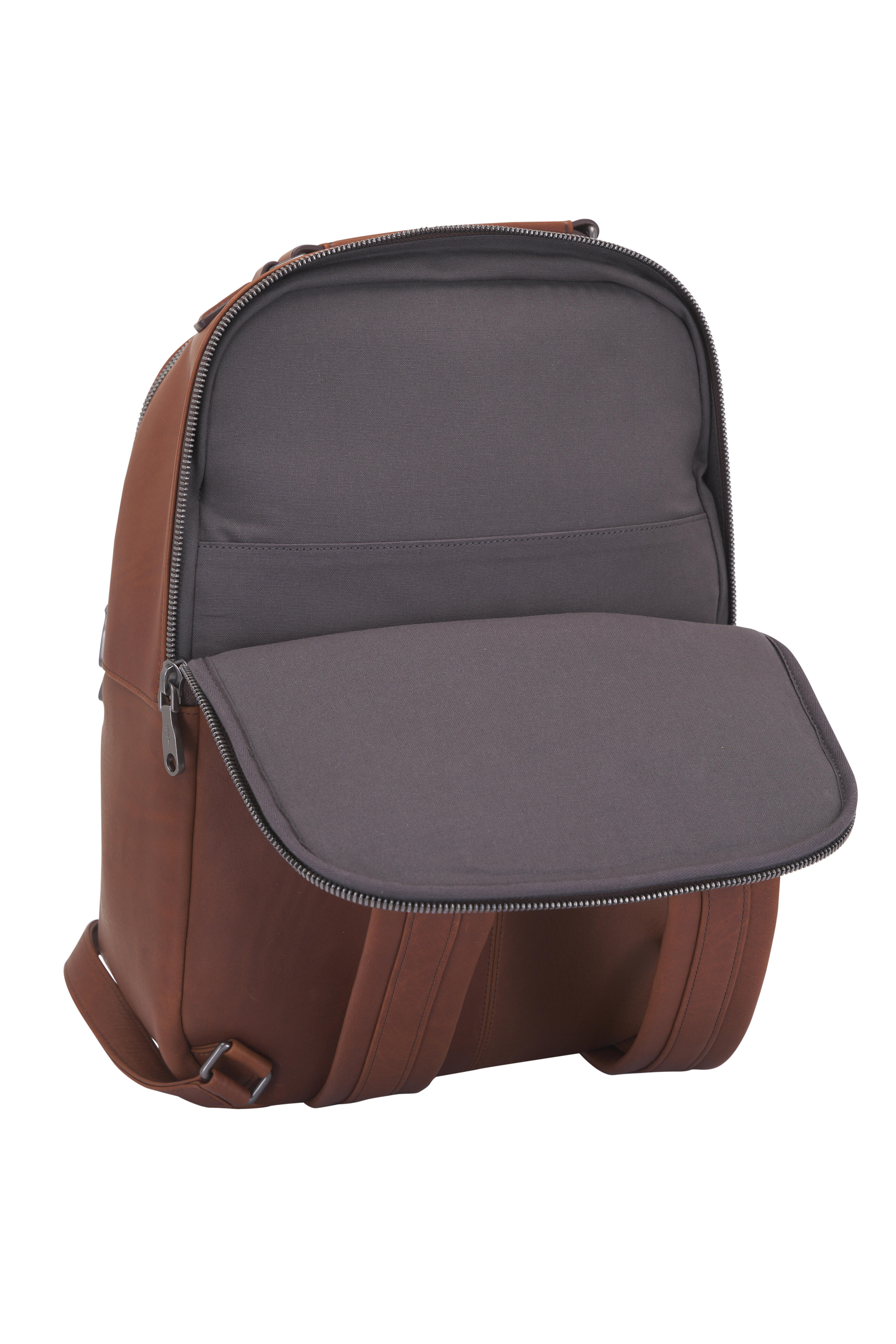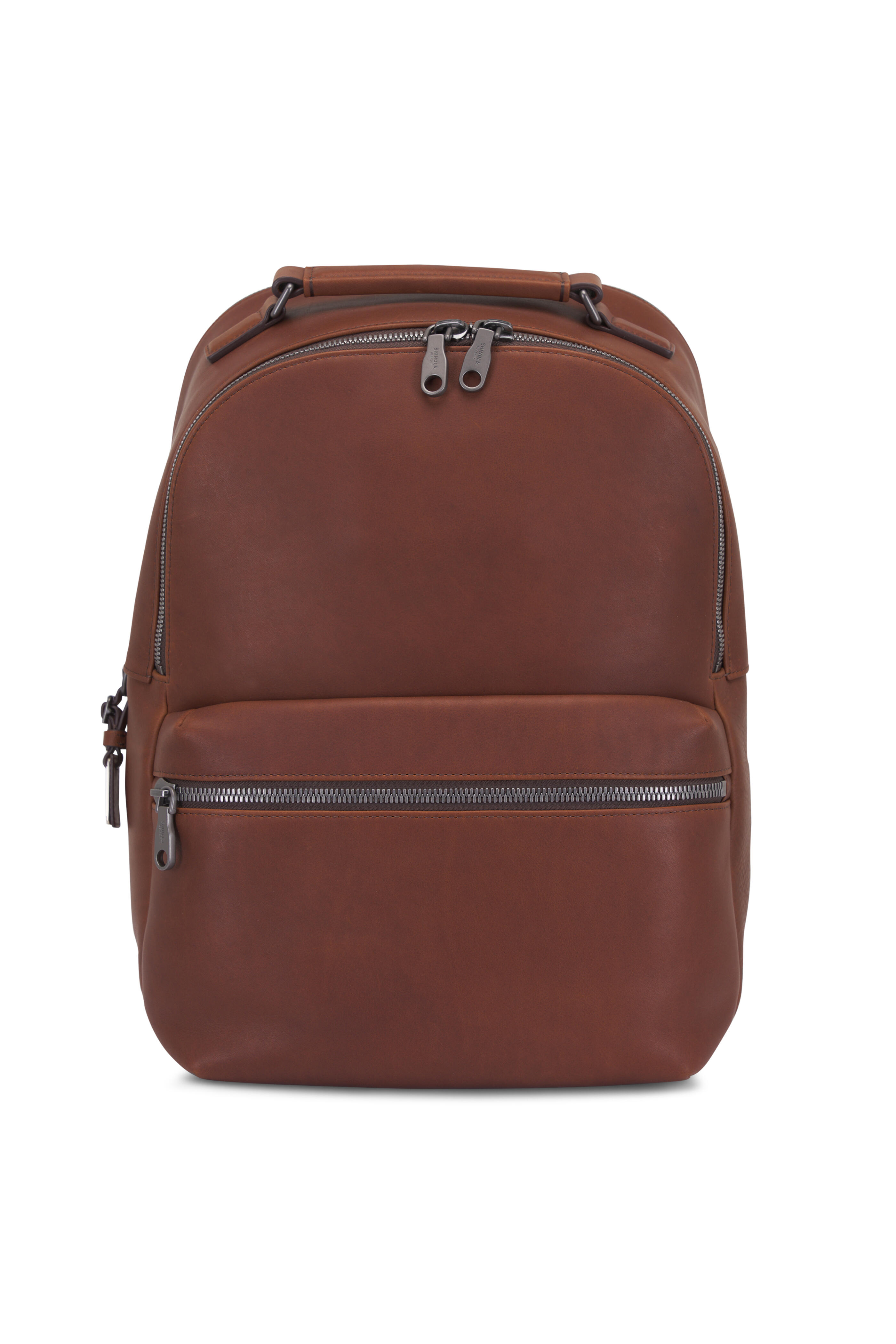 Navigator leather. Leather top handle. Adjustable shoulder straps. Top zip closure. Exterior zipped compartment. Zipped padded laptop compartment. One interior zip pocket and one card slot. Lined in cotton canvas. Made in the USA. Width: 10.38". Height: 17". Depth: 6".