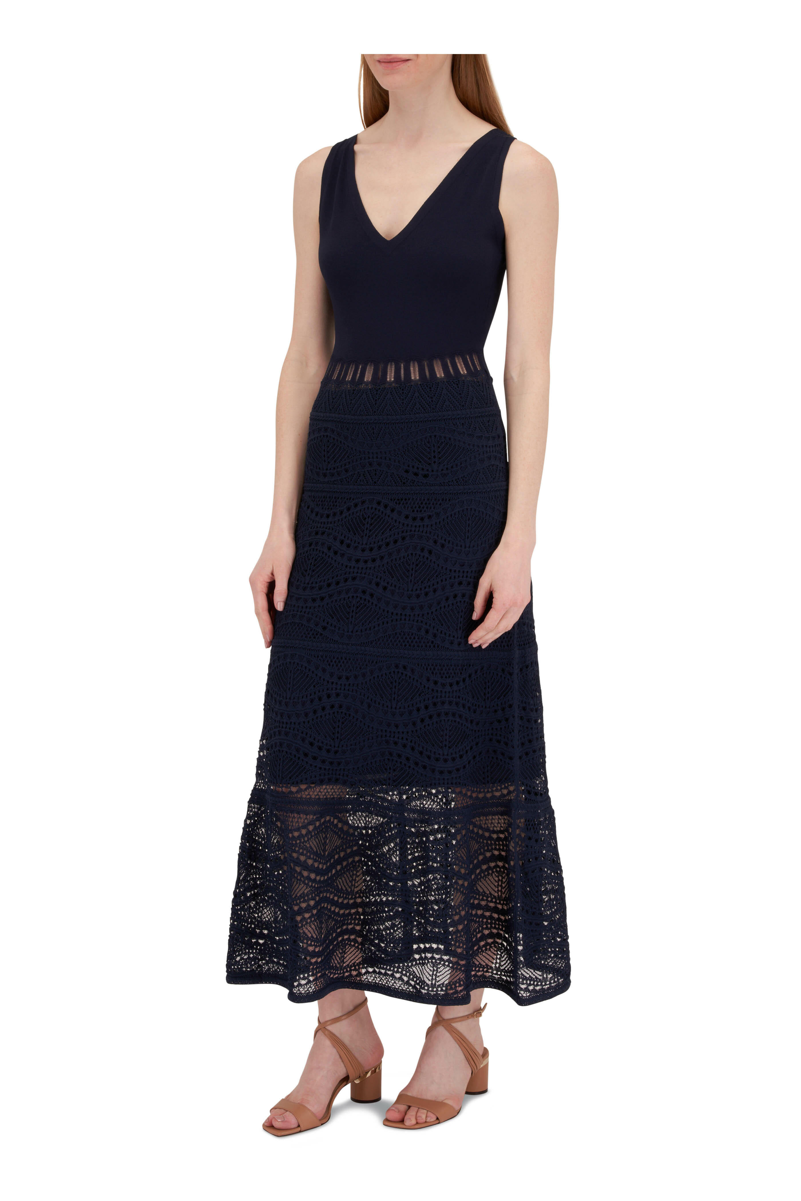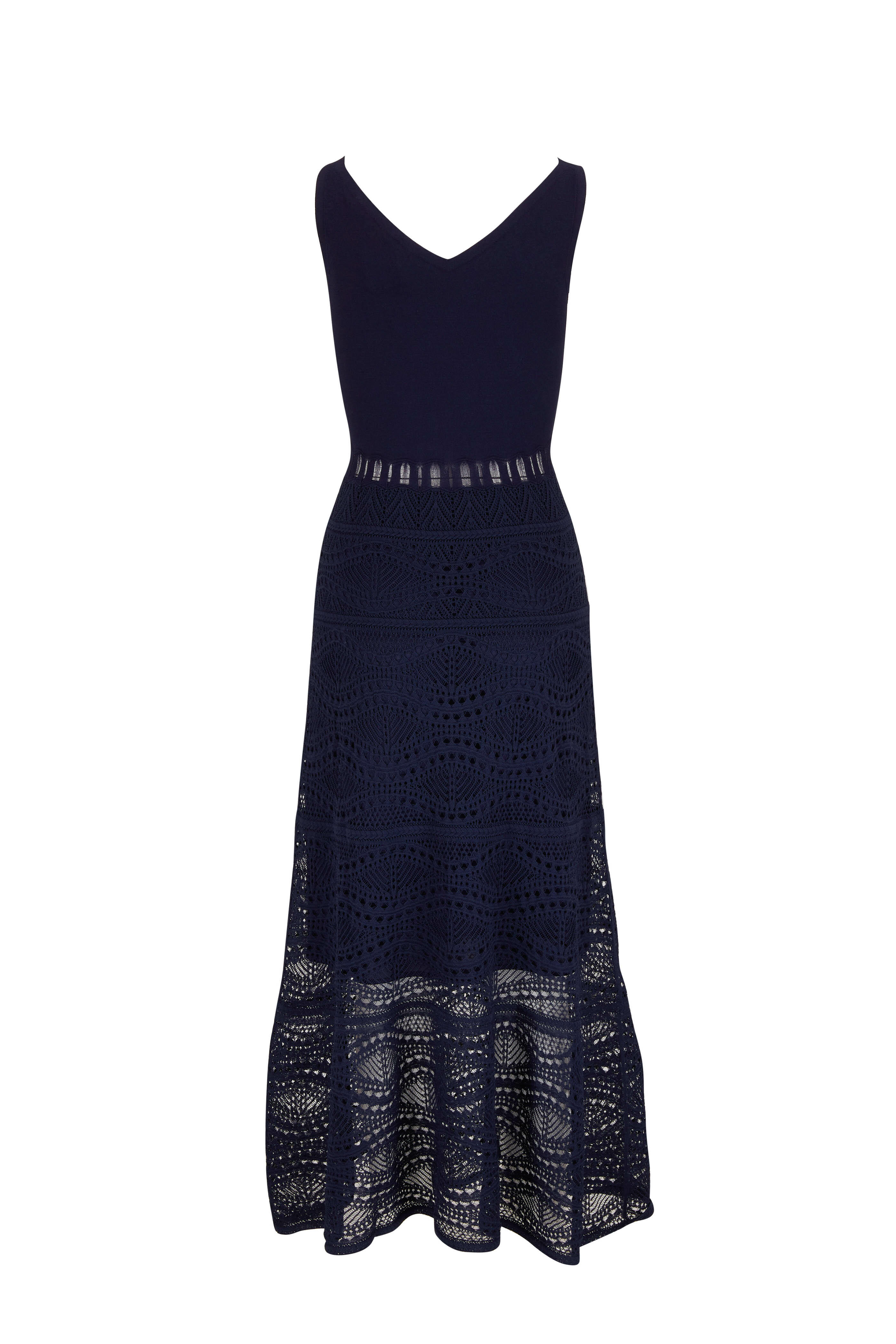 V-neckline and back. Slip on style. Corset-inspired waistline. Pointelle knit skirt. Made in Italy. 55" shoulder to hem. 100% nylon; skirt lining: 65% cotton, 14% viscose, 16% nylon, 5% polyester. Dry clean.