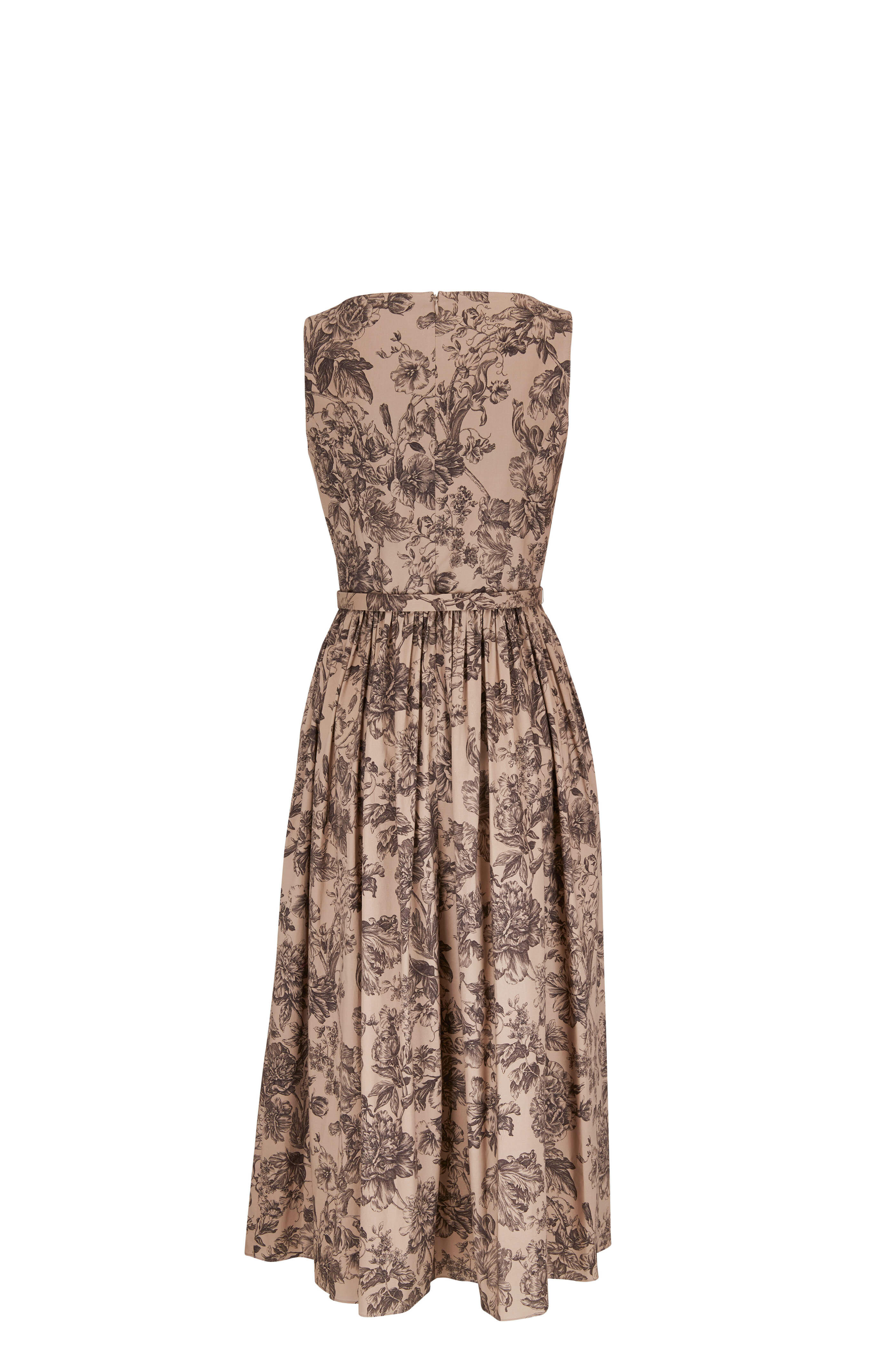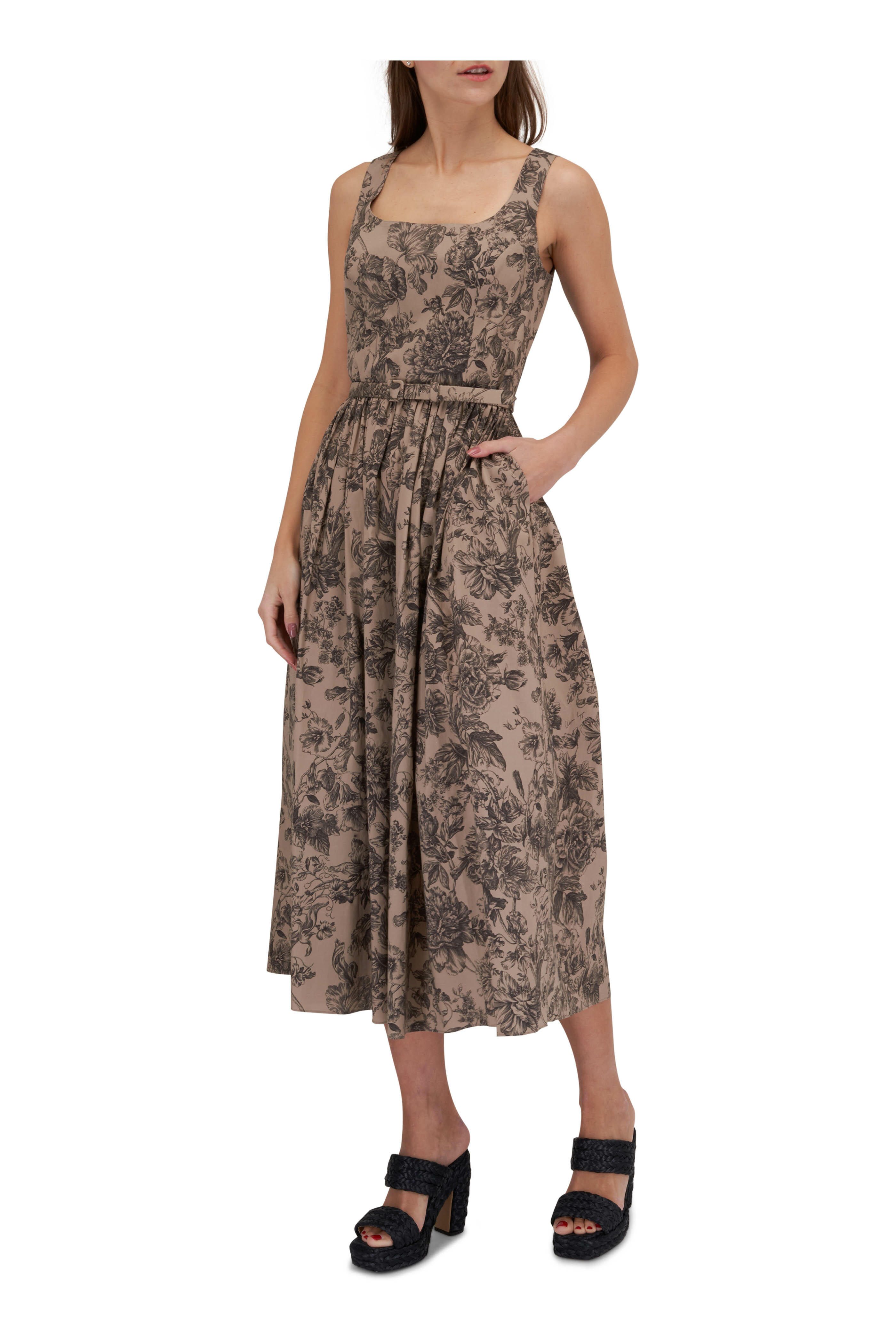 Scoop neckline. Concealed back zip. Removable self-belt. On-seam pockets. Gathered at waist. Made in the USA. 96% cotton, 4% elastane. Dry clean.
