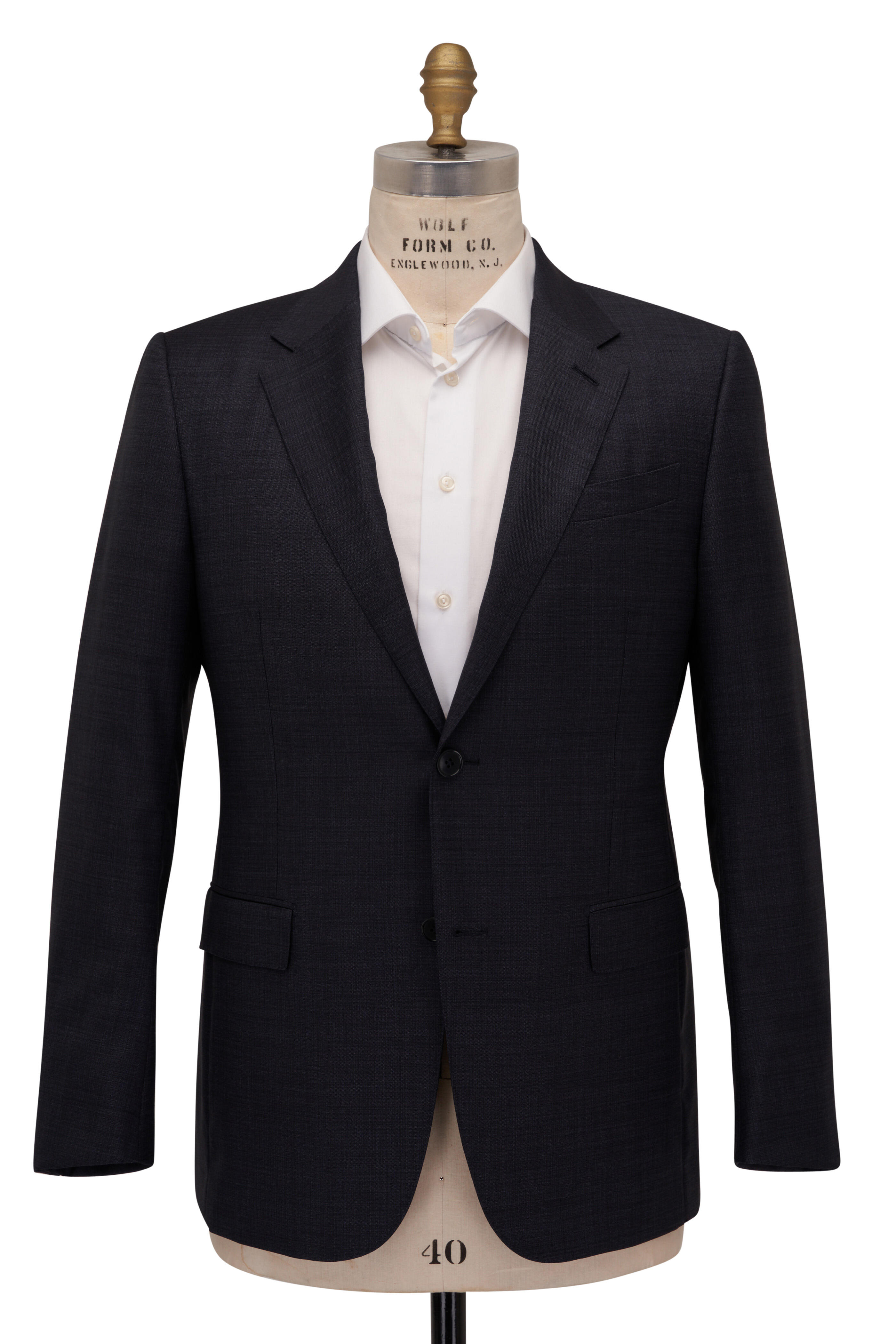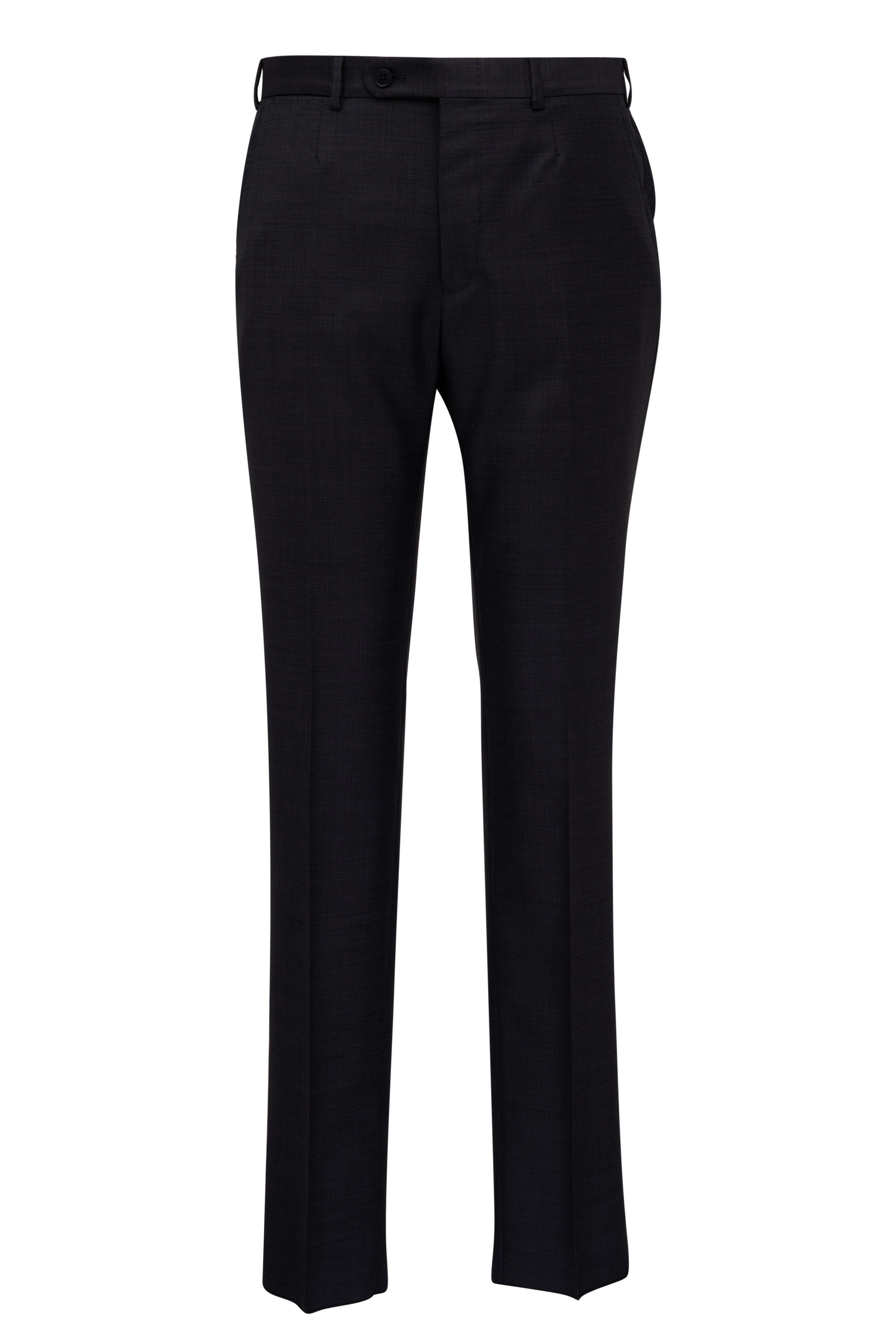 Made in Italy. Jacket: Fully lined. Notched lapels. Two button closure. Lower flap pockets; chest welt pocket. Double vent. Pants: Banded waist; belt loops. Front slip pockets; coin pocket; back besom pockets. Unfinished hem. 100% wool. Dry clean.