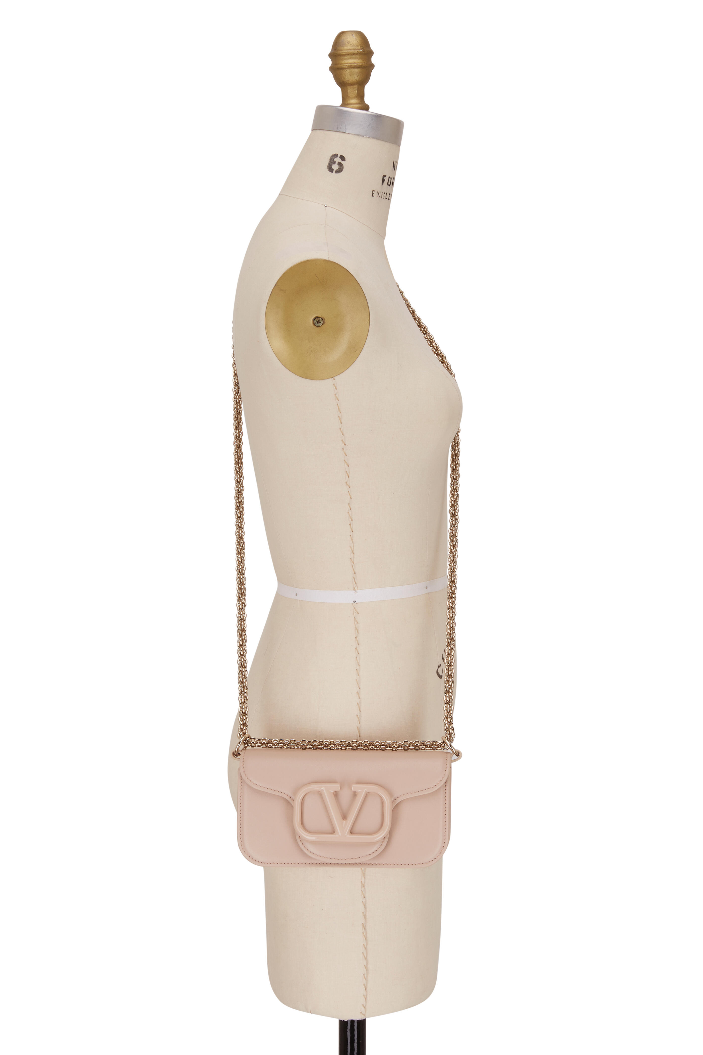 Leather. Detachable flat shoulder strap. Detachable chain crossbody strap can be doubled. Envelope flat top with VLOGO magnetic closure. One main compartment. Interior slip pocket. Leather lining. Made in Italy. Width: 7 ¾". Height 4". Depth: 2". Strap drop: 5". Single shoulder chain drop: 21". Double shoulder chain drop: 12".