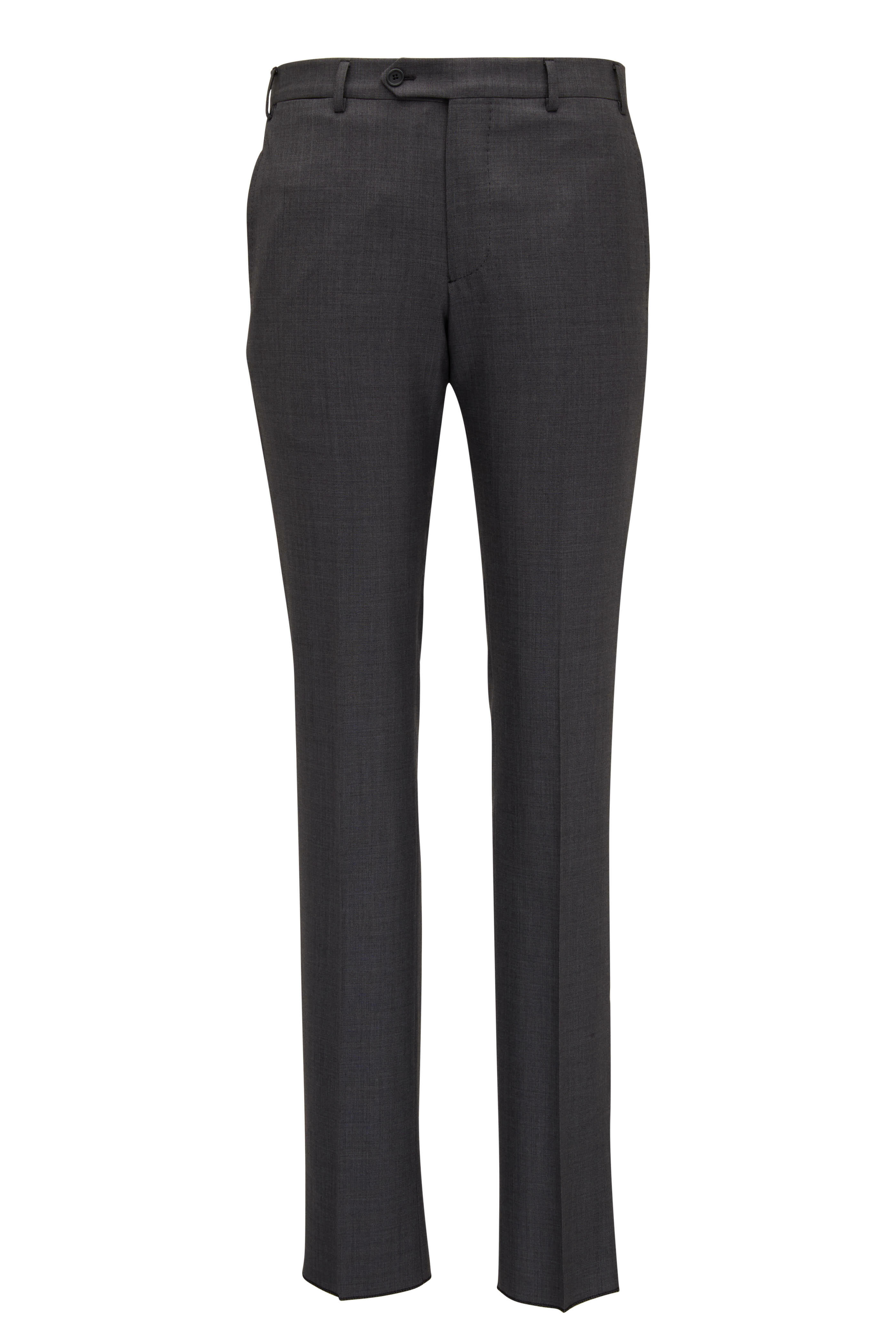 Made in Italy. Jacket: Notch lapels. Two button closure. Lower waist flap pockets; Chest welt pocket. Two interior chest pockets; pen pocket; lower waist pocket. Double vent. Pants: Zip fly with double button tab. Belt loops. Front slash pockets; back welt button pockets. 100% wool. Dry clean.