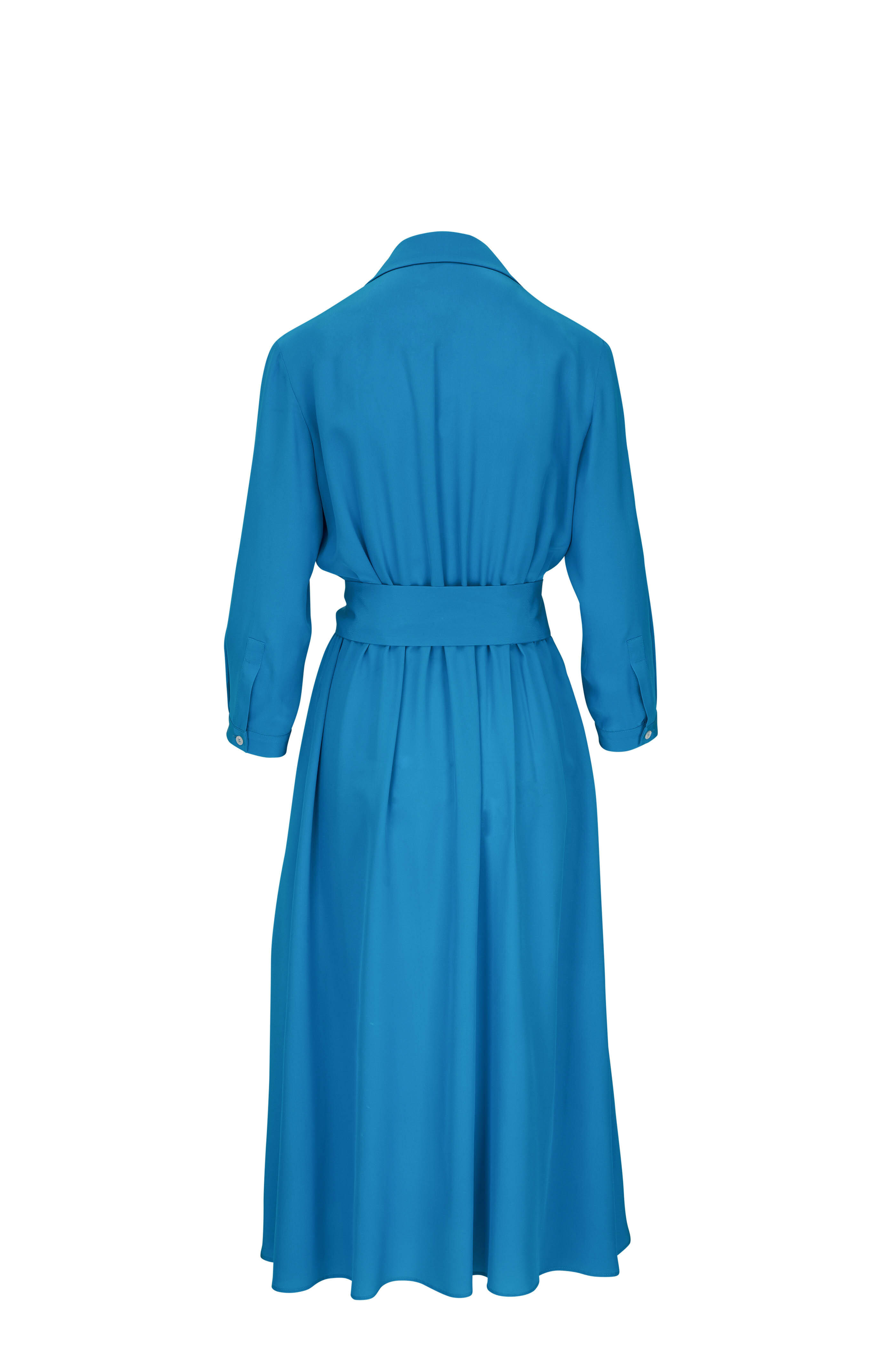 Notched lapels; deep v-neck. Button front wrap closure; self tie belt. Single button square cuffs. Side seam pockets. Made in Italy. 47" Shoulder to hem. 100% silk. Dry clean.