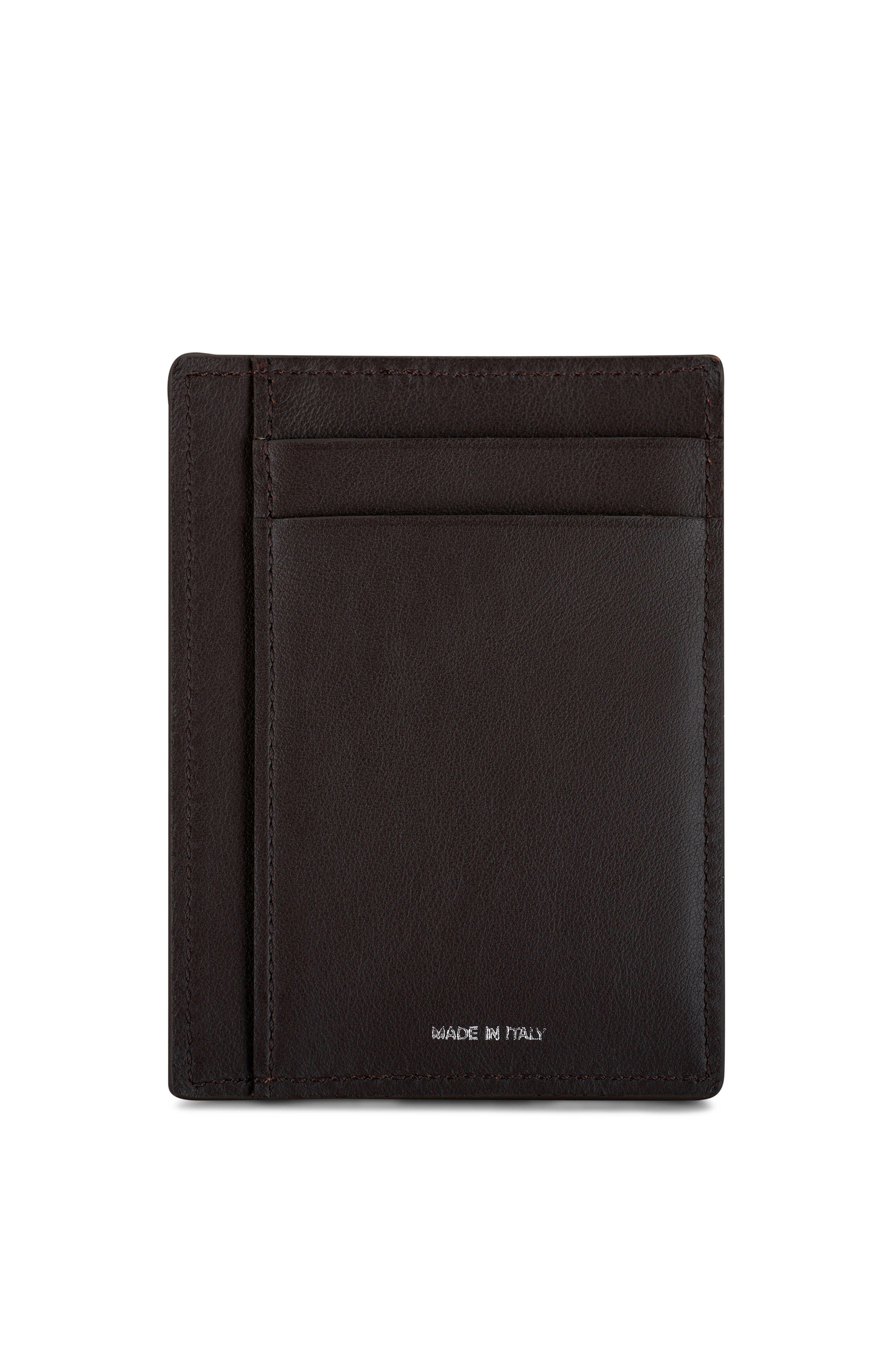 Two card slots. Bill compartment. Contrasting brown card slots. Made in Italy. Width: 4". Height: 2 ¾". 100% leather.
