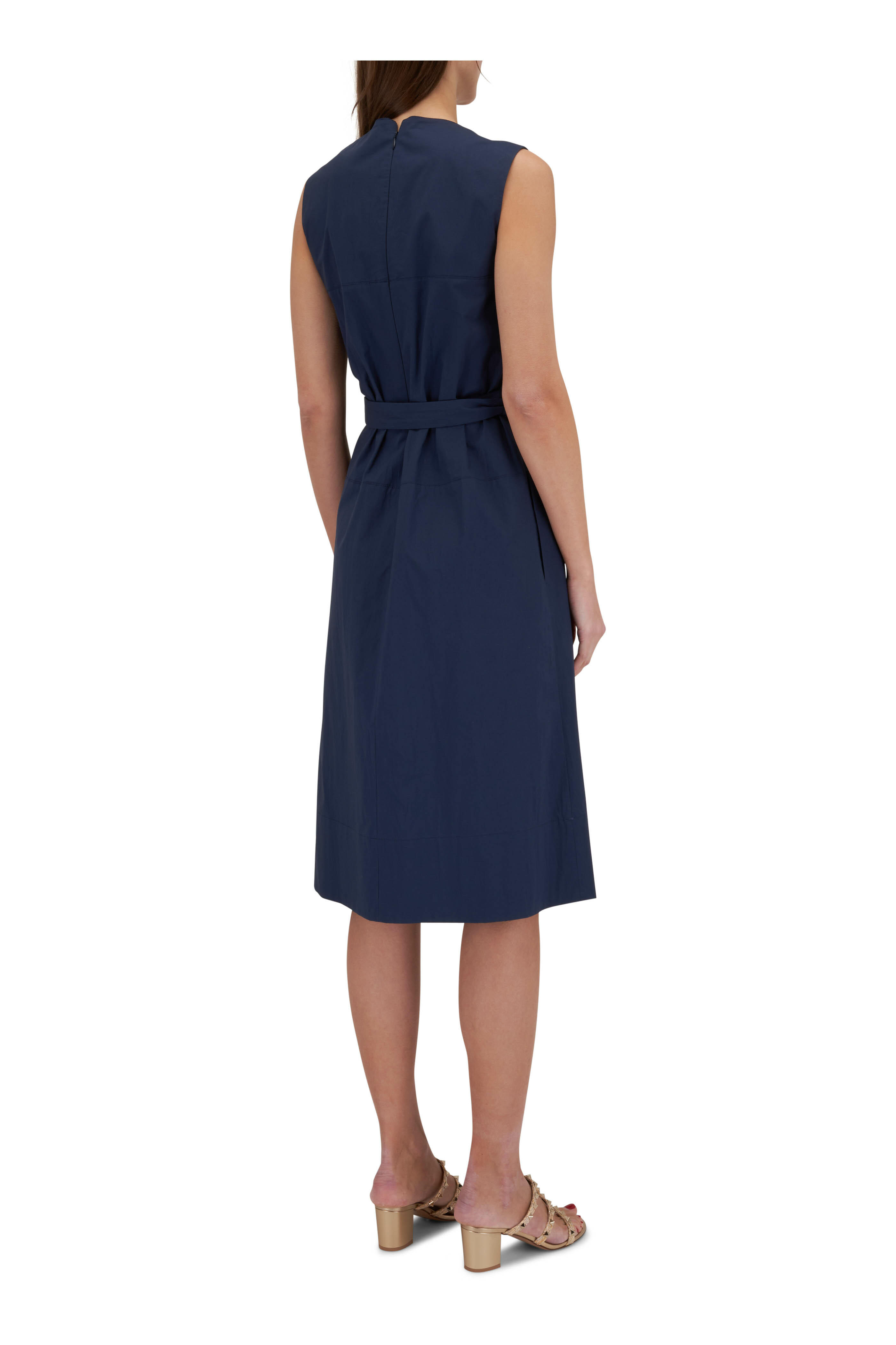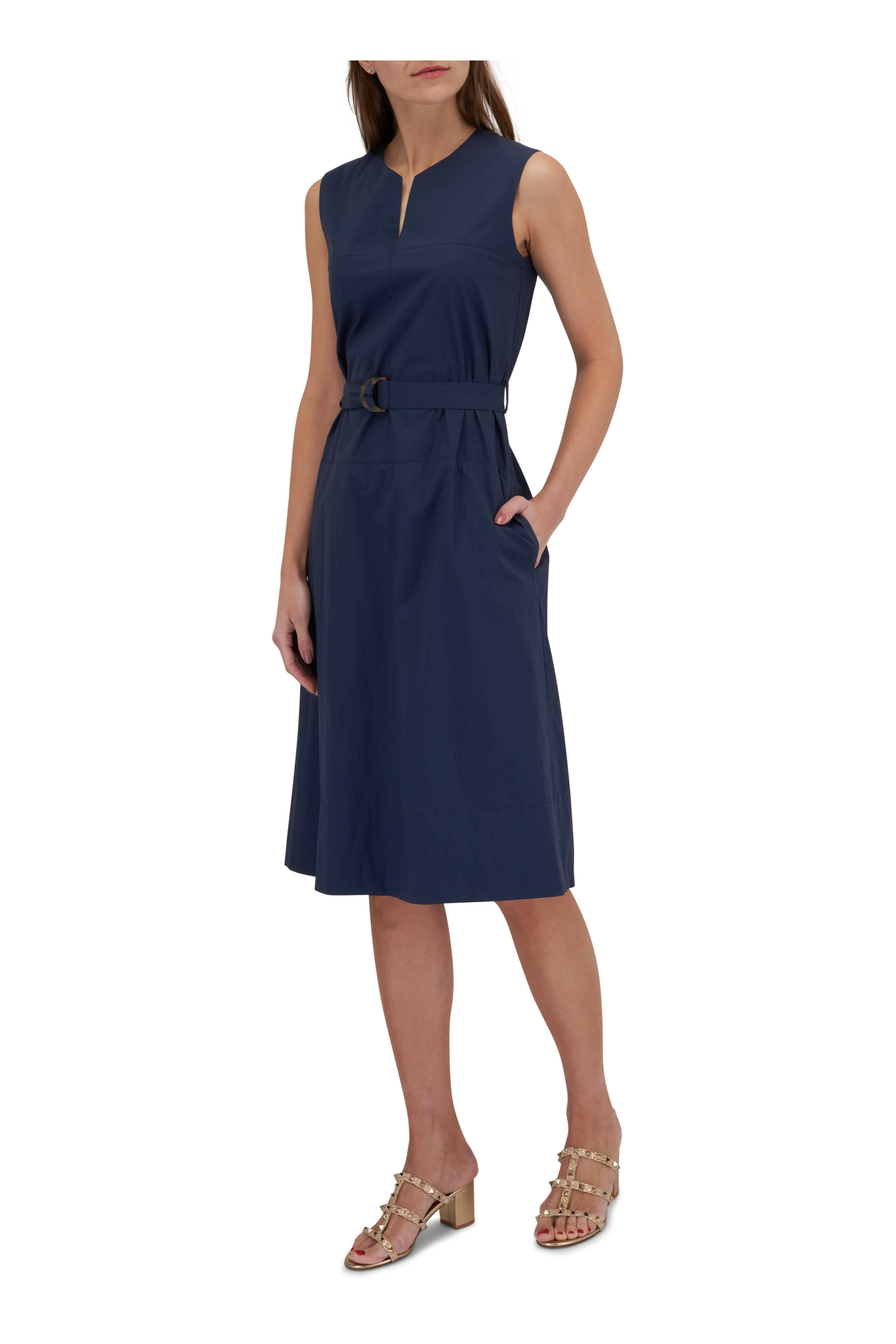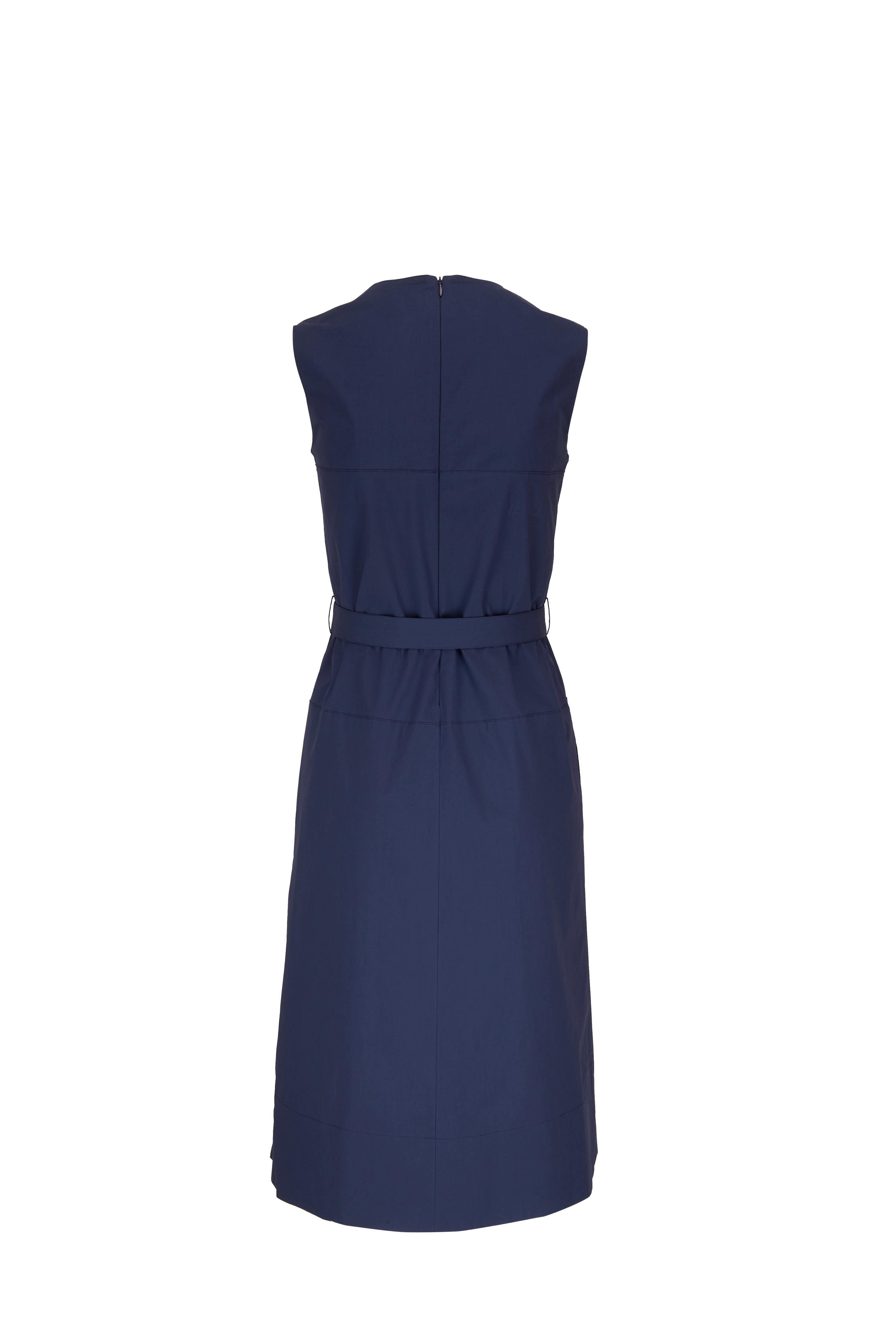 Split v-neckline. Concealed back zip. Self d-ring belt. On-seam pockets. Made in Italy. 95% cotton, 5% elastane. Hand wash.